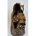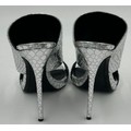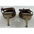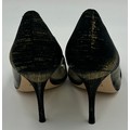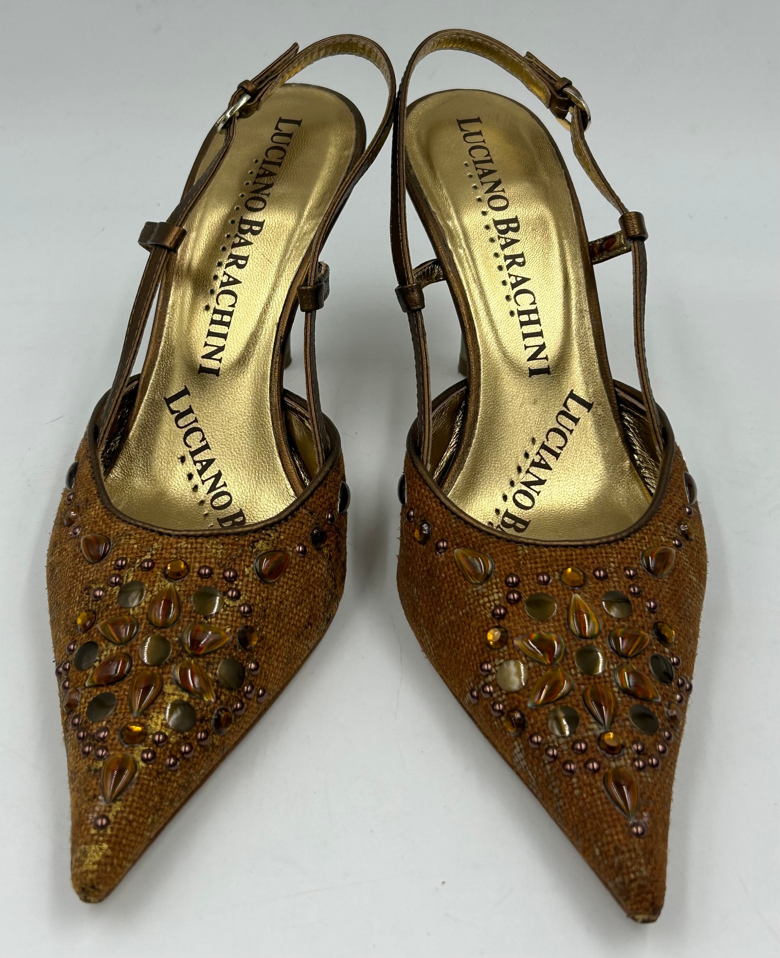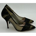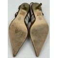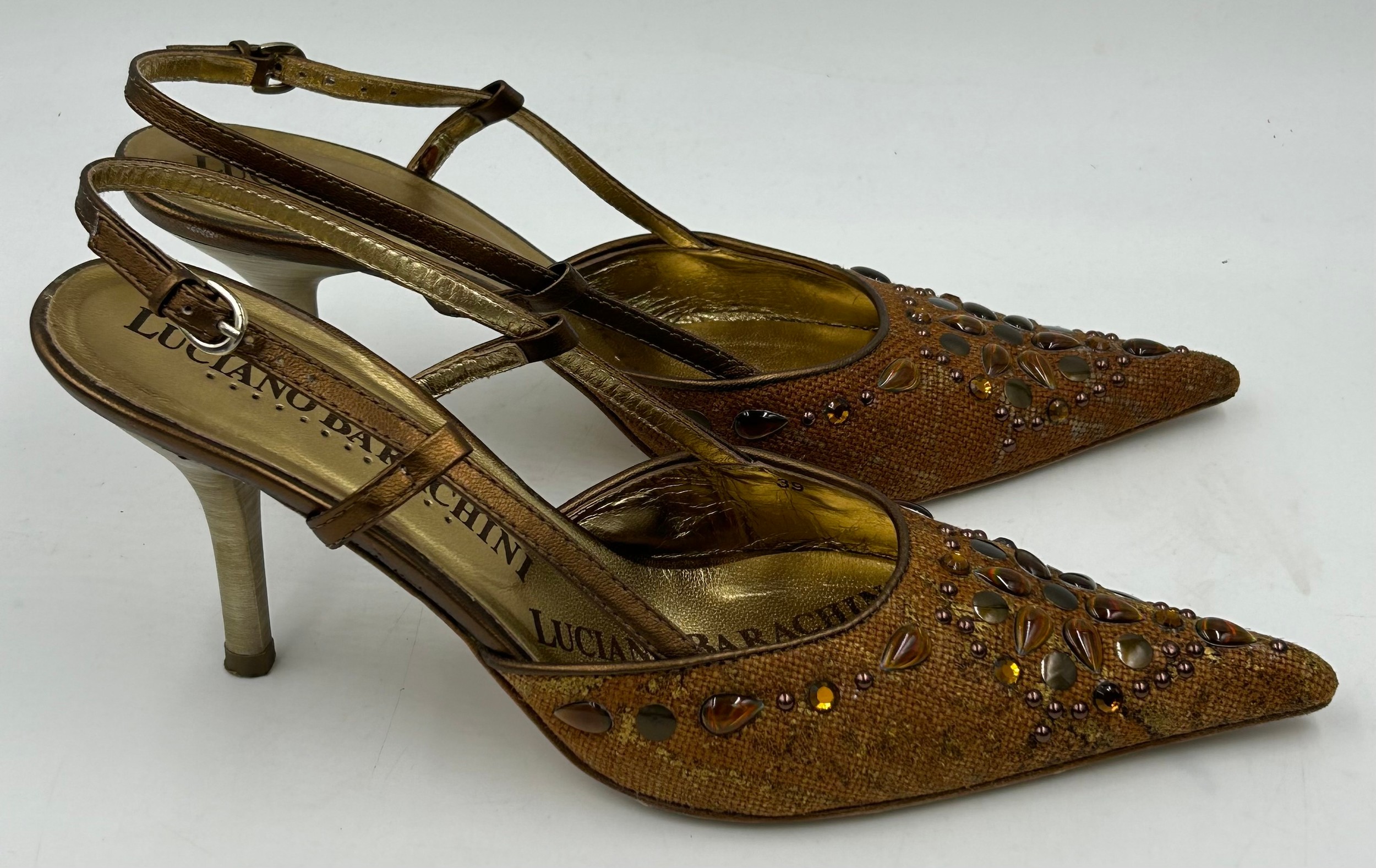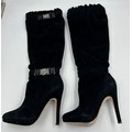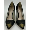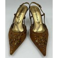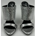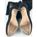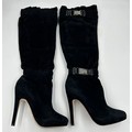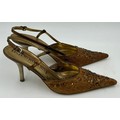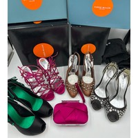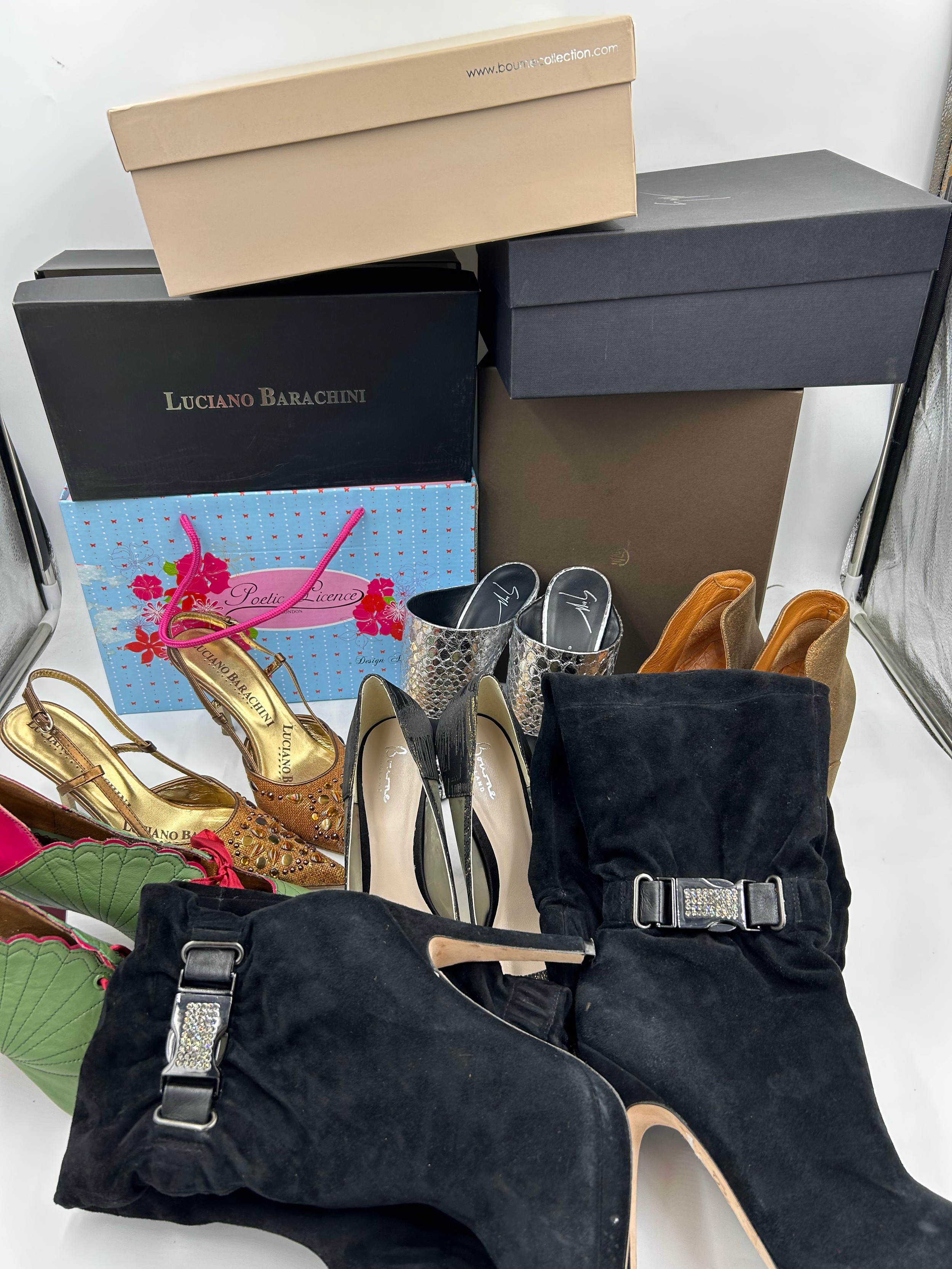 A collection of shoes to include Guiseppe Zanotti silver metallic mules size 39, Chie Mihara Erizo gloss bronze size 39, Poetic Licence Kiss and Tell Sapphire size 39, Luciano Barachini bronze jewelled sling backs size 39 with matching bag , Bourne black knee length adjustable suede boots size 40 and Bourne Monica black/gold shoes size 39. (7)