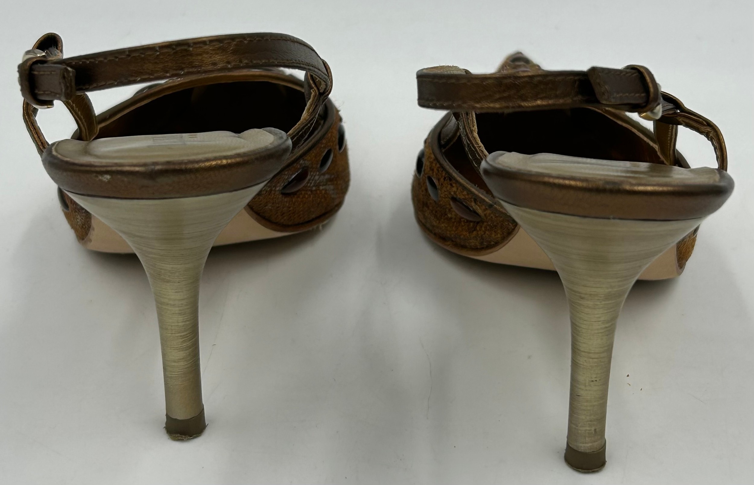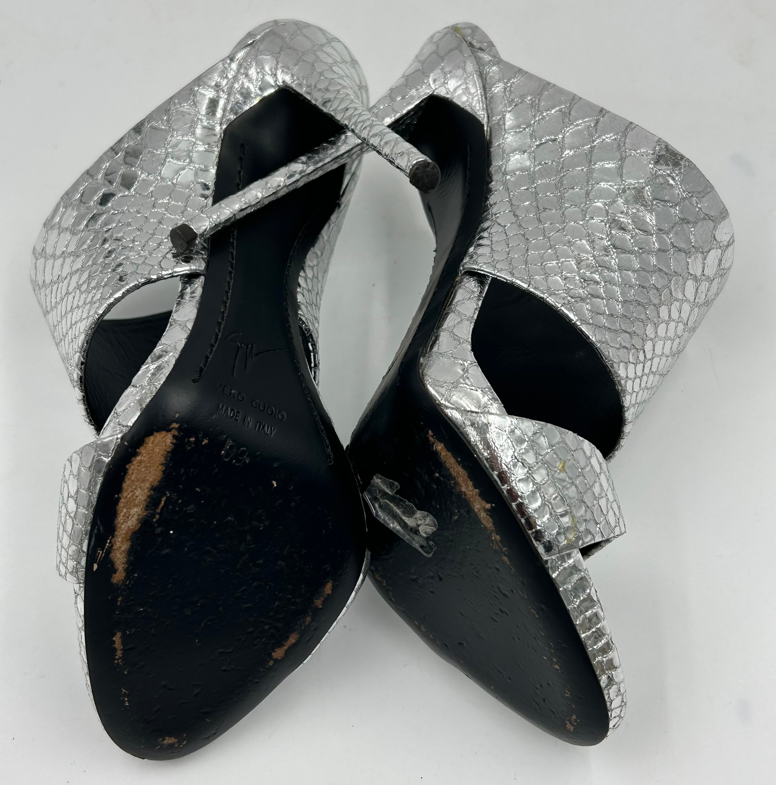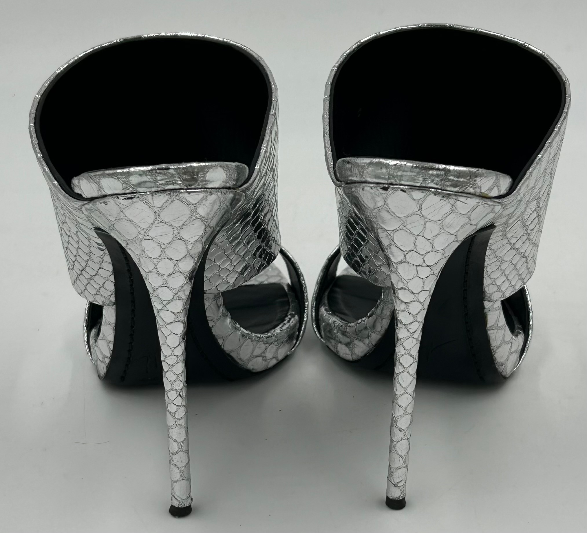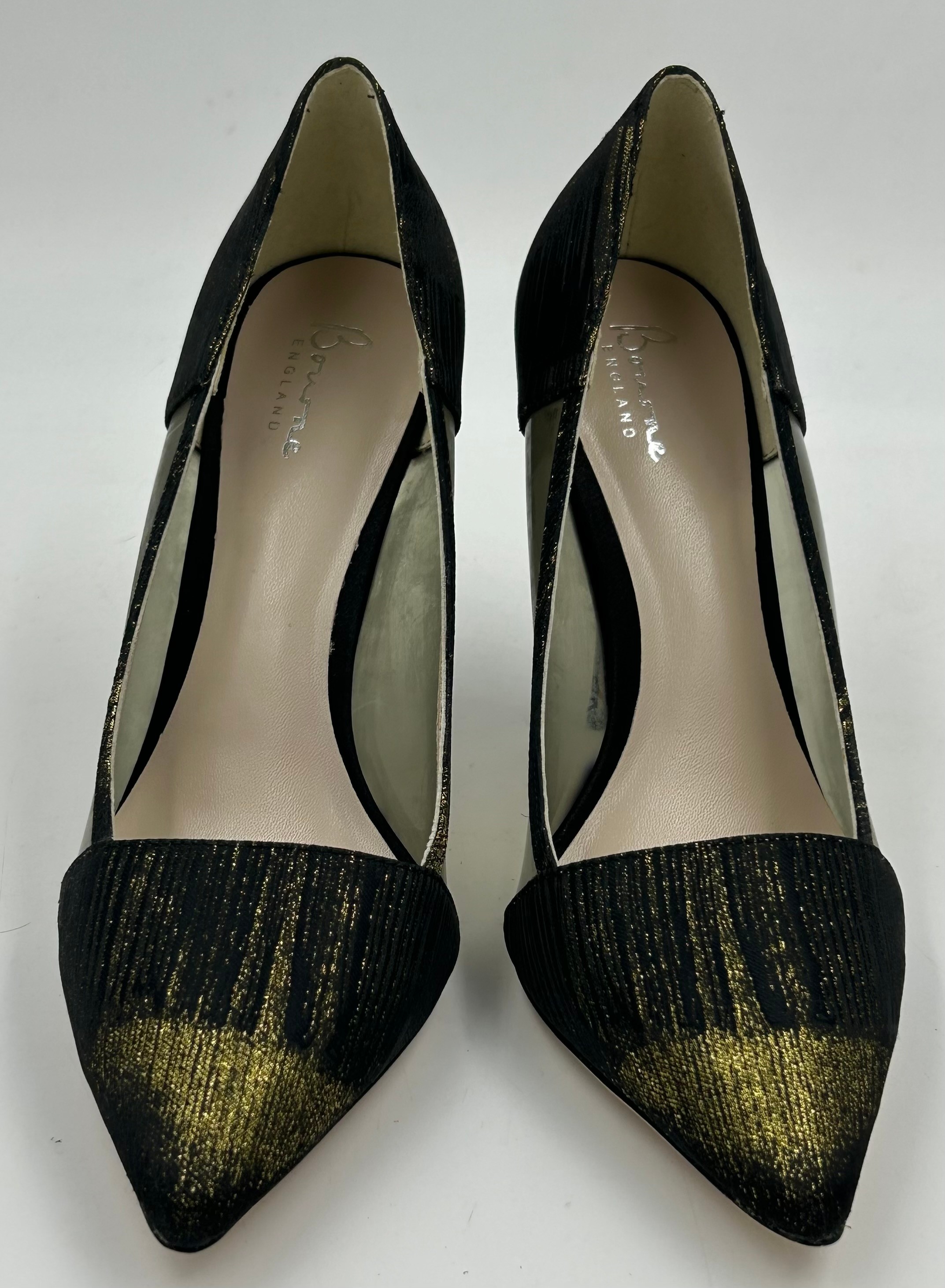 A collection of shoes to include Guiseppe Zanotti silver metallic mules size 39, Chie Mihara Erizo gloss bronze size 39, Poetic Licence Kiss and Tell Sapphire size 39, Luciano Barachini bronze jewelled sling backs size 39 with matching bag , Bourne black knee length adjustable suede boots size 40 and Bourne Monica black/gold shoes size 39. (7)