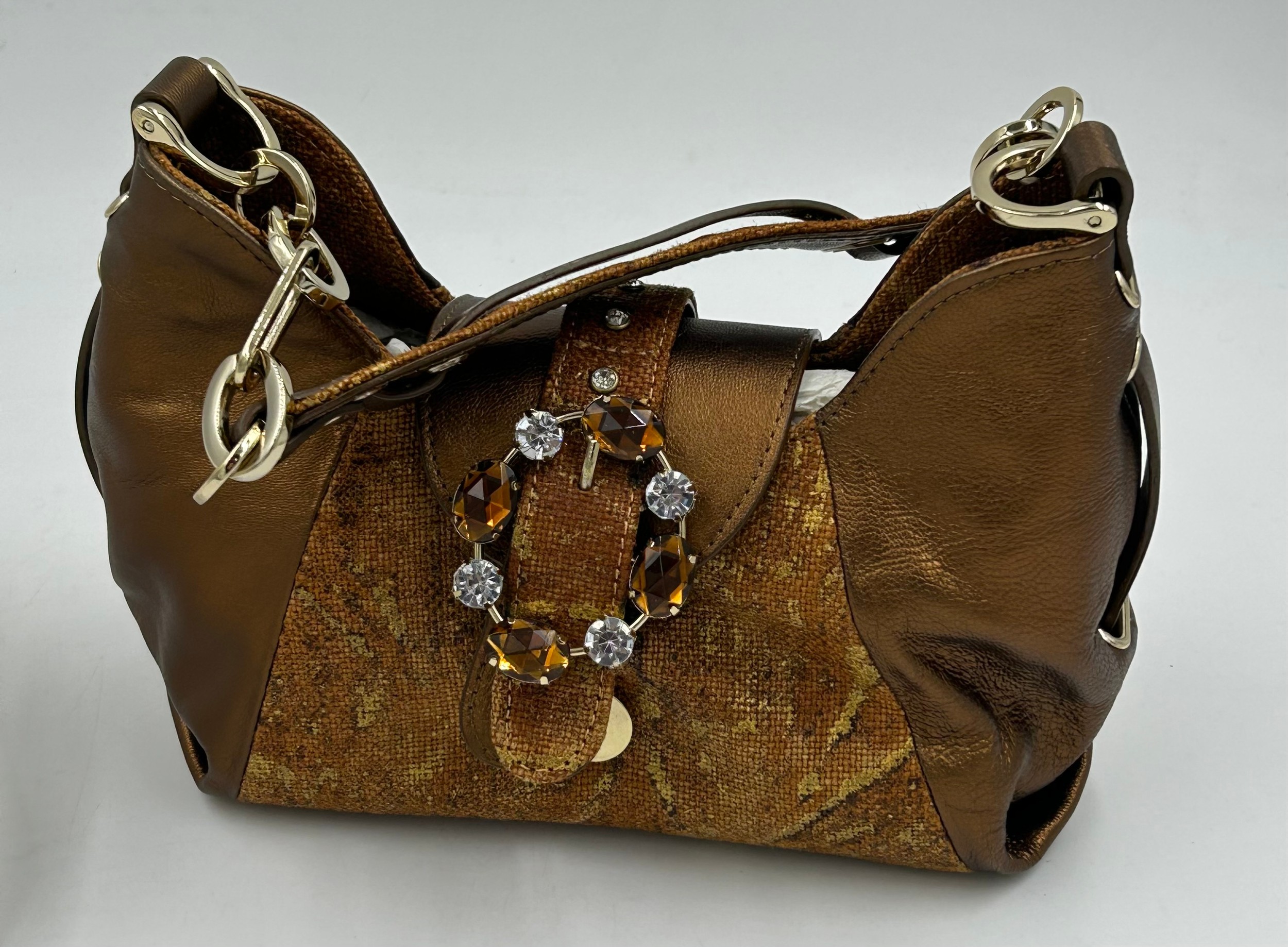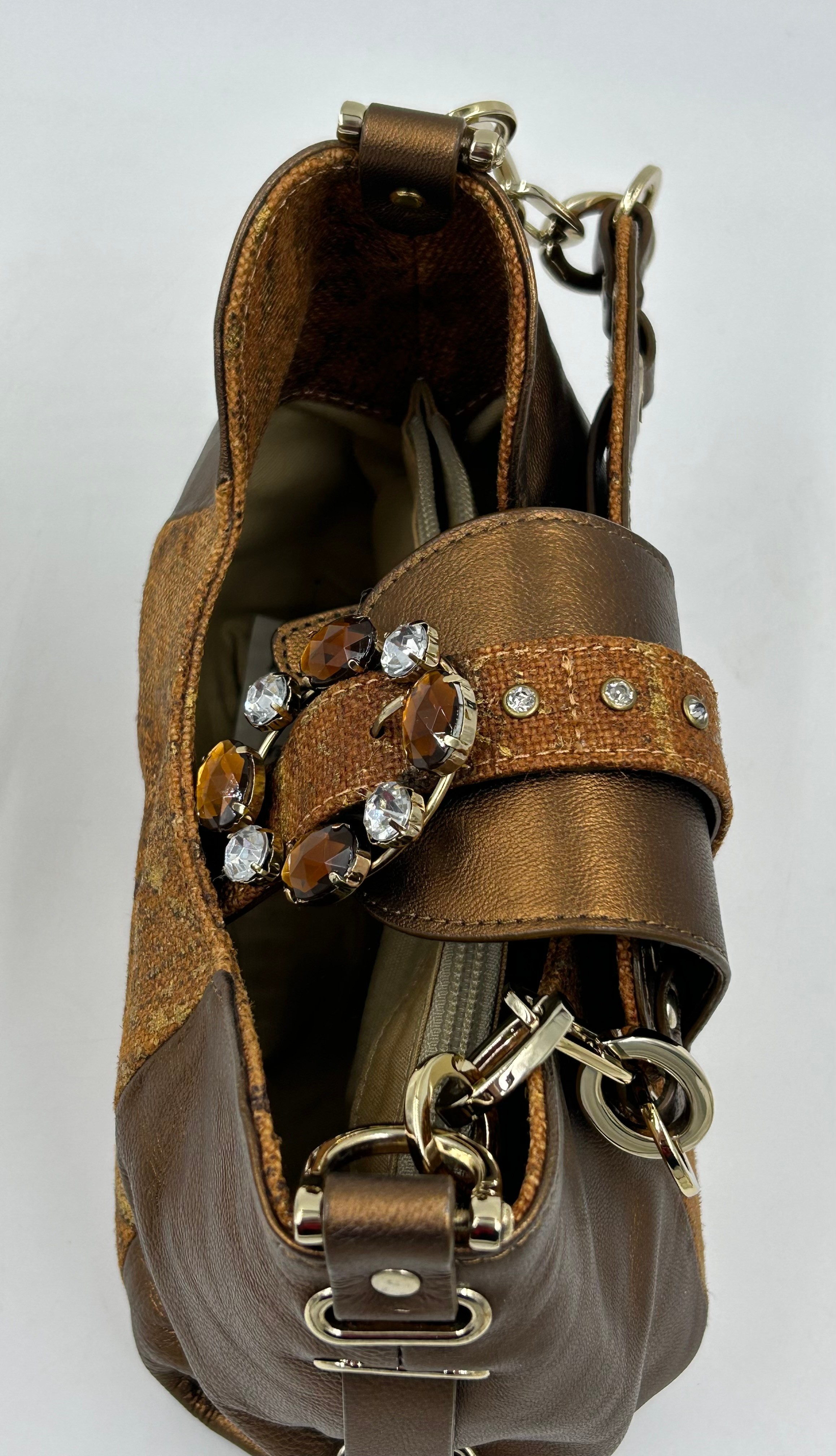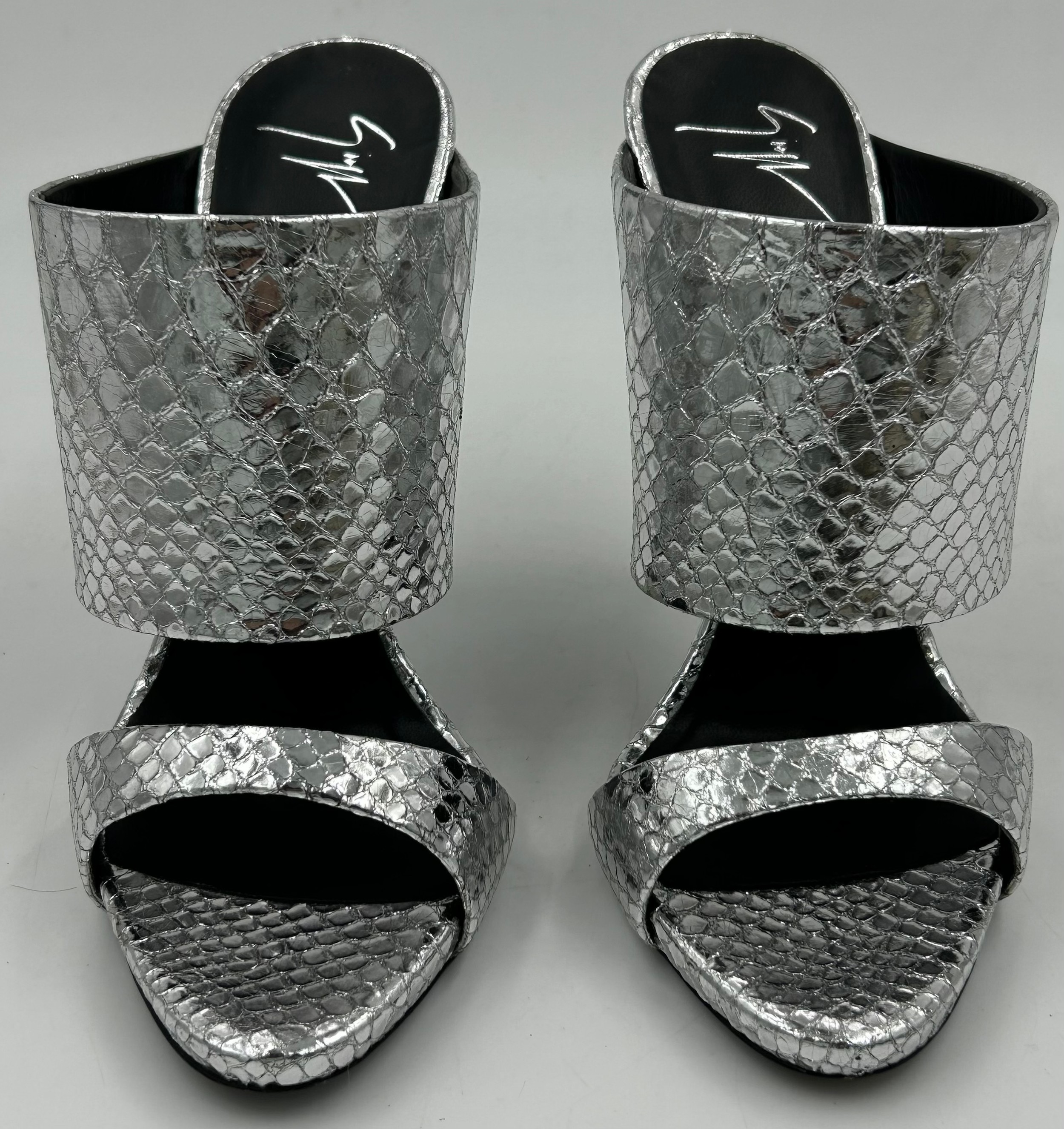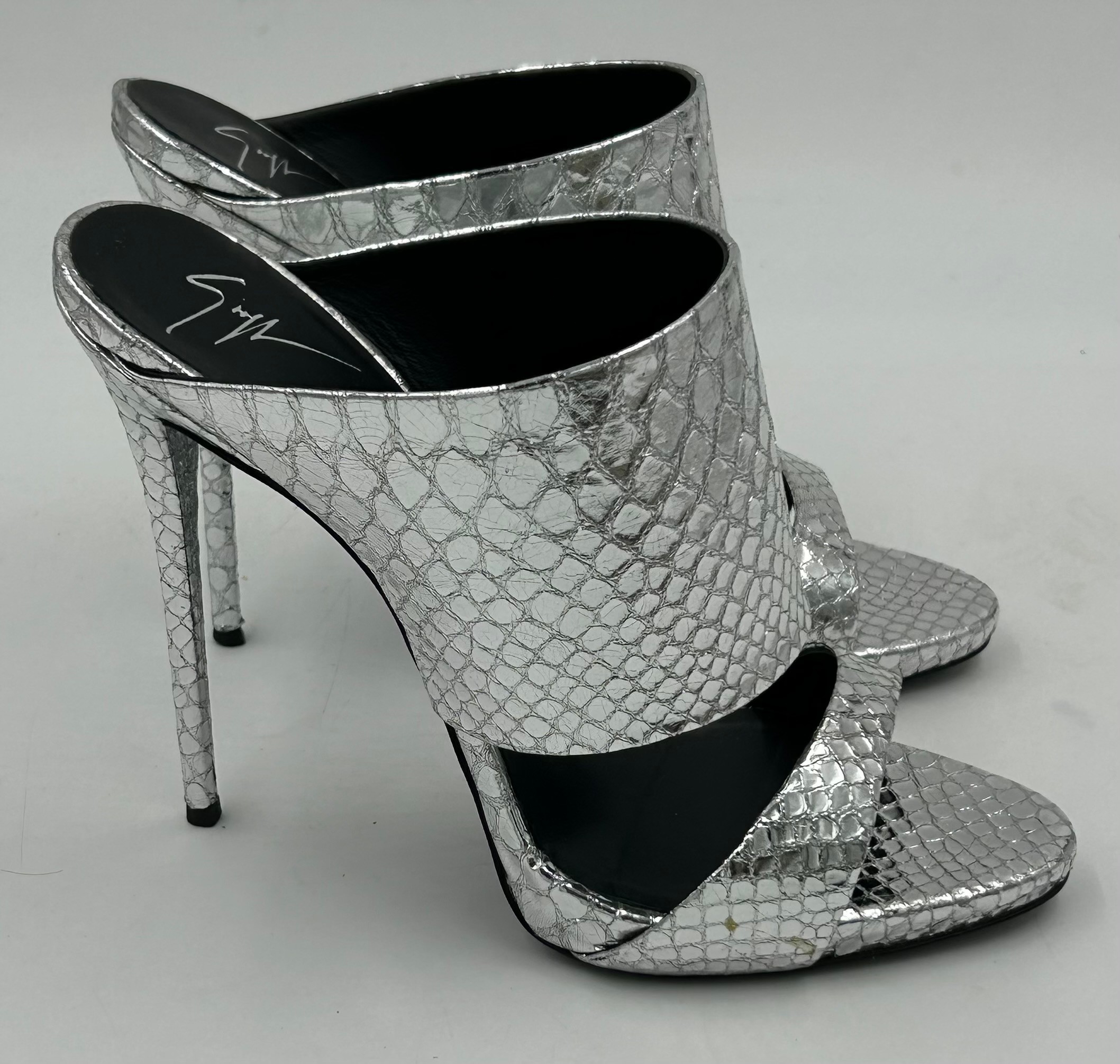 A collection of shoes to include Guiseppe Zanotti silver metallic mules size 39, Chie Mihara Erizo gloss bronze size 39, Poetic Licence Kiss and Tell Sapphire size 39, Luciano Barachini bronze jewelled sling backs size 39 with matching bag , Bourne black knee length adjustable suede boots size 40 and Bourne Monica black/gold shoes size 39. (7)