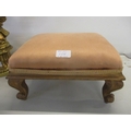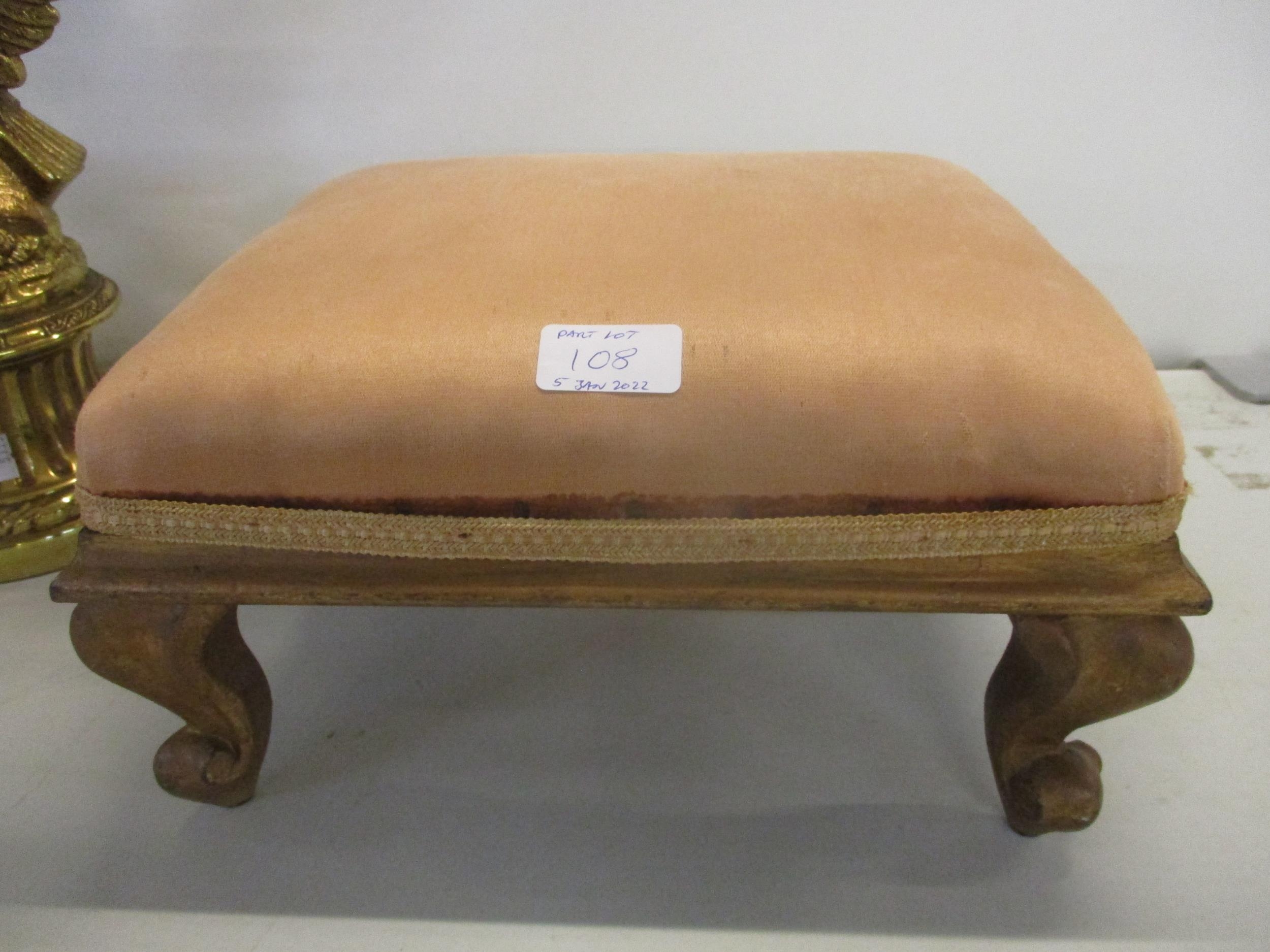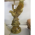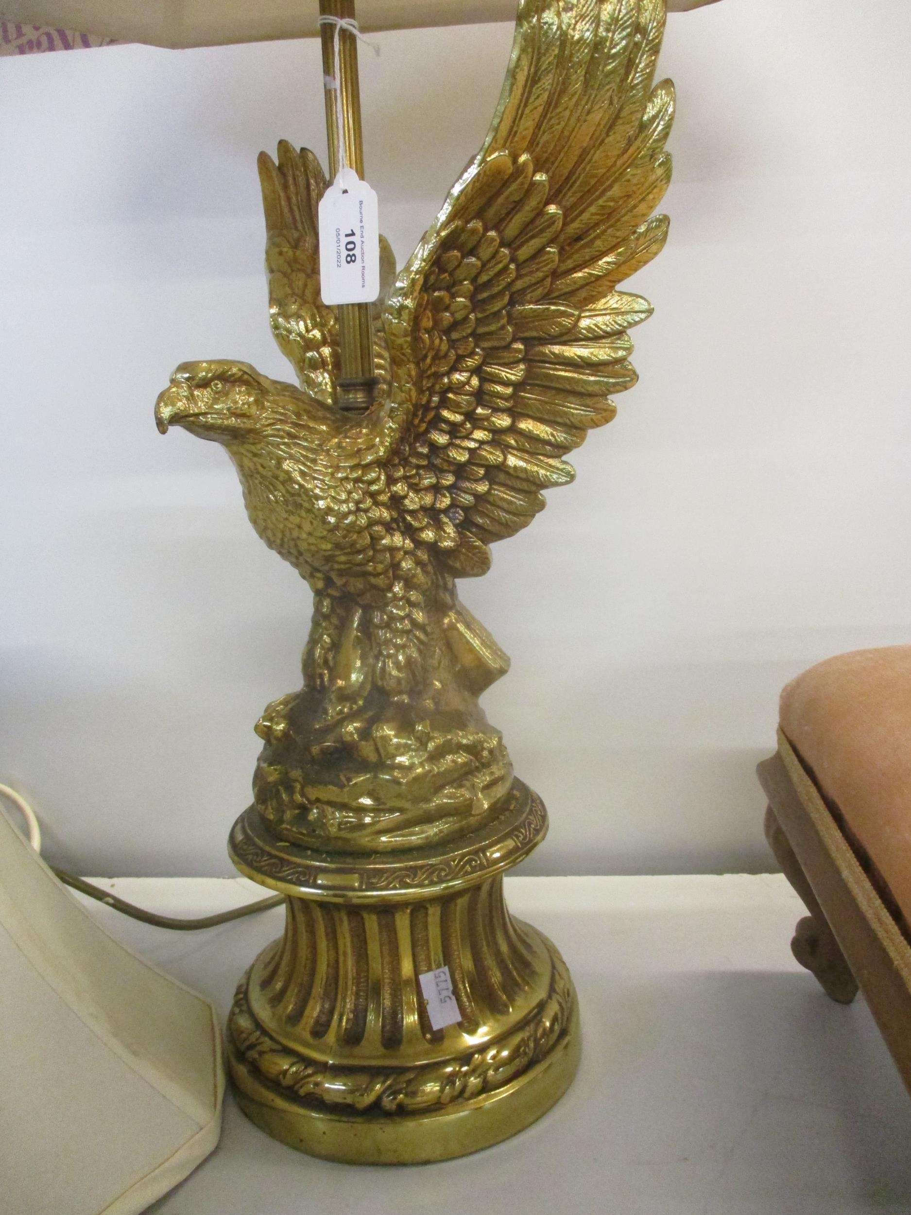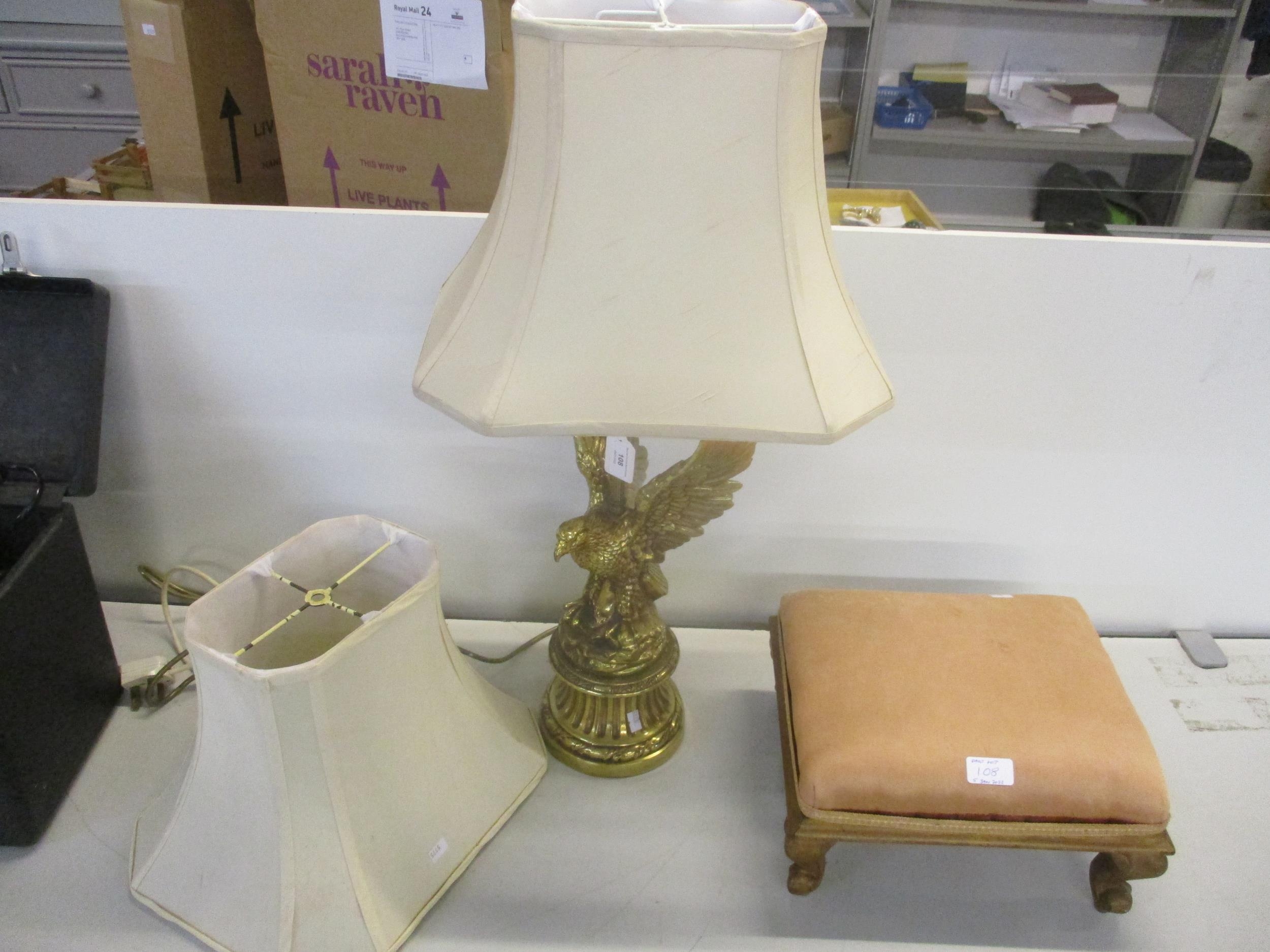 A brass coloured table lamp in the form of an eagle with outstretched wings, perched on a rocky base, with shades and a gilt wood upholstered stool on short cabriole legs