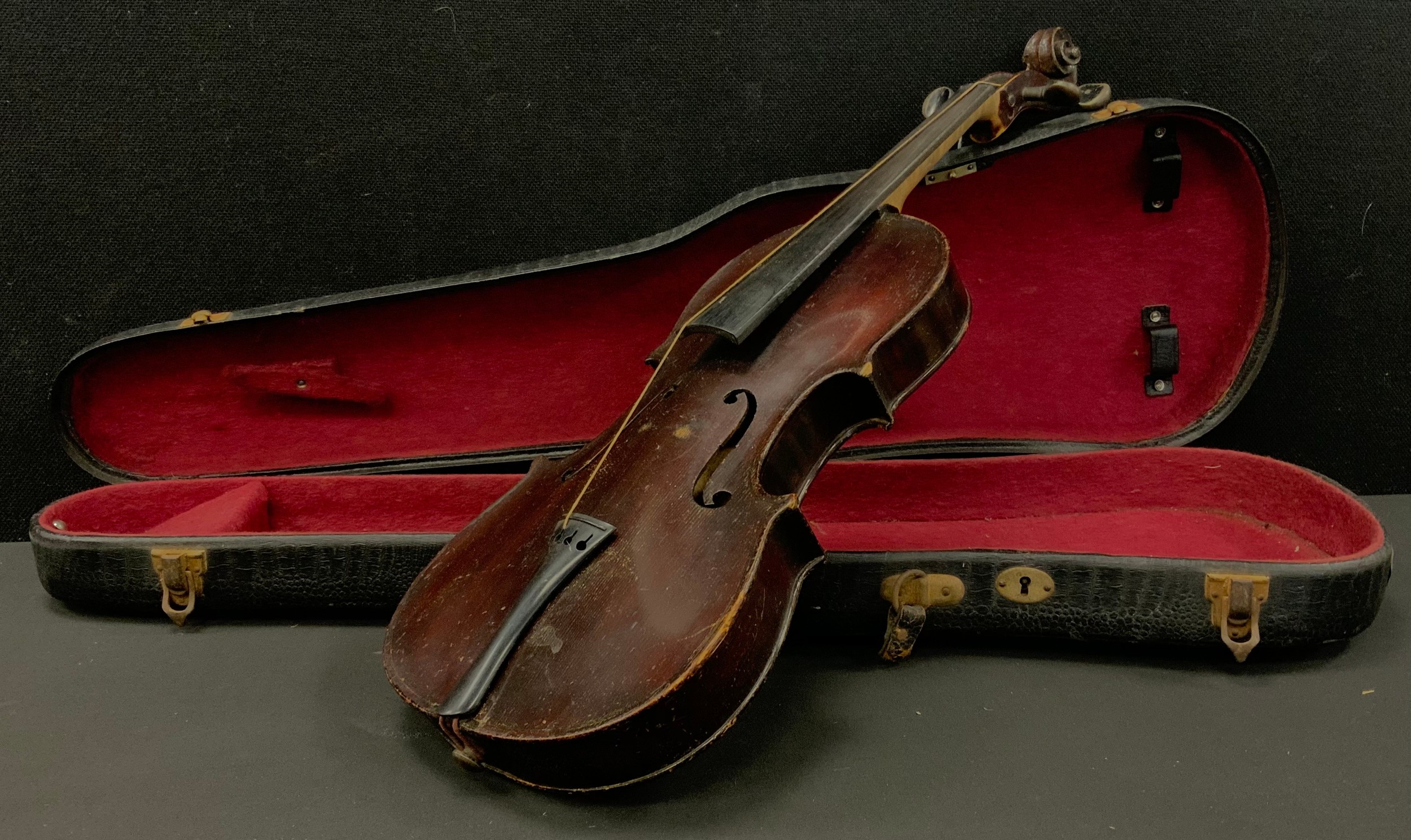 Musical instruments - A German 3/4 size Violin, Stradivarius copy, early 20th century, the two-piece well figured back measuring 34.5cm, and 56cm overall, cased.