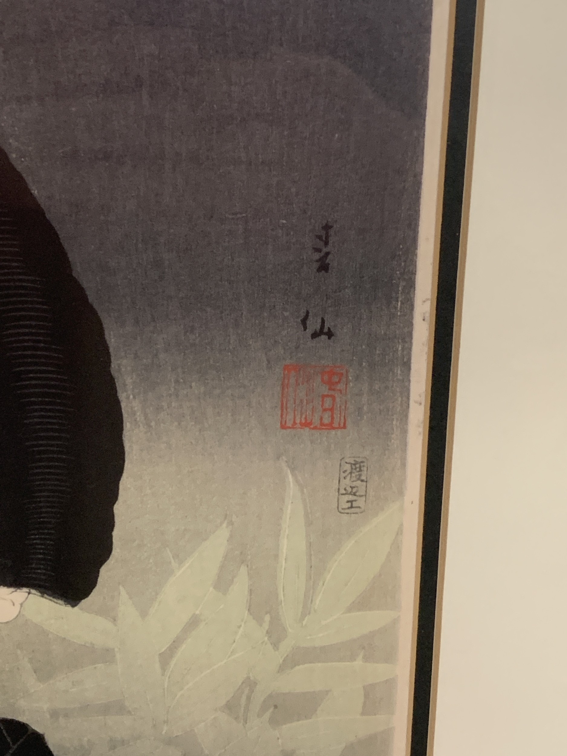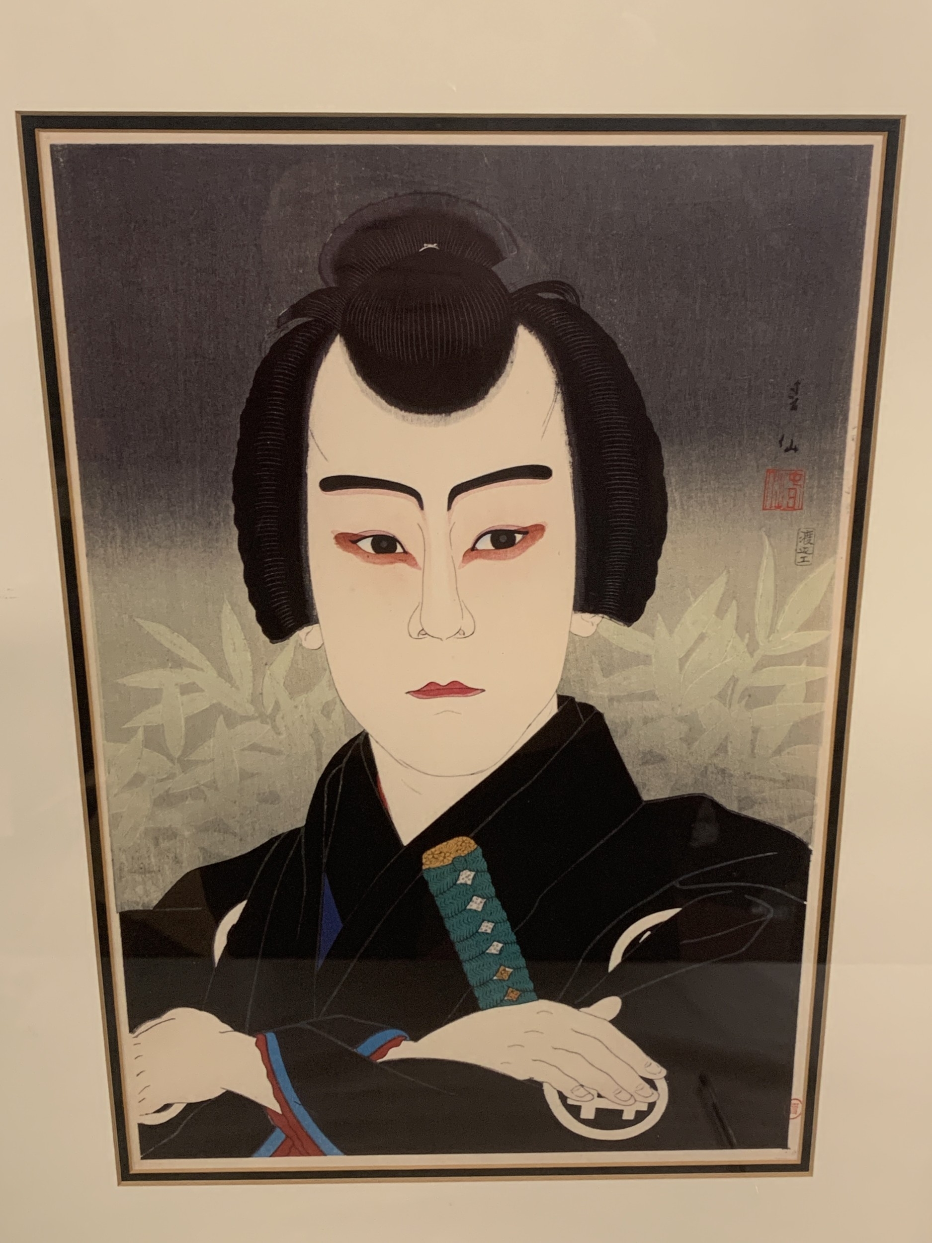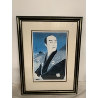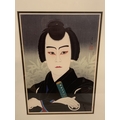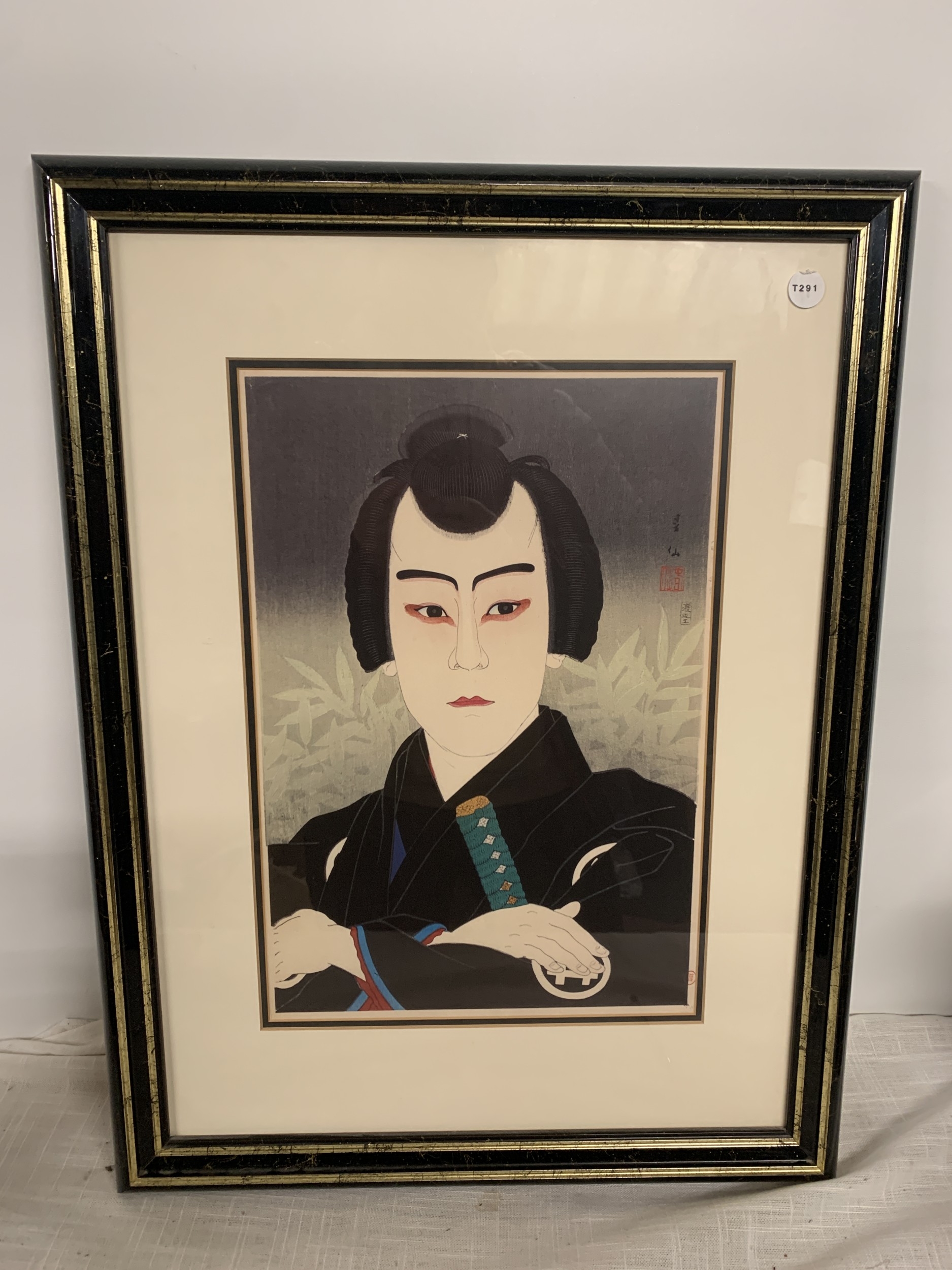 A FRAMED JAPANESE WOODBLOCK PRINT BY ARTIST NATORI SHUNSEN TITLED "ACTOR ICHIKAWA SUMIZO VI SHIRAI GONPACHI" - 61 X 46 CM TO INCLUDE THE FRAME