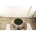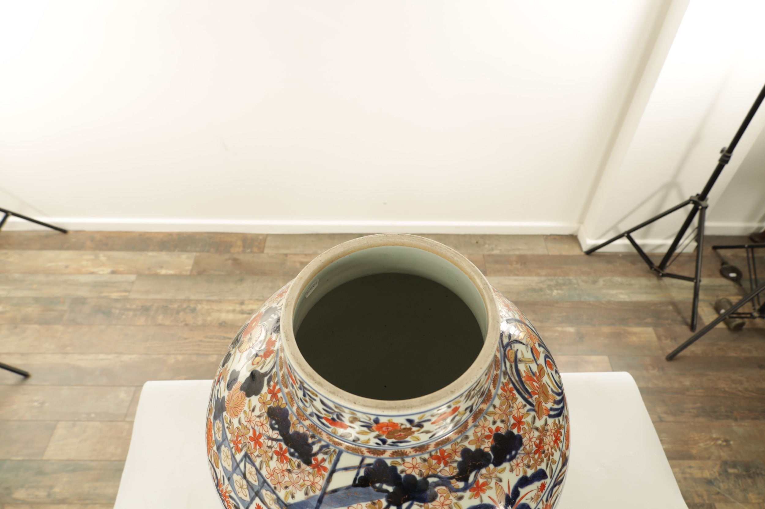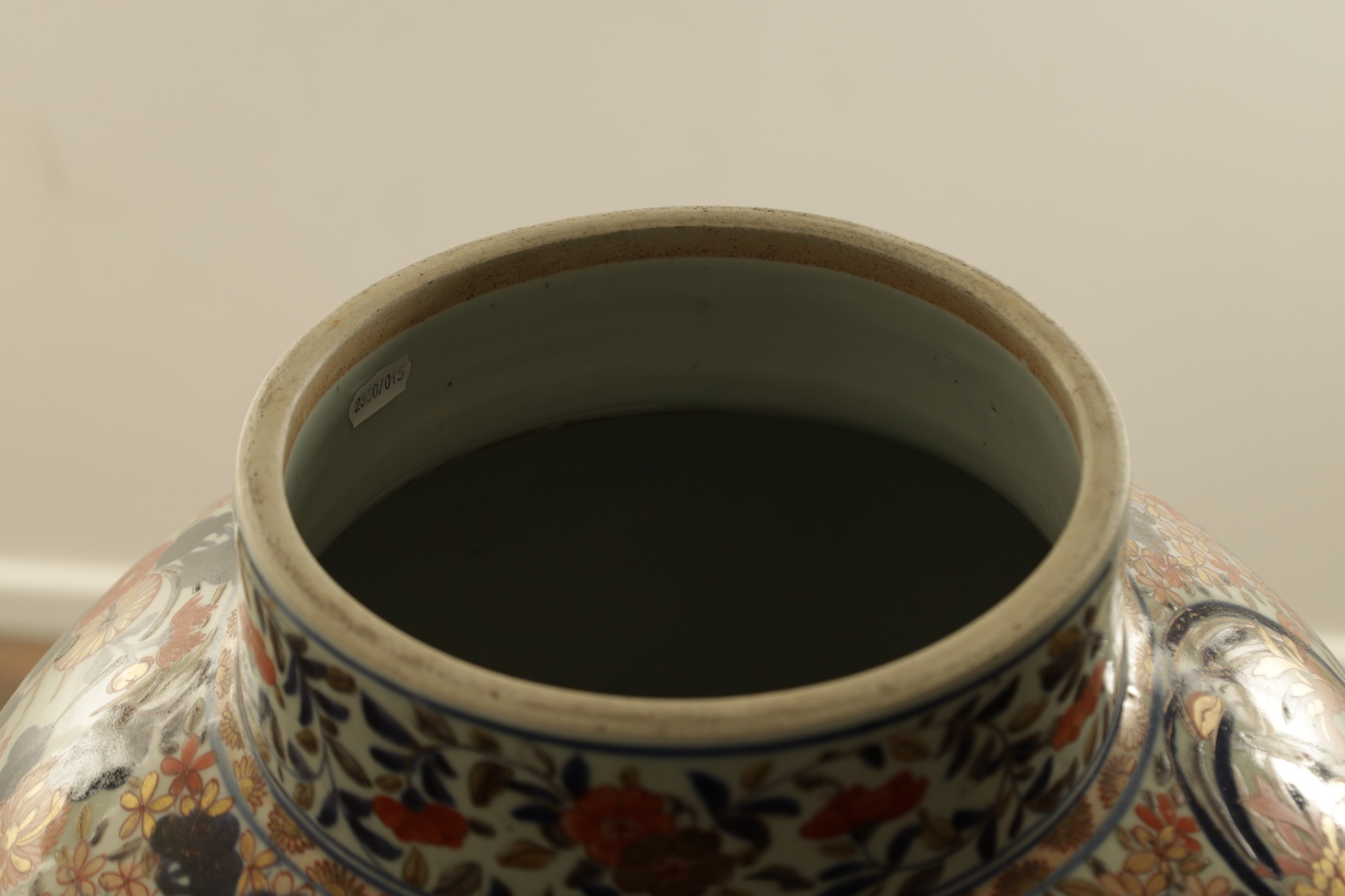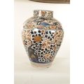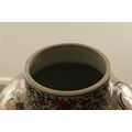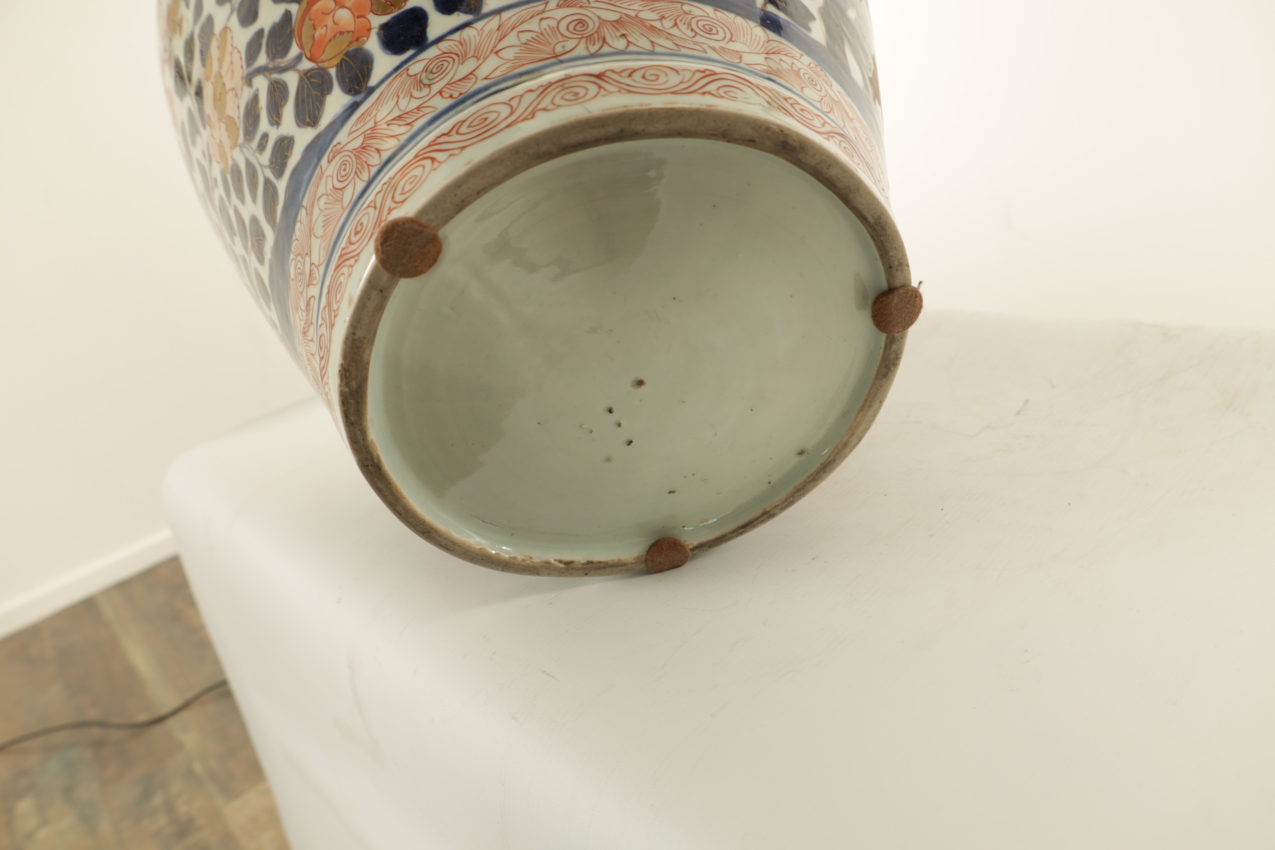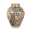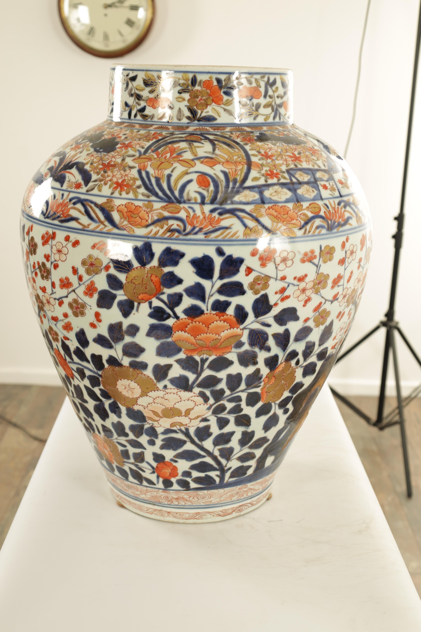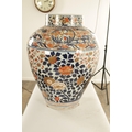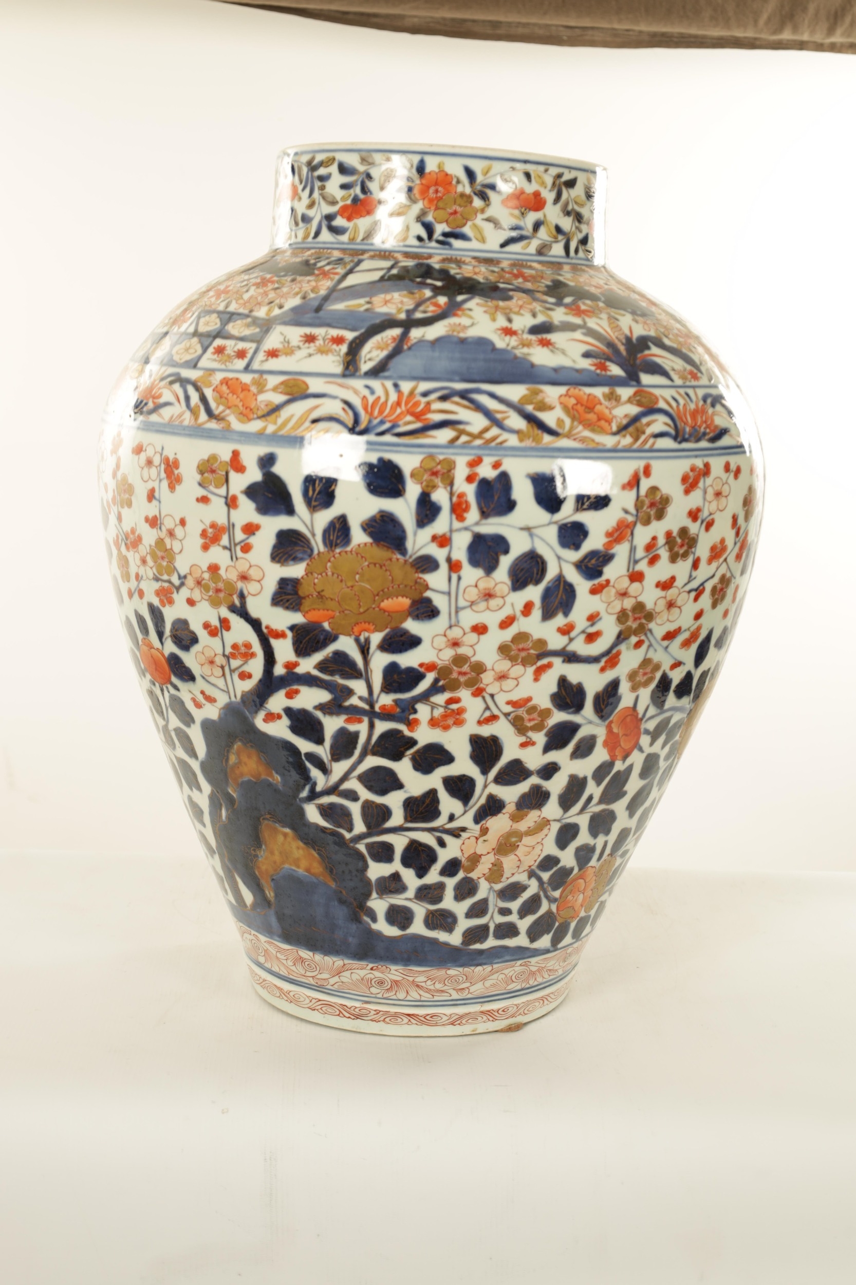 AN OVERSIZED 17TH/18TH CENTURY JAPANESE IMARI HALL VASE the shouldered ovoid body richly decorated with blooming chrysanthemum and blossoming sprays beneath banded panelled floral and landscape panels to the neck highlighted in gilding. (57cm high)