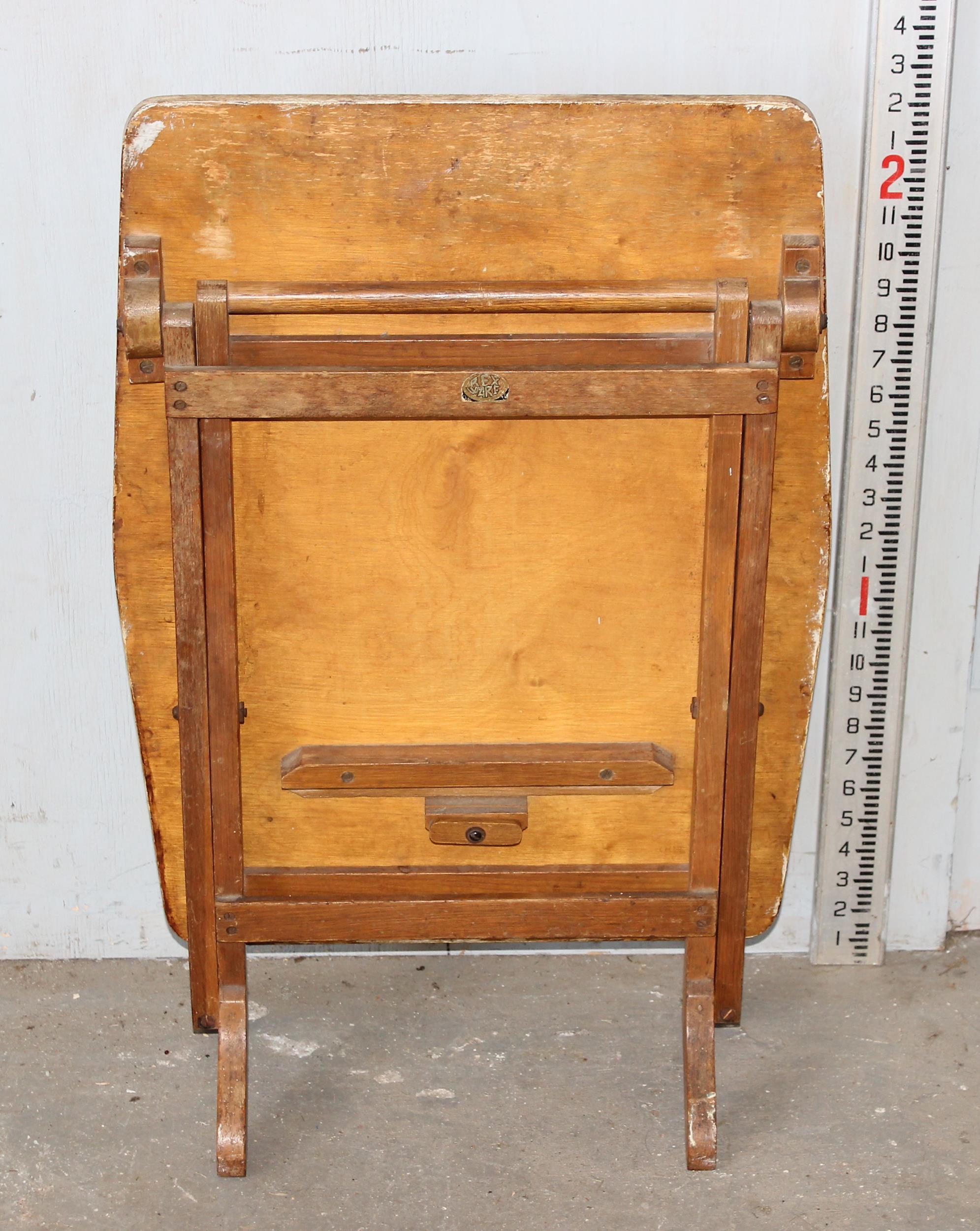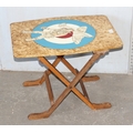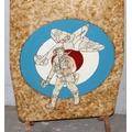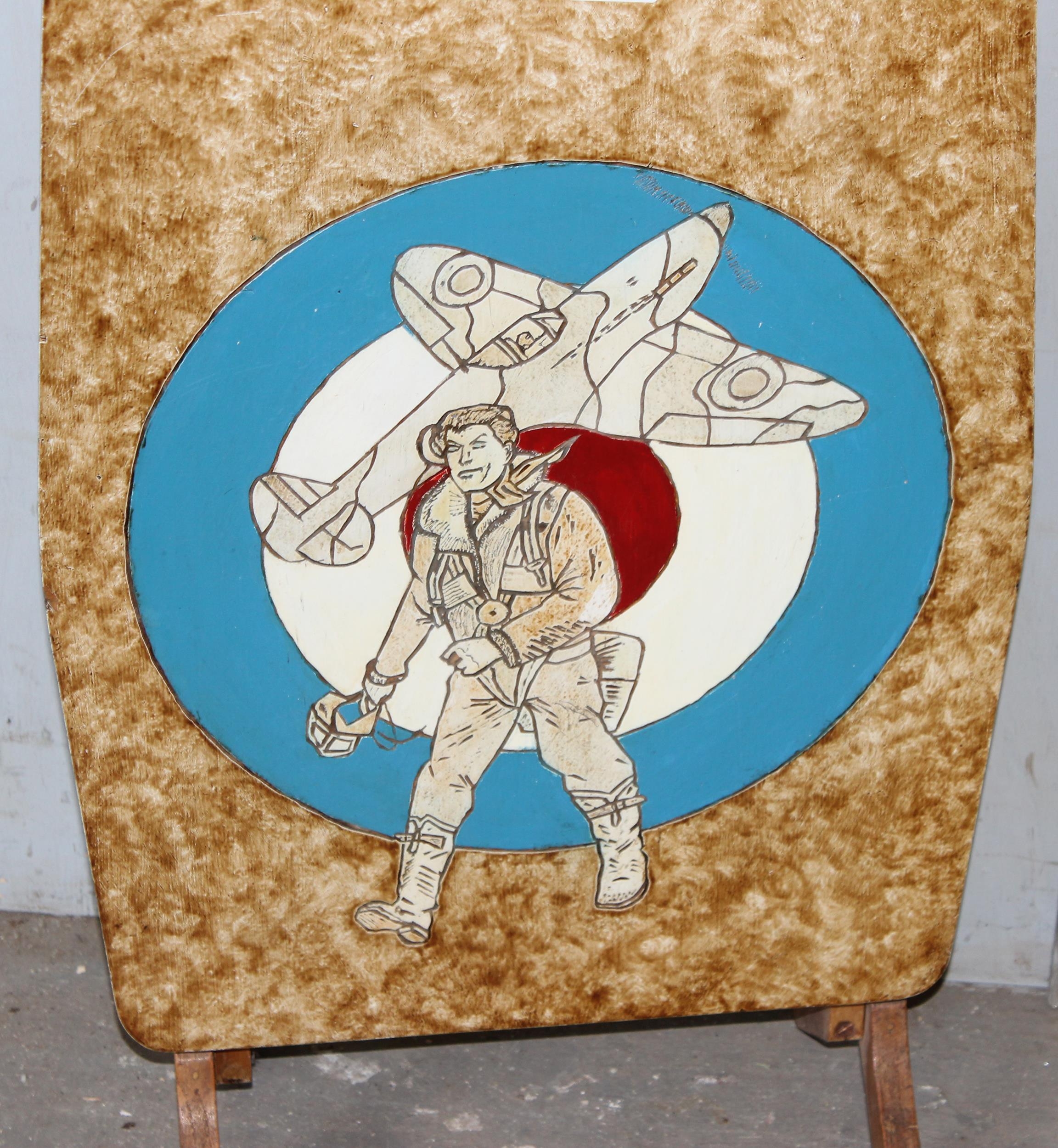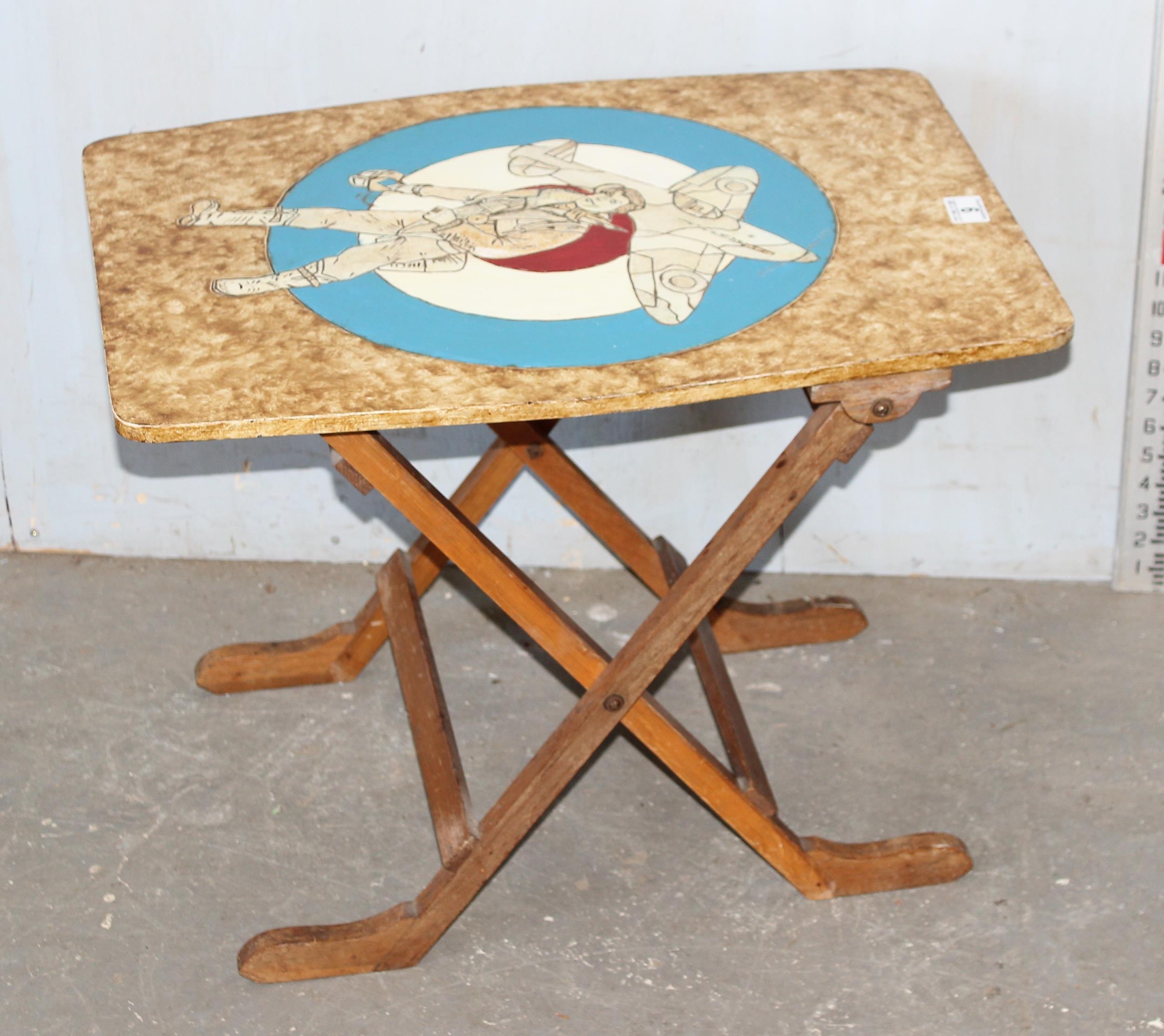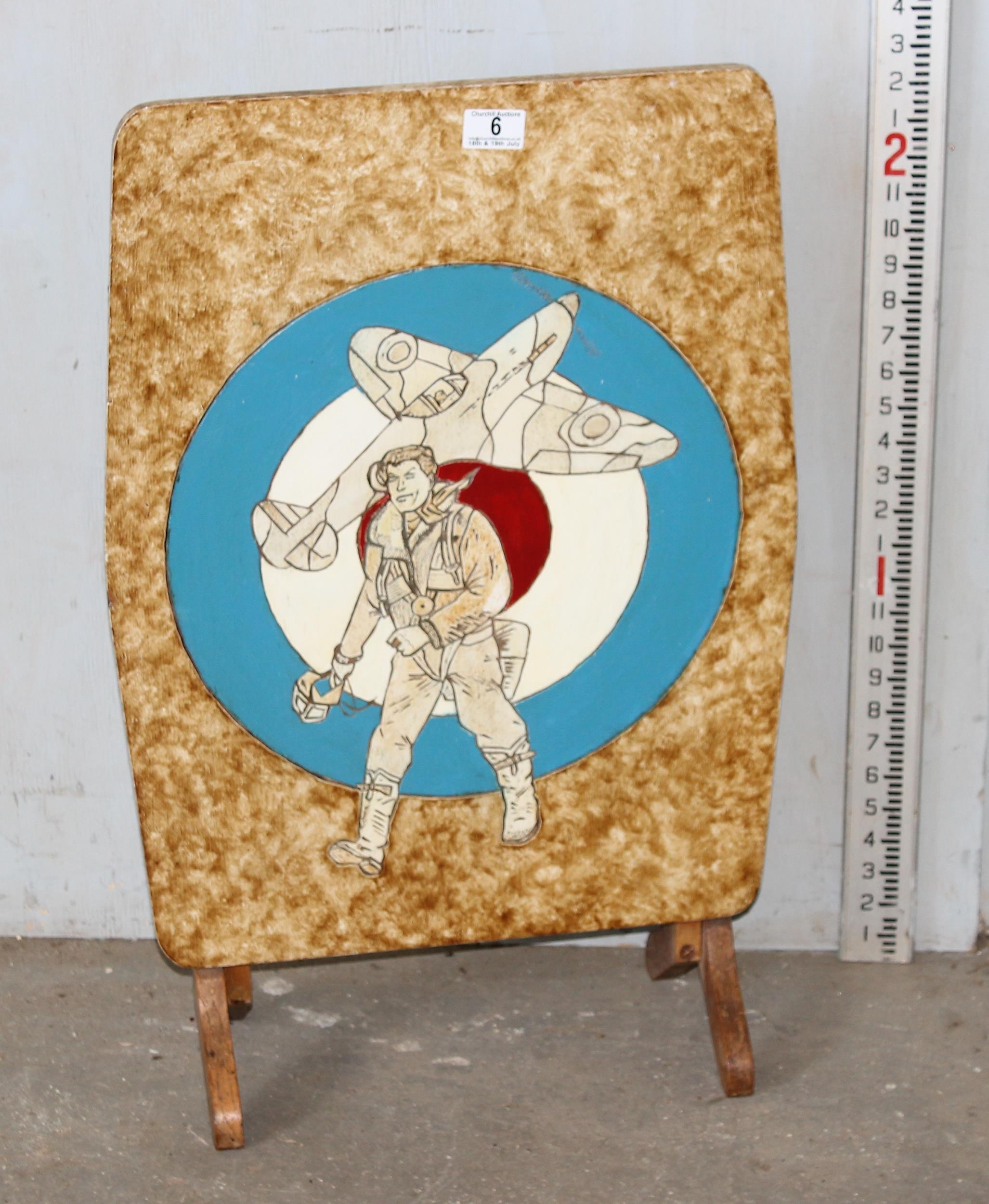 An unusual vintage folding table or fire screen with painted and carved details of RAF roundel, pilot and plane, Rex Warf label
