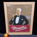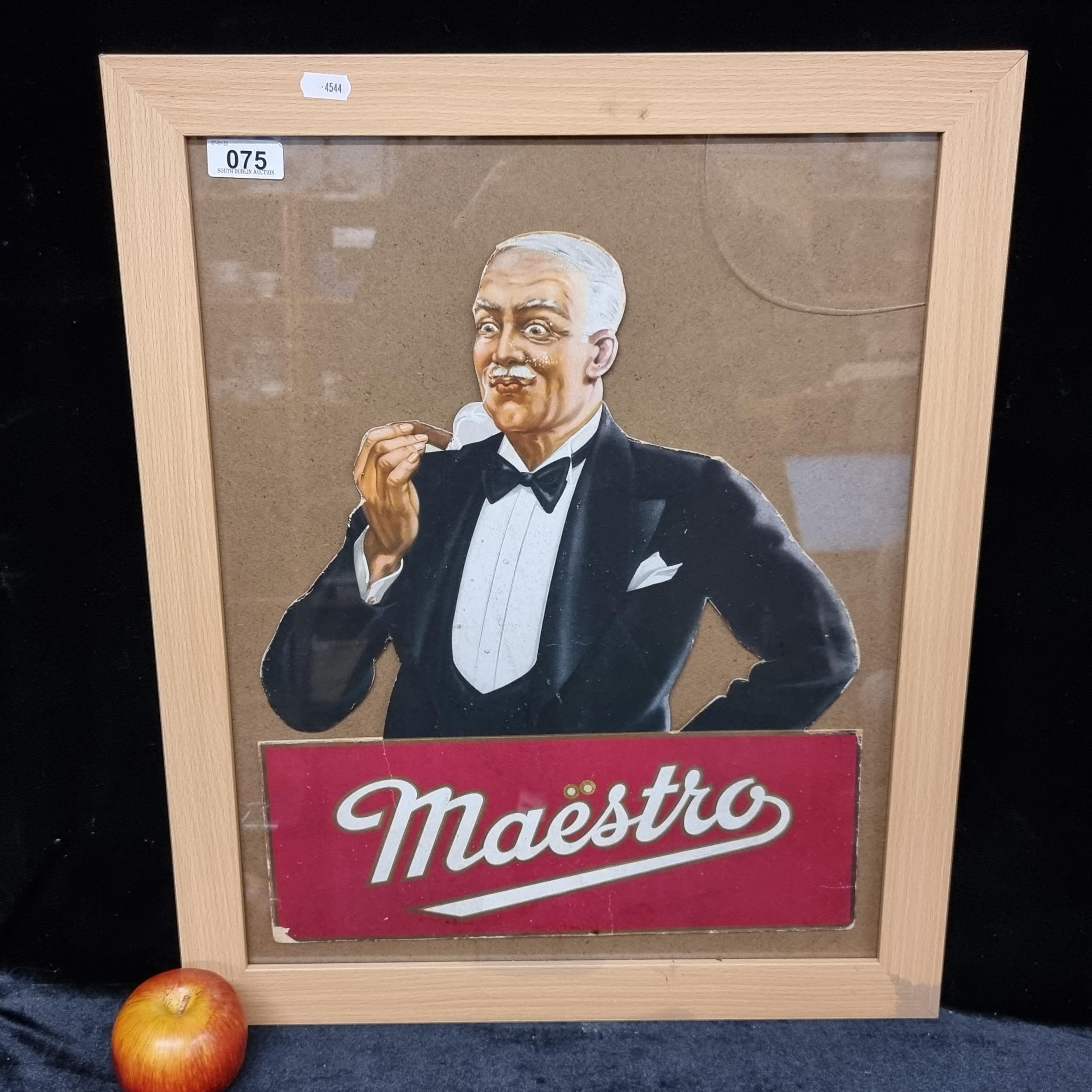 A Very rare good sized vintage original cut out advertisement for Maestro cigars from the 1930's showing a well dressed man holding a cigar. Frame has crack to Glass.