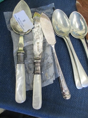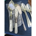 6 PIECES OF SILVERPLATE CUTLERY (2 WITH MOTHER OF PEARL HANDLES