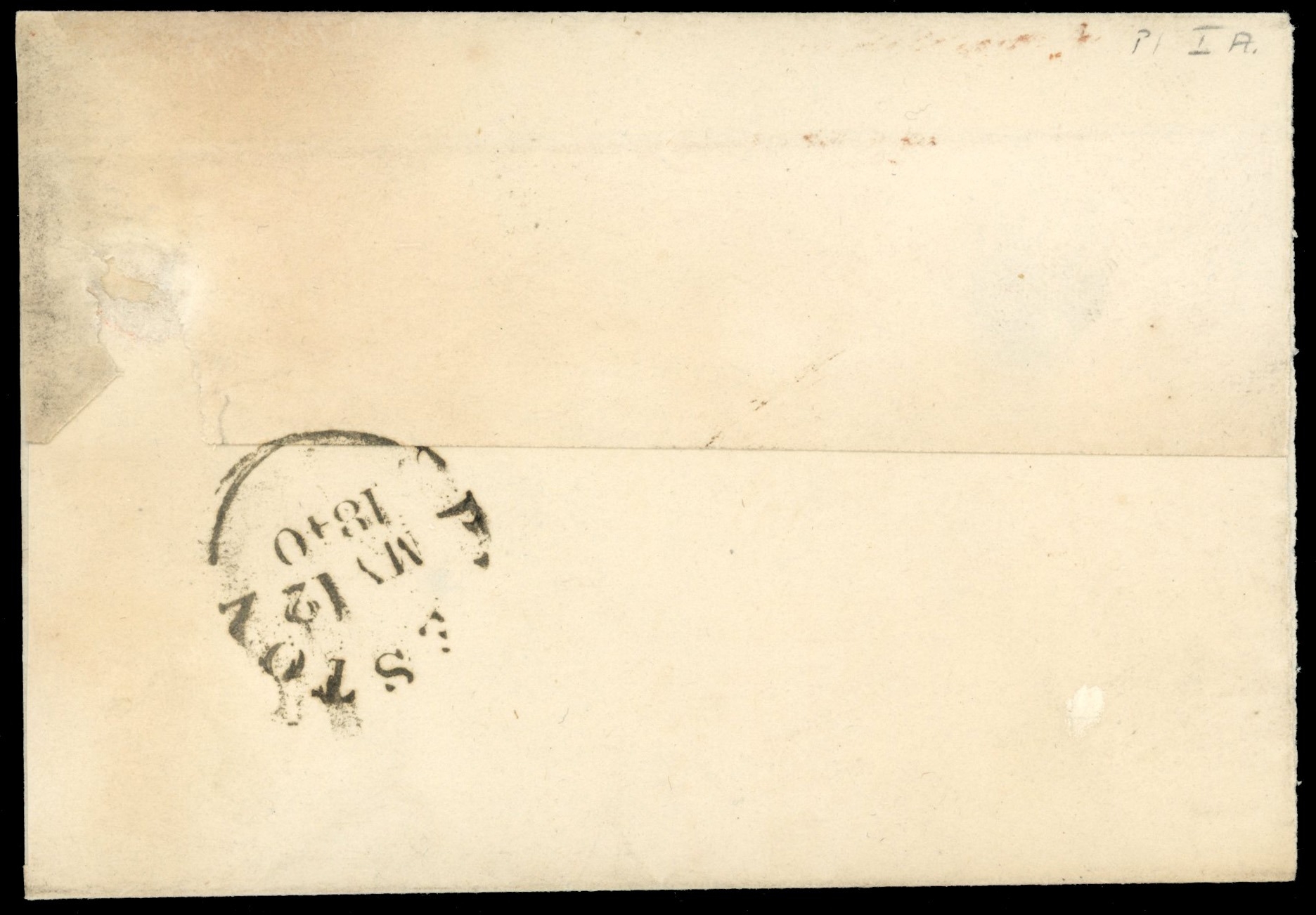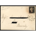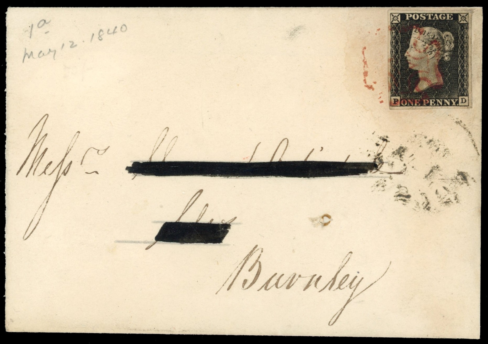 1840 1d black, plate 1a (PD), close to large margins, used on large part cover (part of address crossed out) to Burnley tied by red Maltese cross, backstamped with Preston despatch for â??MY 12/1840â??. Fair. SG 2, Spec
