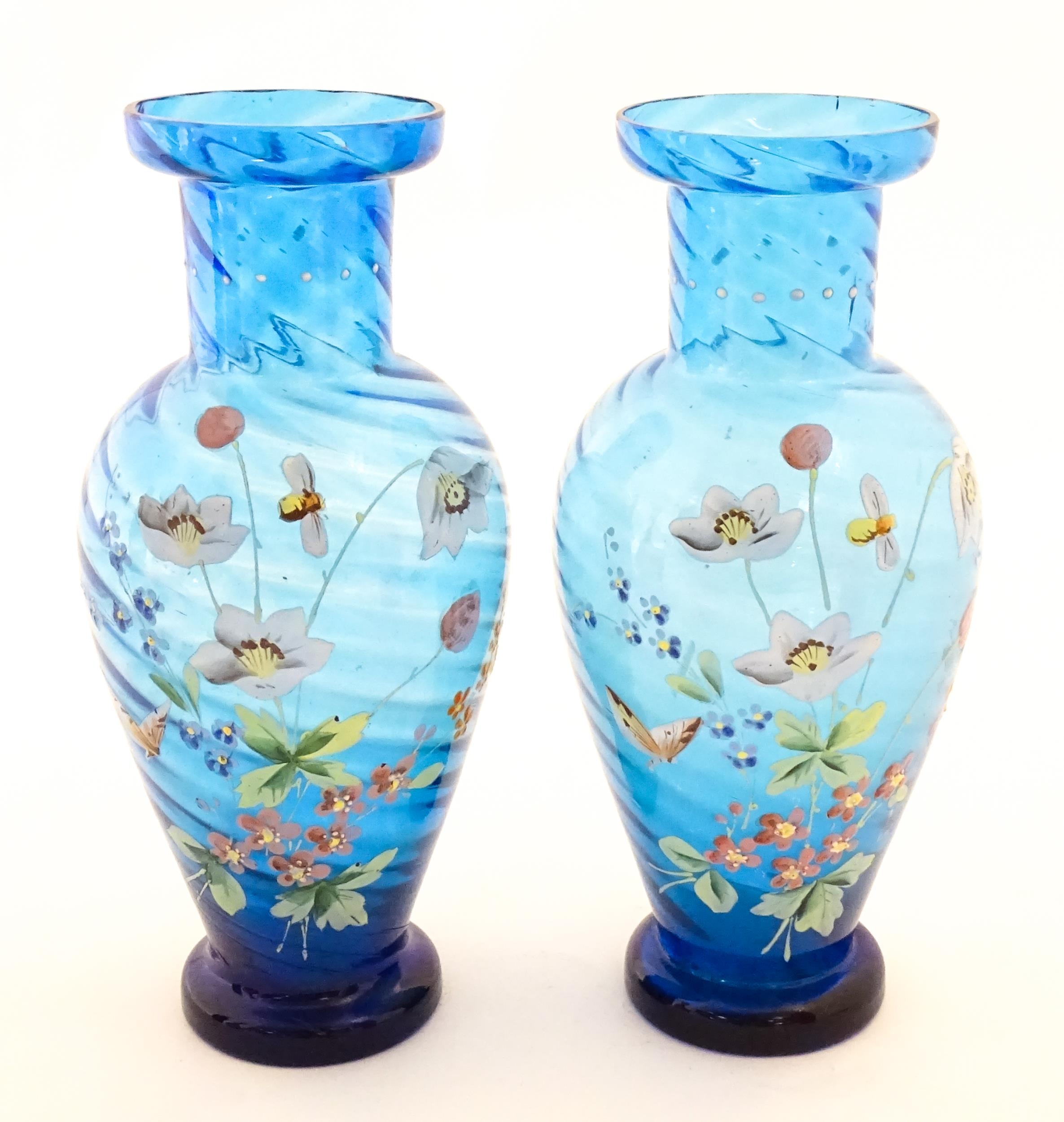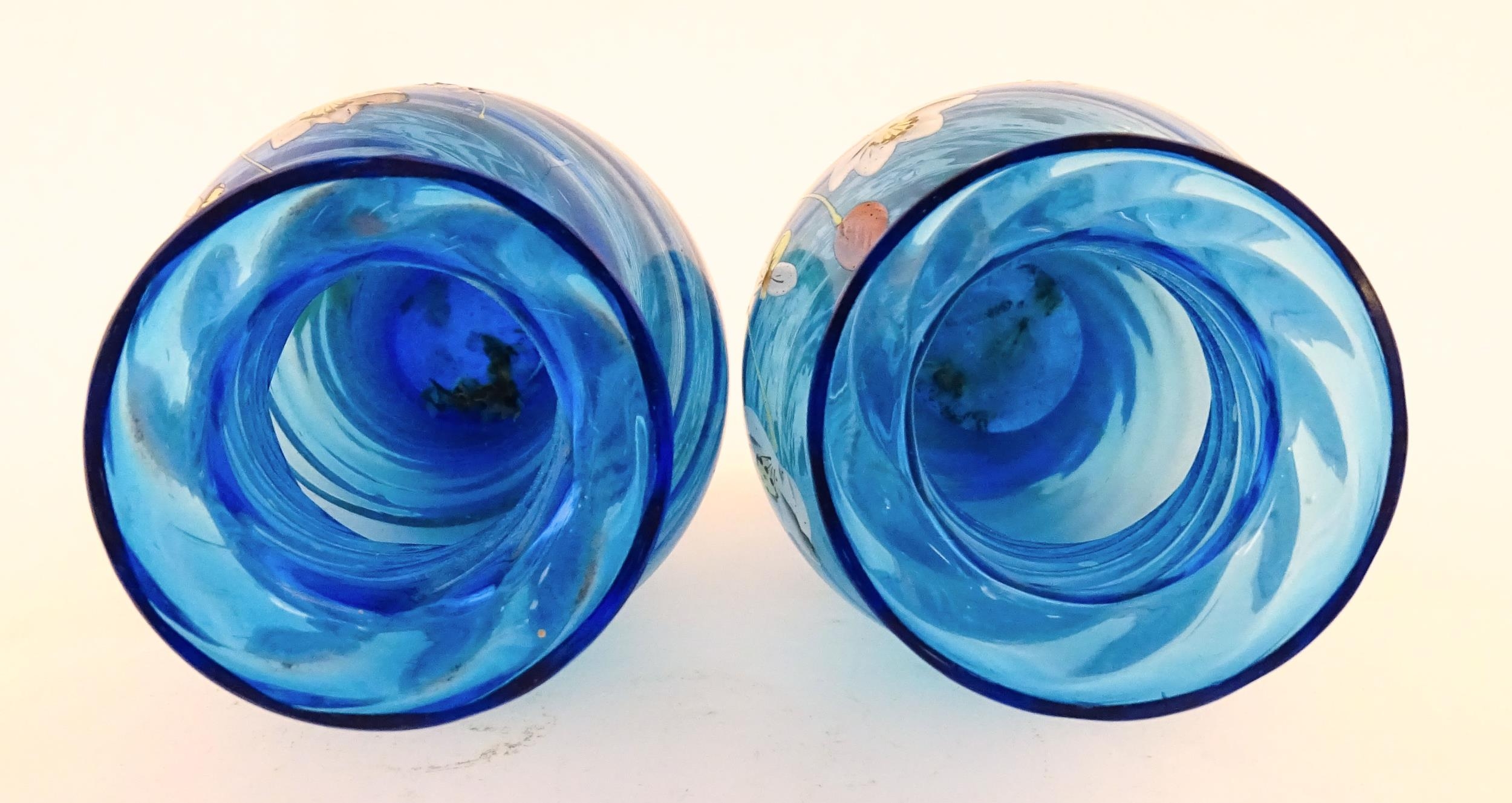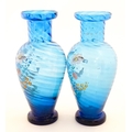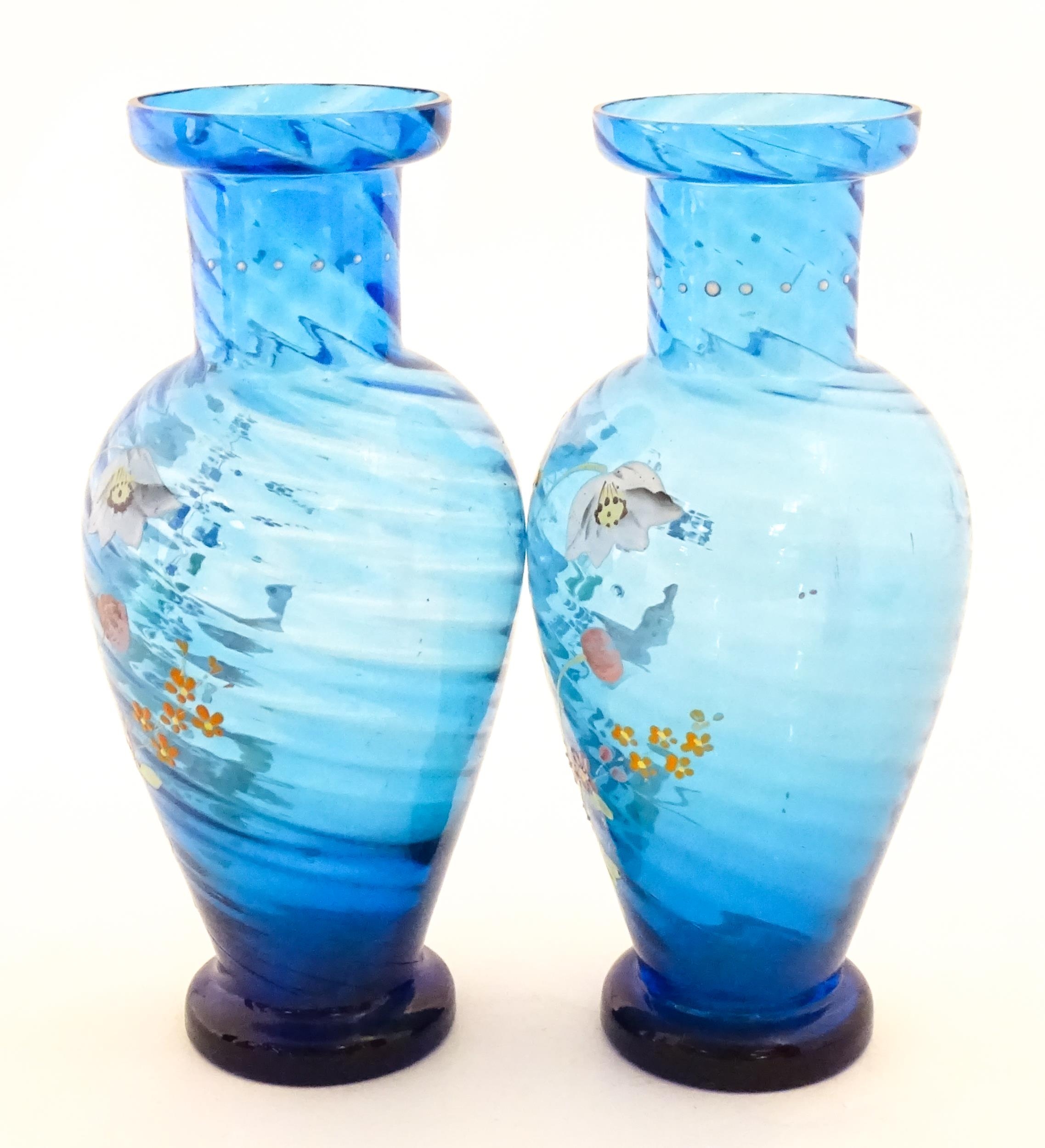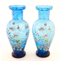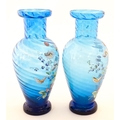 A pair of Victorian blue glass vases with hand painted floral decoration. Approx. 10" high (2)