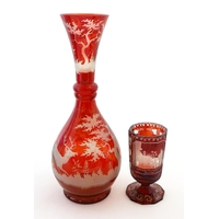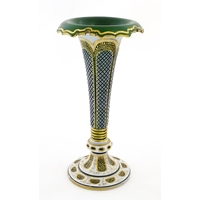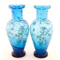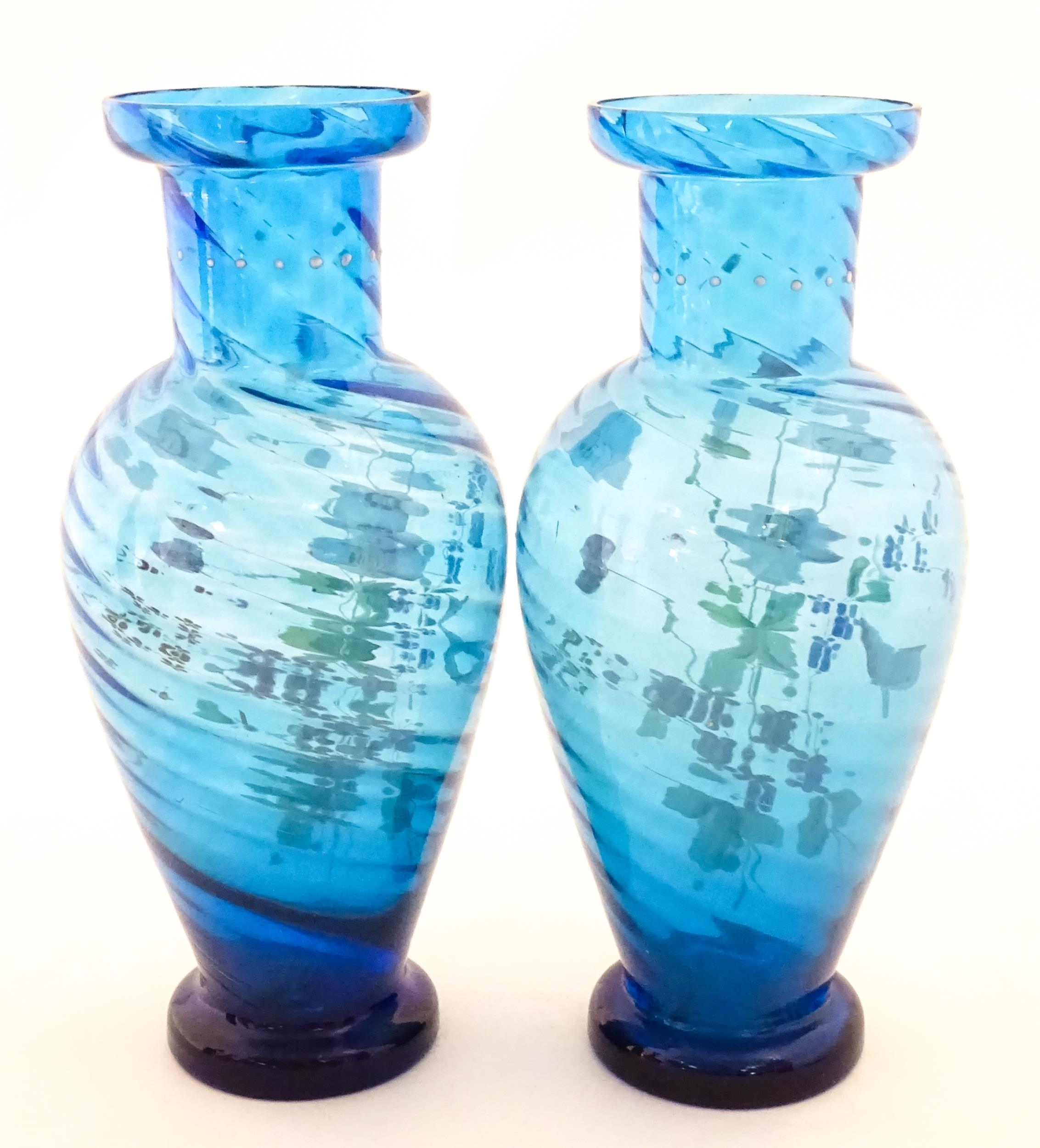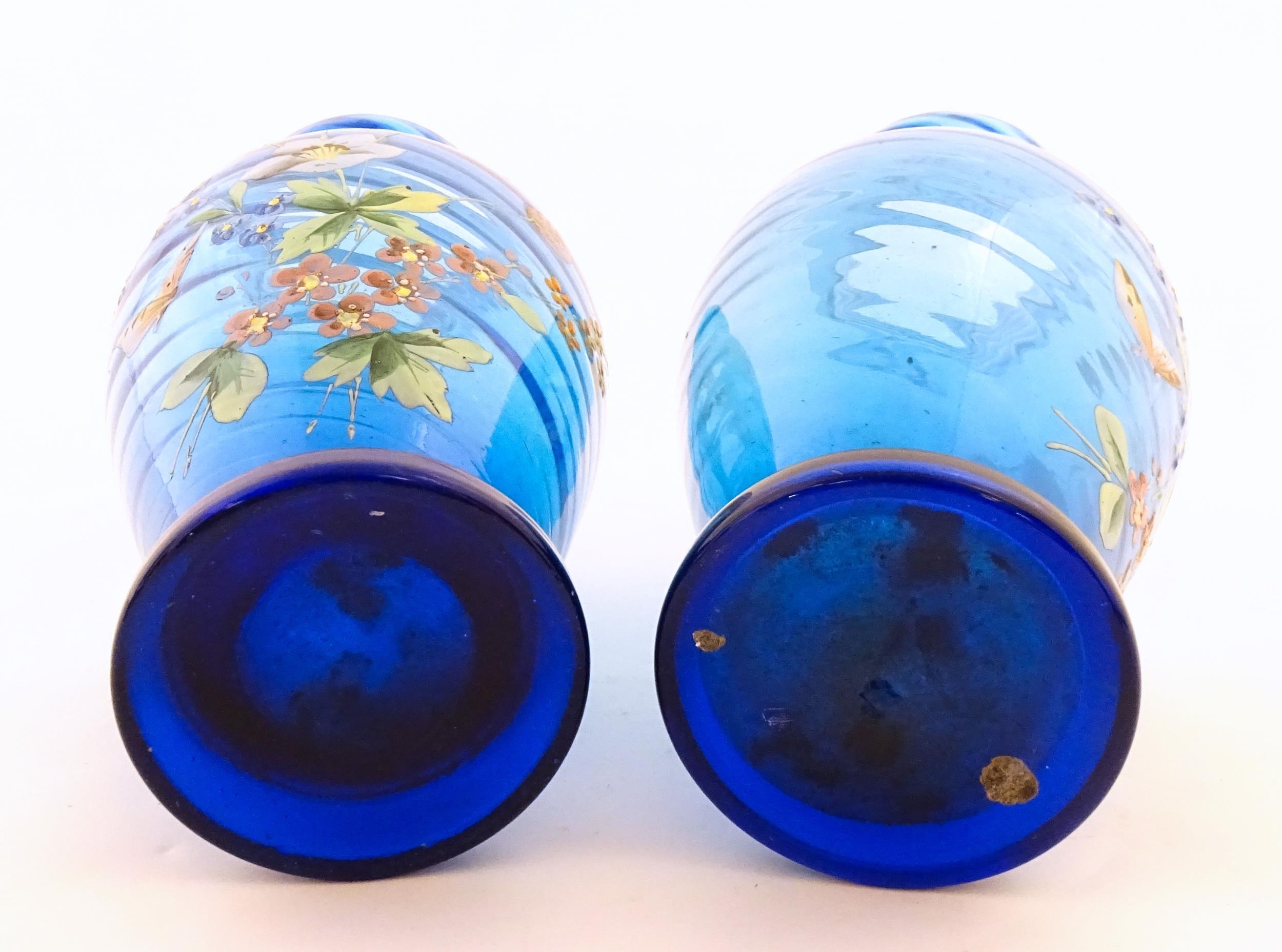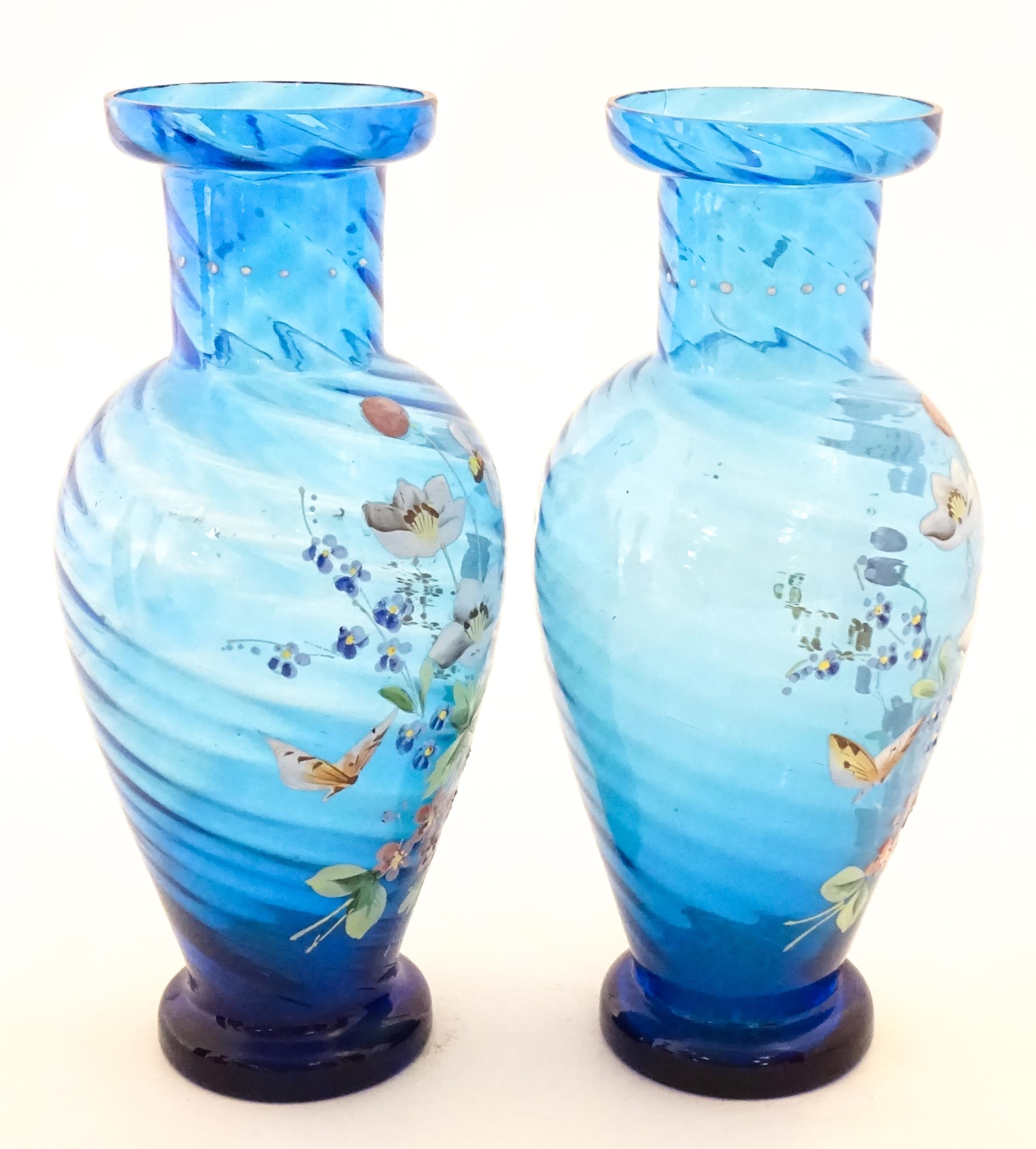 A pair of Victorian blue glass vases with hand painted floral decoration. Approx. 10" high (2)