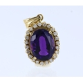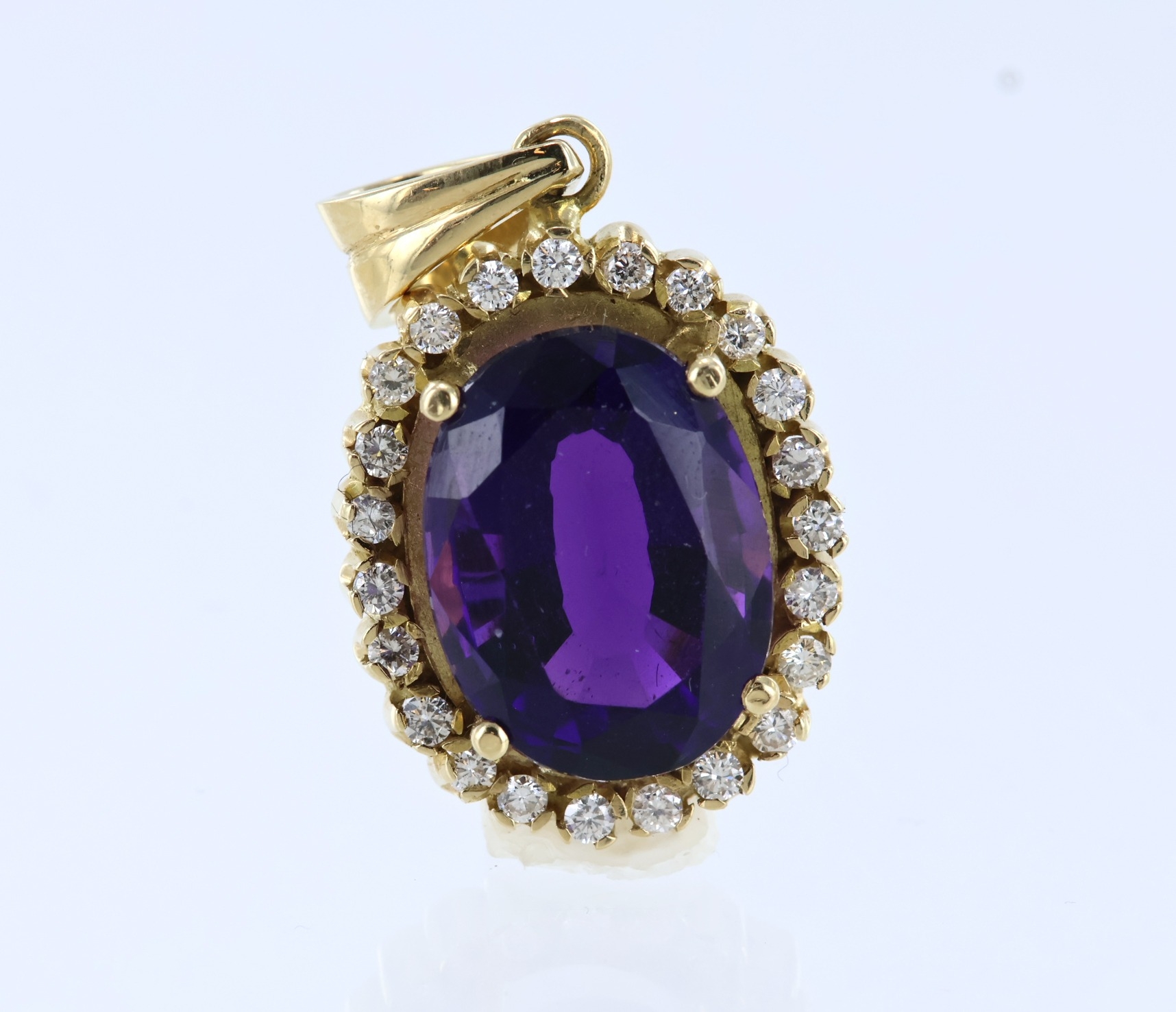 Yellow metal (stamped 18ct) amethyst and diamond pendant, centre oval 16mm x 12mm amethyst, twenty three round brilliant cut diamonds, total diamond weight approx. 0.23ct, length of drop 35mm, weight 12.7g