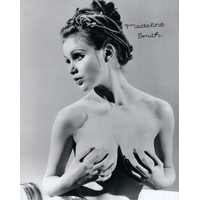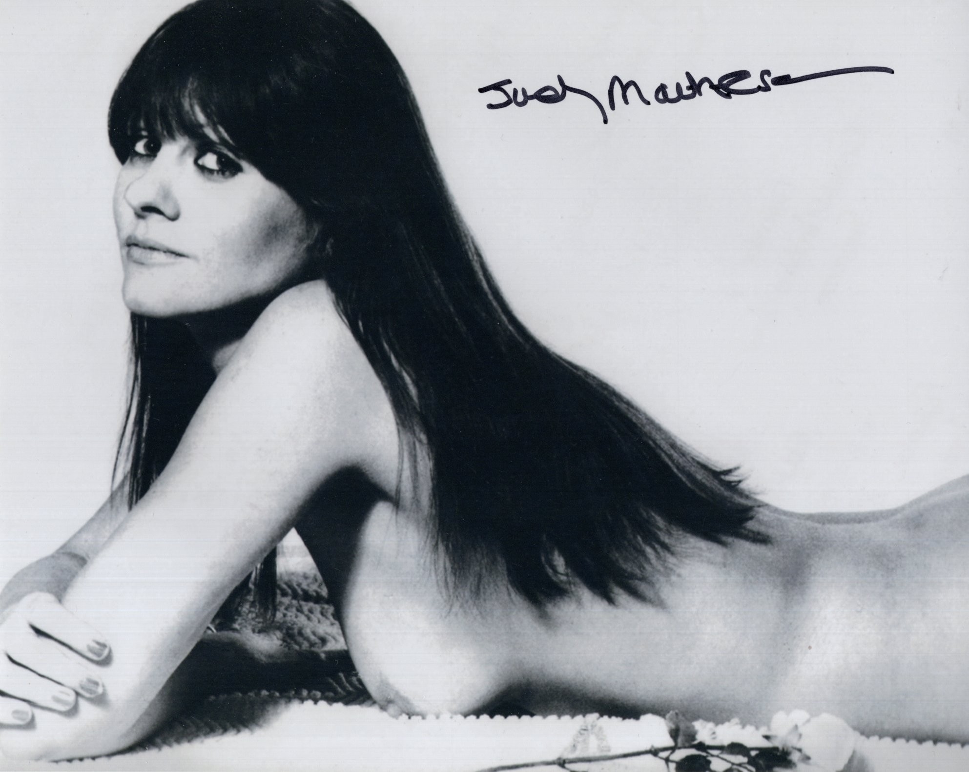 Hammer Horror movie actress Judy Matheson signed sexy topless B&W 8x10 photo.