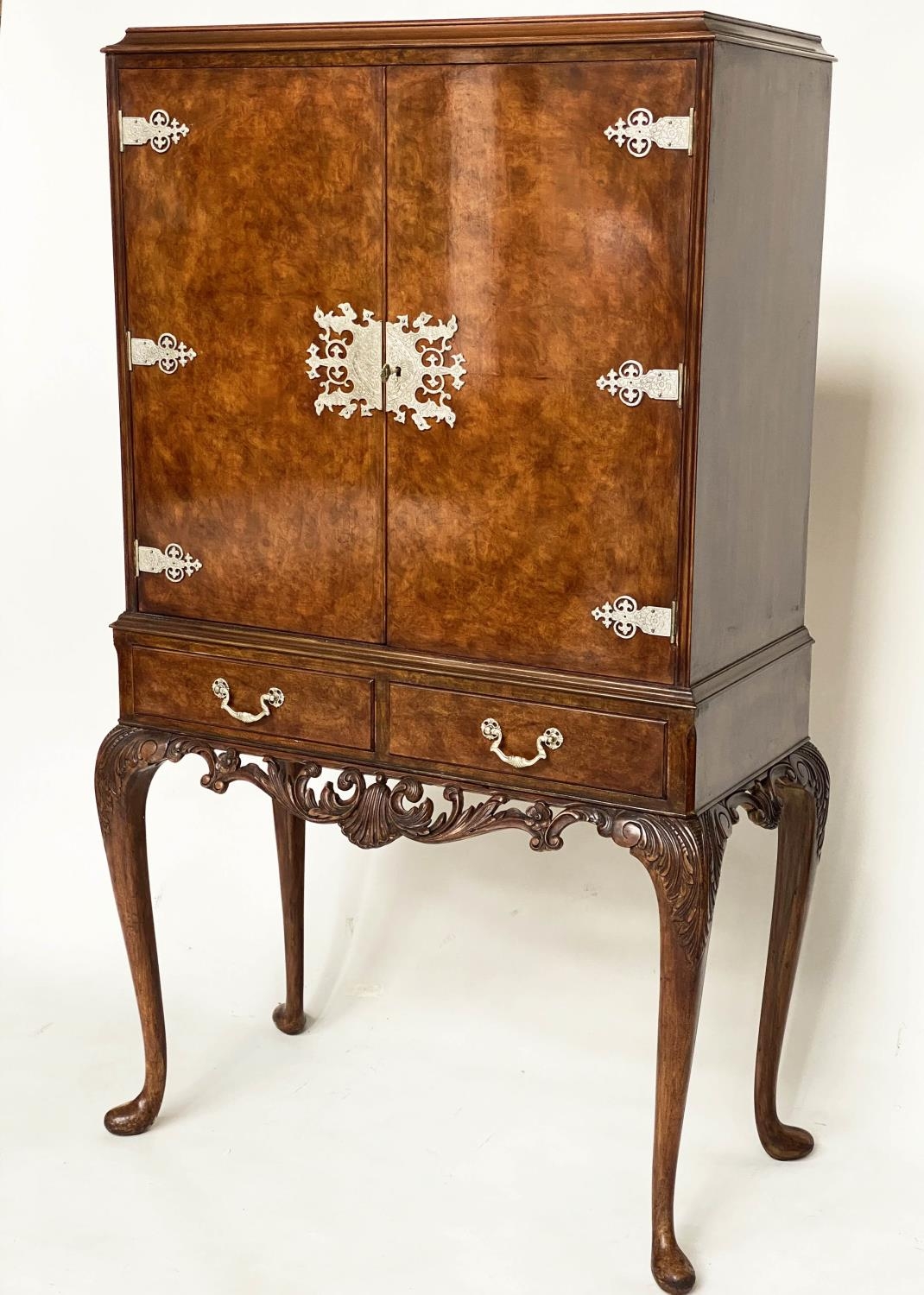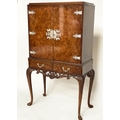 COCKTAIL CABINET, Queen Anne style burr walnut and silvered metal mounted with two doors and carved apron and cabriole supports, 90cm W x 155cm x 47cm D.