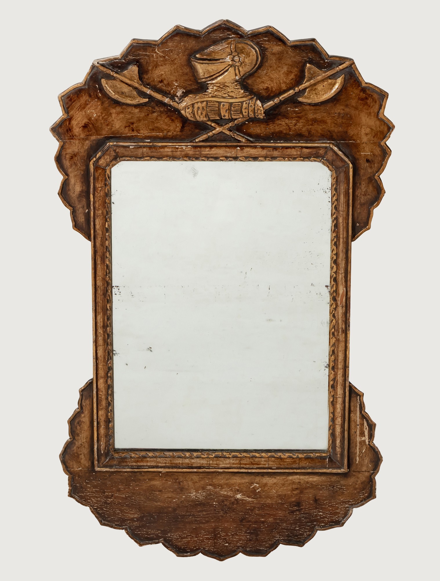 The rectangular plate within a gilt panel, the shaped top with a heraldic decoration of a knight's head above a pair of crossed halberds