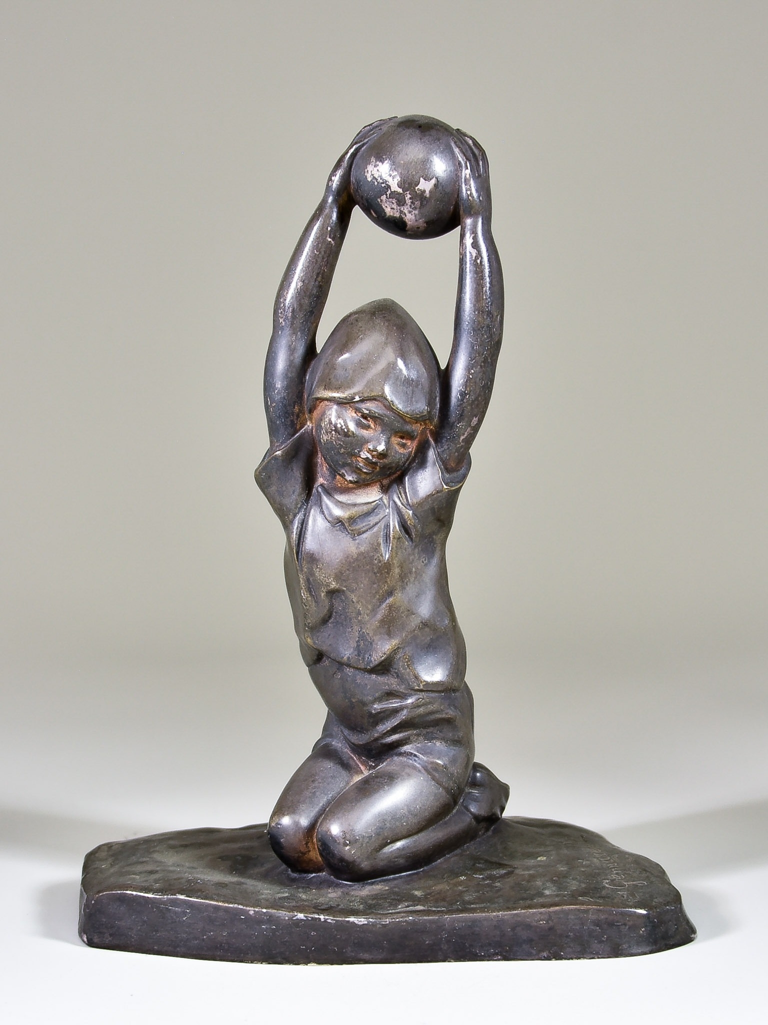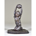 Amedeo Gennarelli (1881-1943) - Green patinated bronze figure of a kneeling young child wearing hat, holding aloft a ball, on shaped base, signed, 11ins high