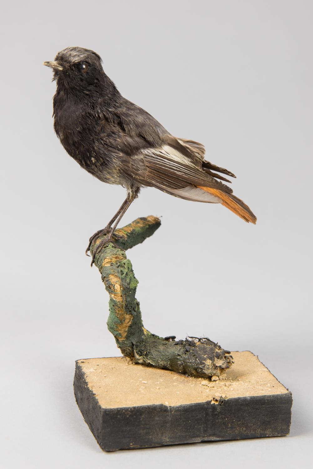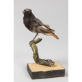 AN EARLY 20TH CENTURY TAXIDERMY BLACK REDSTART UPON A NATURALISTIC BASE.