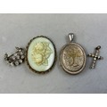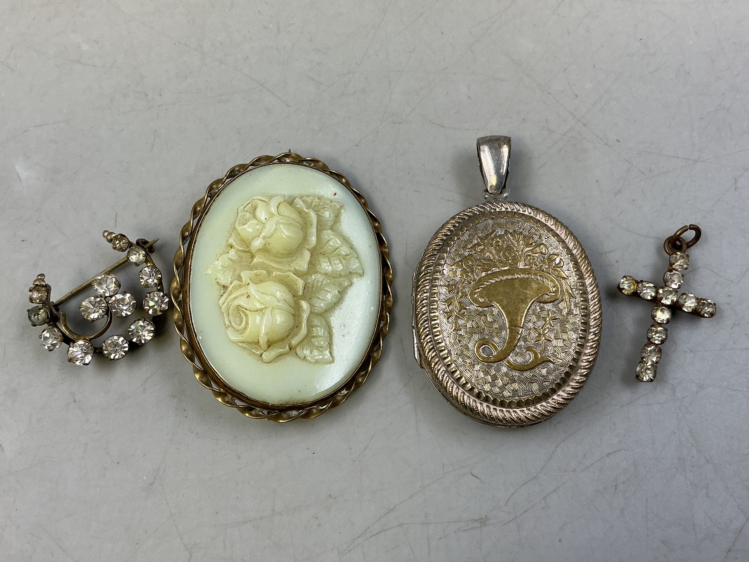 Four Pieces of Antique Jewellery includes two Brooches, Locket Pendant and a Jewelled Cross