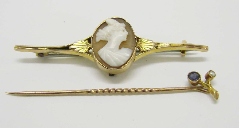 Boxed 9ct pearl stick pin and a 9ct gold mounted cameo brooch