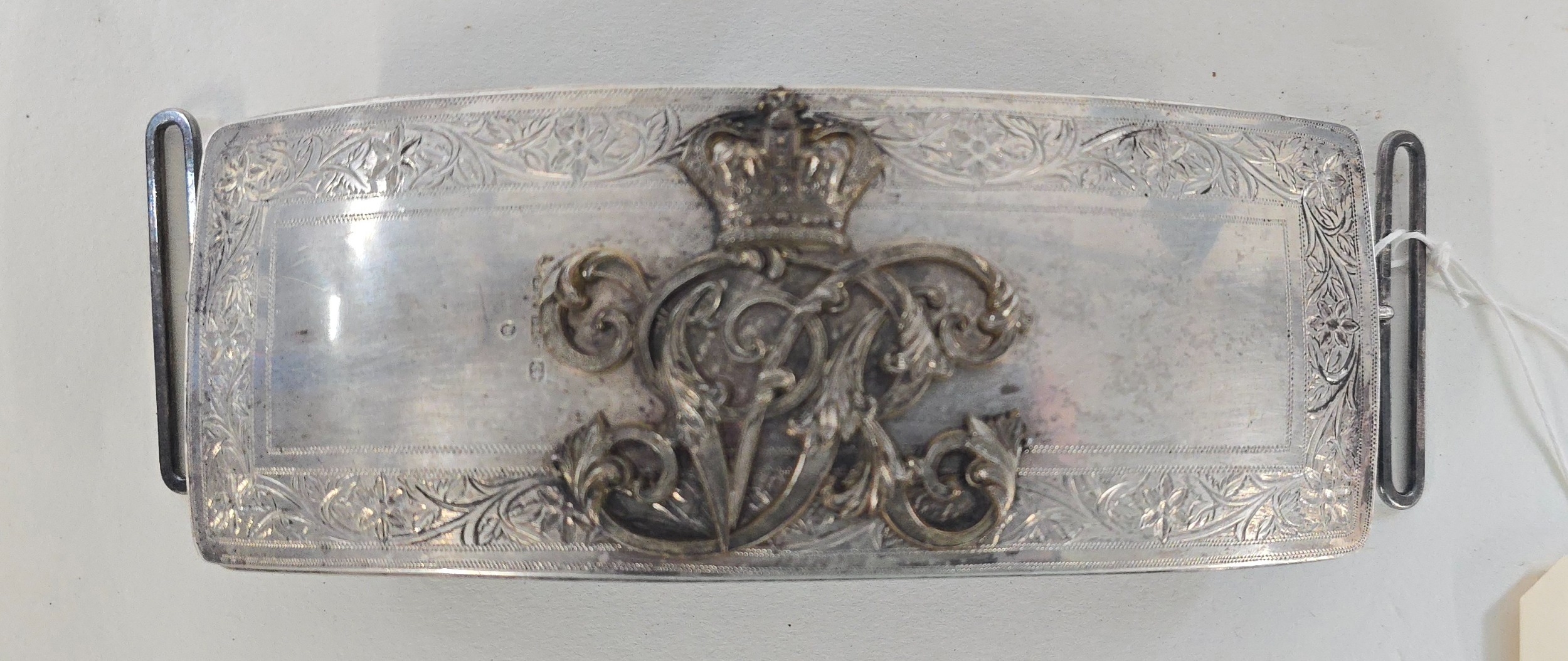 A Victorian Cavalry officer's silver fronted pouch belt pouch, the plate bearing B'ham HM for 1876. GC, the cypher appears to be silvered.