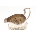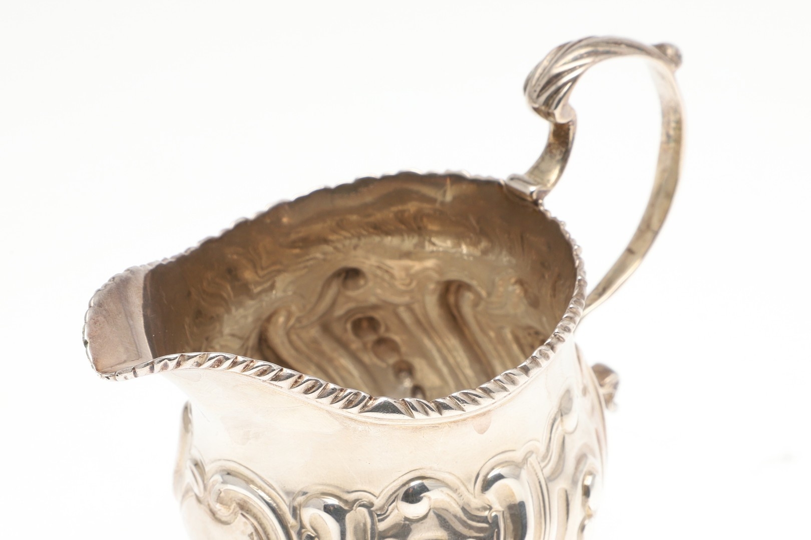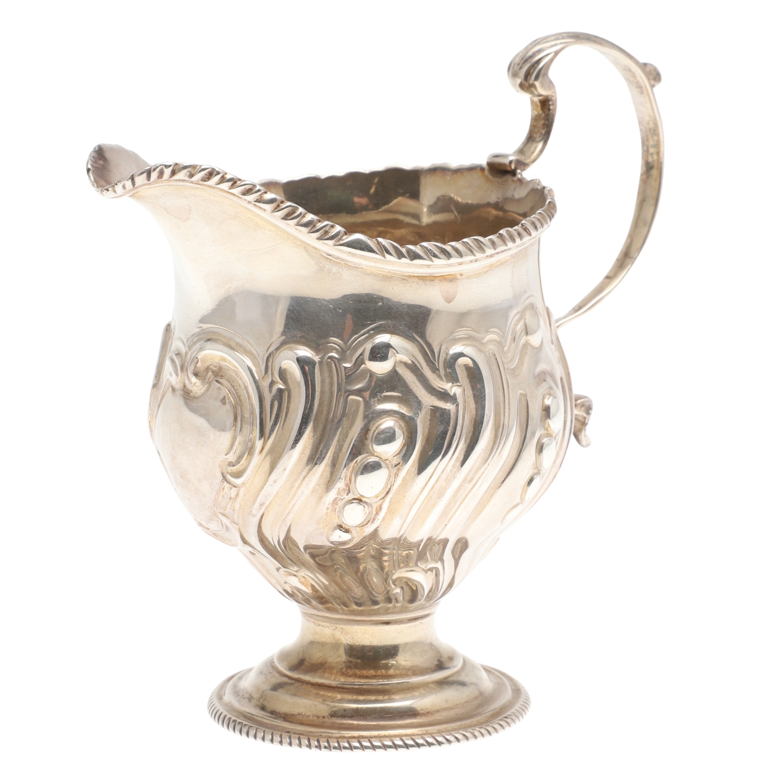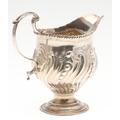A GEORGE III CREAM JUG. With scroll handle, repousse and gadrooned decoration and a blank cartouche, on a round spreading foot. Hallmarks are worn but appear to be circa 1780. Height 11cm, Weight 4.2ozt.