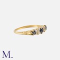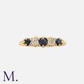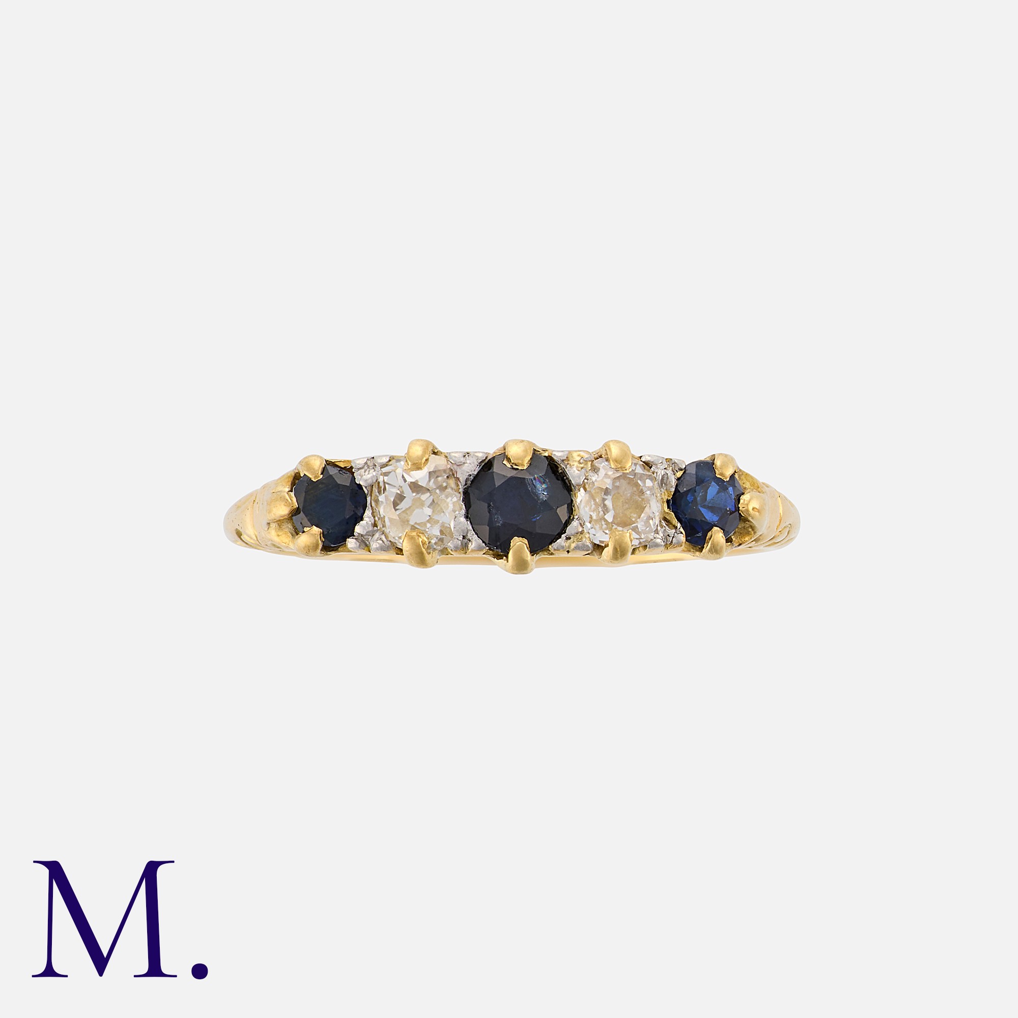 A Sapphire And Diamond Five Stone Ring in yellow gold, set with three round cut sapphires punctuated by old cut diamonds. Unmarked, tests indicate 18 carat gold.