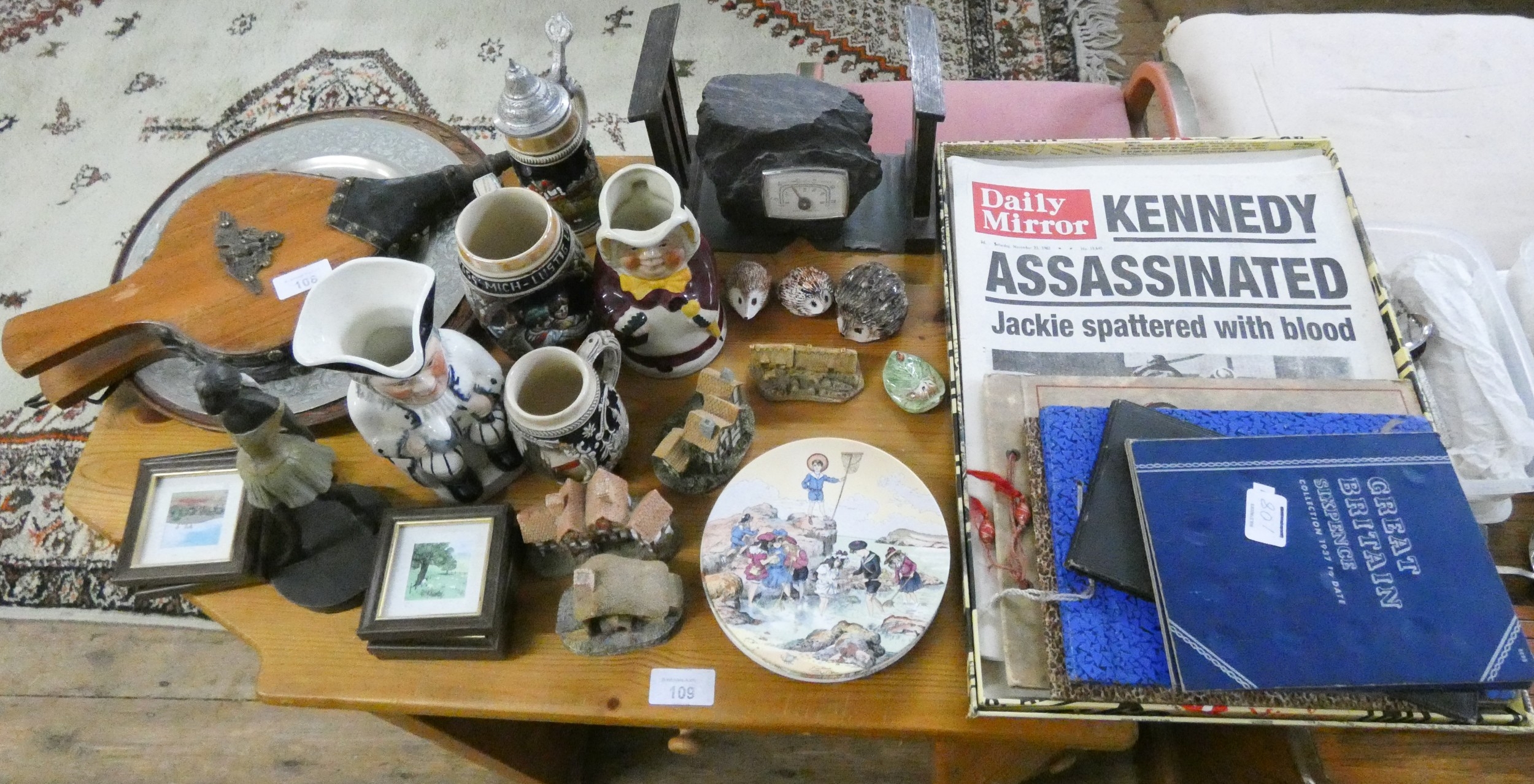 A collection of various old newspapers, sixpences in albums, bellows, dishes, Toby jugs and assorted ornamental china etc