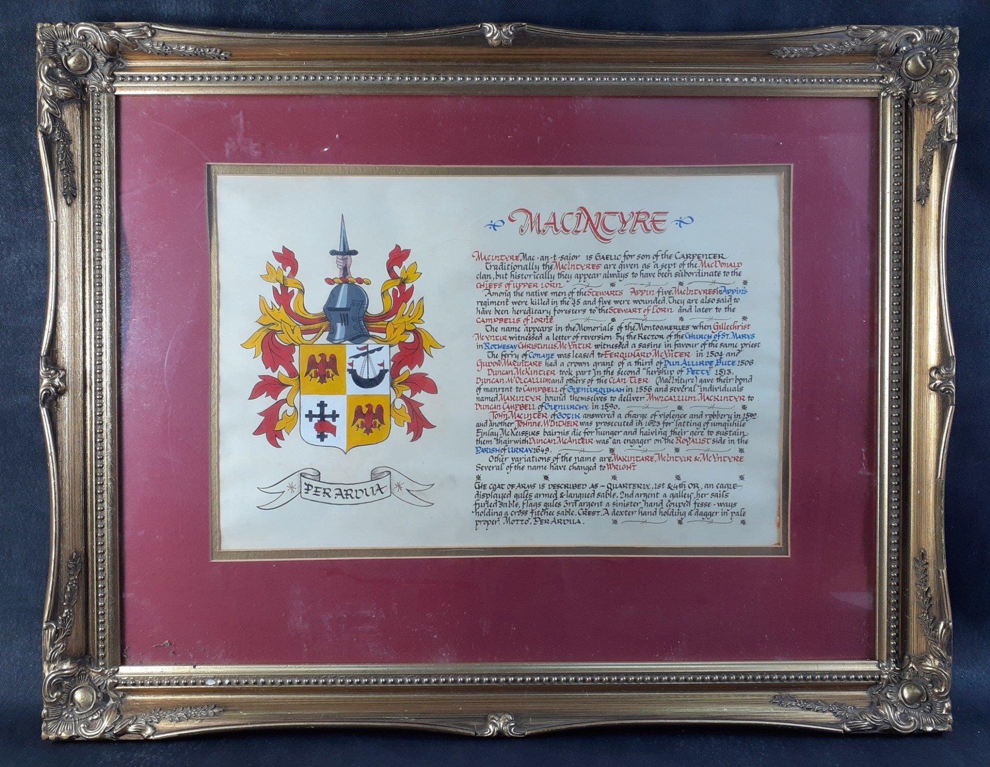 A large framed calligraphy scroll of MACINTYRE family interest frame size 69x54cm