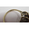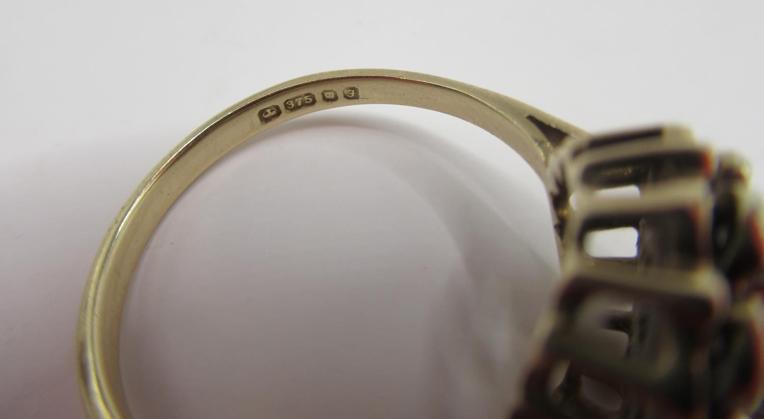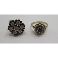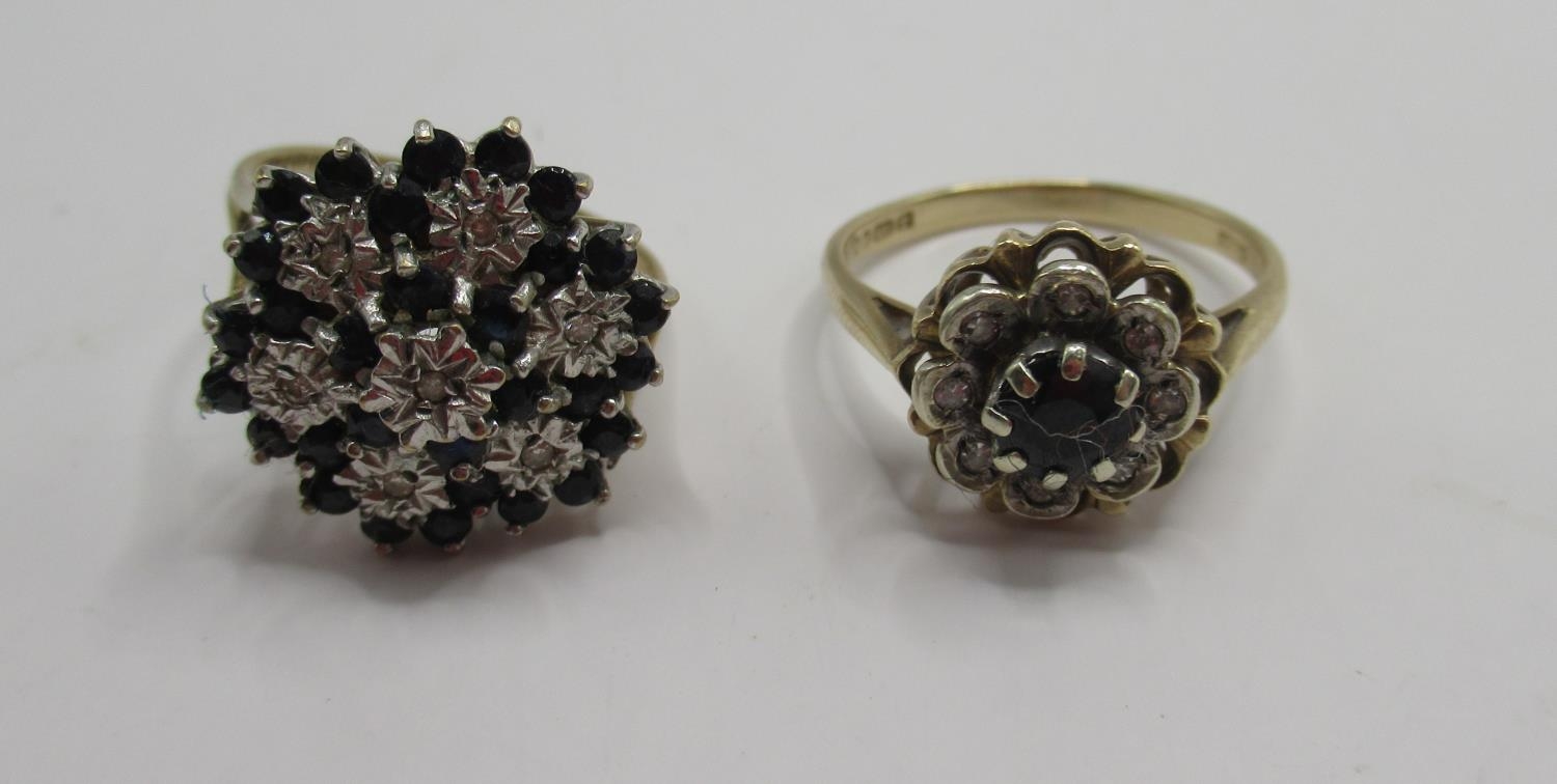 9ct yellow gold large cluster ring set with sapphires and white stones, size O, and another smaller, set with central ruby and diamonds, size O1/2, 7.28g