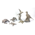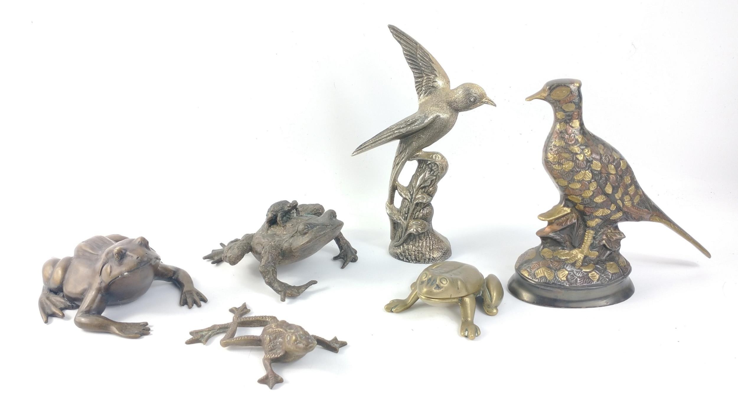 A delightful selection for FROG and BIRD LOVERS! A collection of 6 decorative brass items consisting of 4 frogs (one with a baby frog on its back approx. L12cm which has two toes missing), a frog with a hinged body which opens approx. L8cm, a larger frog approx. L15cm and a smaller frog approx. L11cm along with two birds - a pheasant approx. L15cm x H16cm, and a perching bird in semi-landing/flight approx. H17cm.