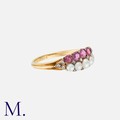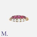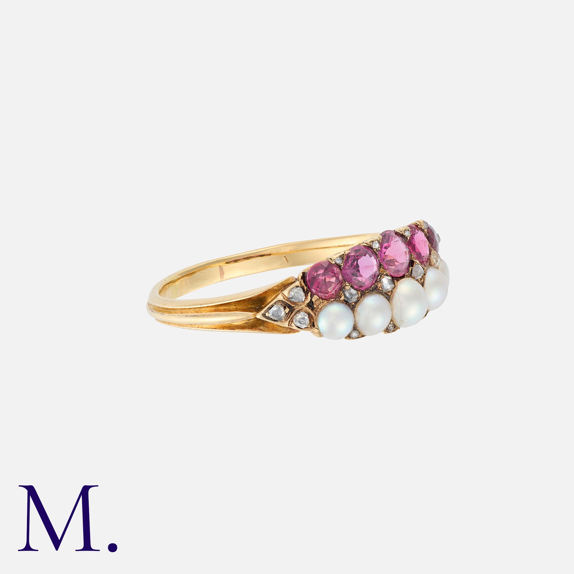 An Antique Ruby, Pearl And Diamond Ring in yellow gold, set with one row of graduated round cut rubies, one row of graduated pearls and accented by rose cut diamonds. Unmarked but tests indicate 15 carat gold.