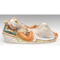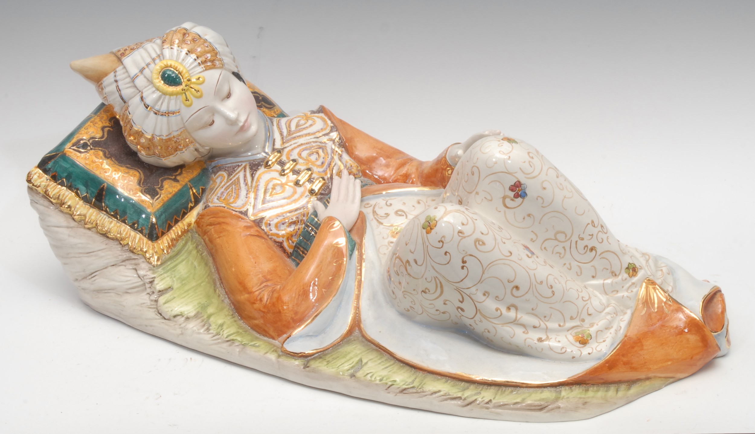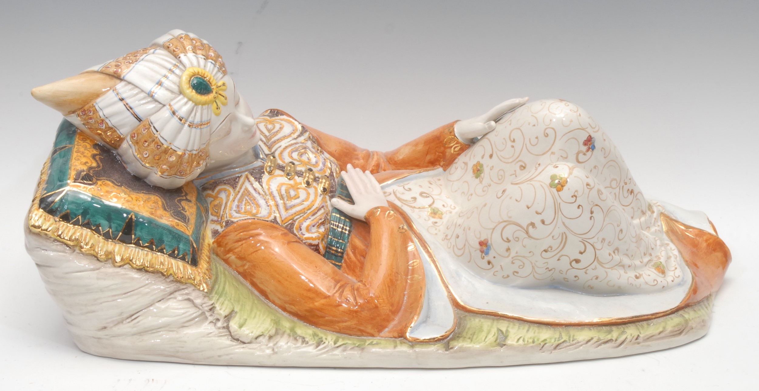 A large Italian faience figure, after D. Polo Uiato, of a reclining boy, wearing traditional Moroccan costume, painted in polychrome, picked out in gilt, signed in the maquette, 58cm long