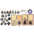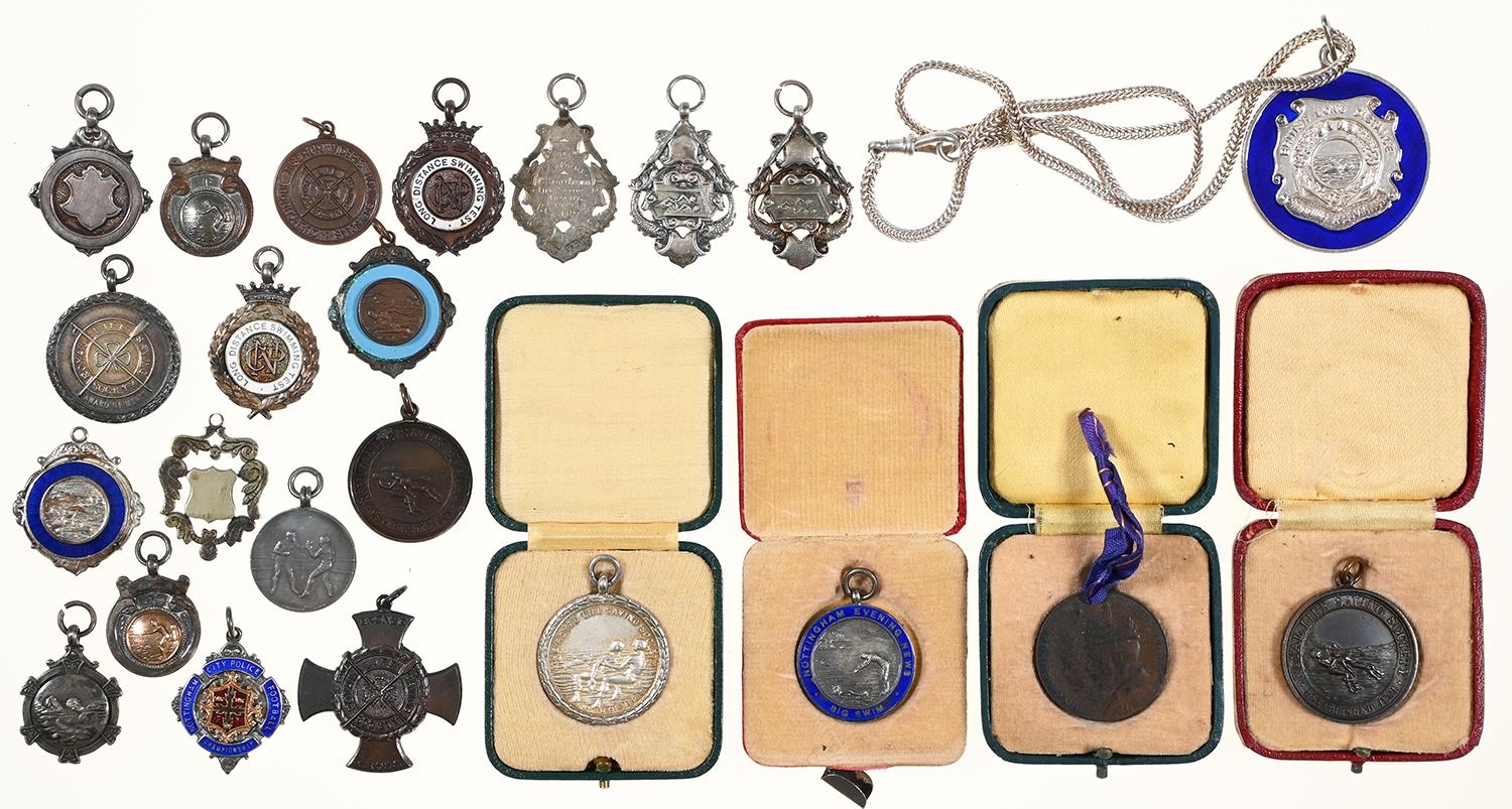 Miscellaneous silver and bronze swimming medals and watch fob shields, 7ozs 3dwts (silver)
