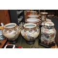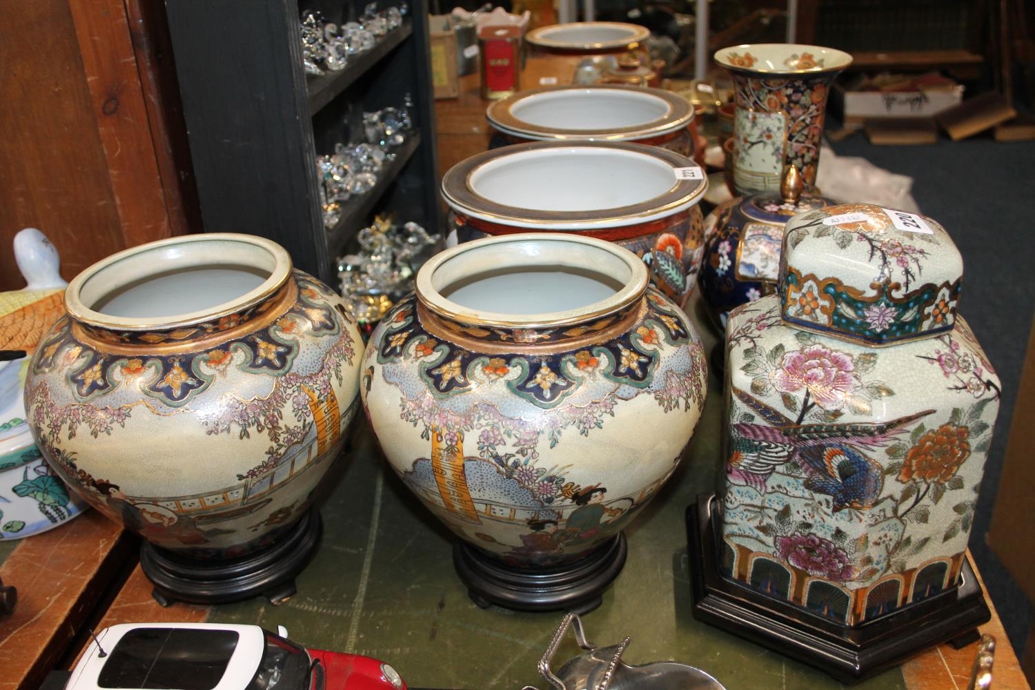 Two oriental vases on hardwood stands and an oriental floral decorated ginger jar on stand.