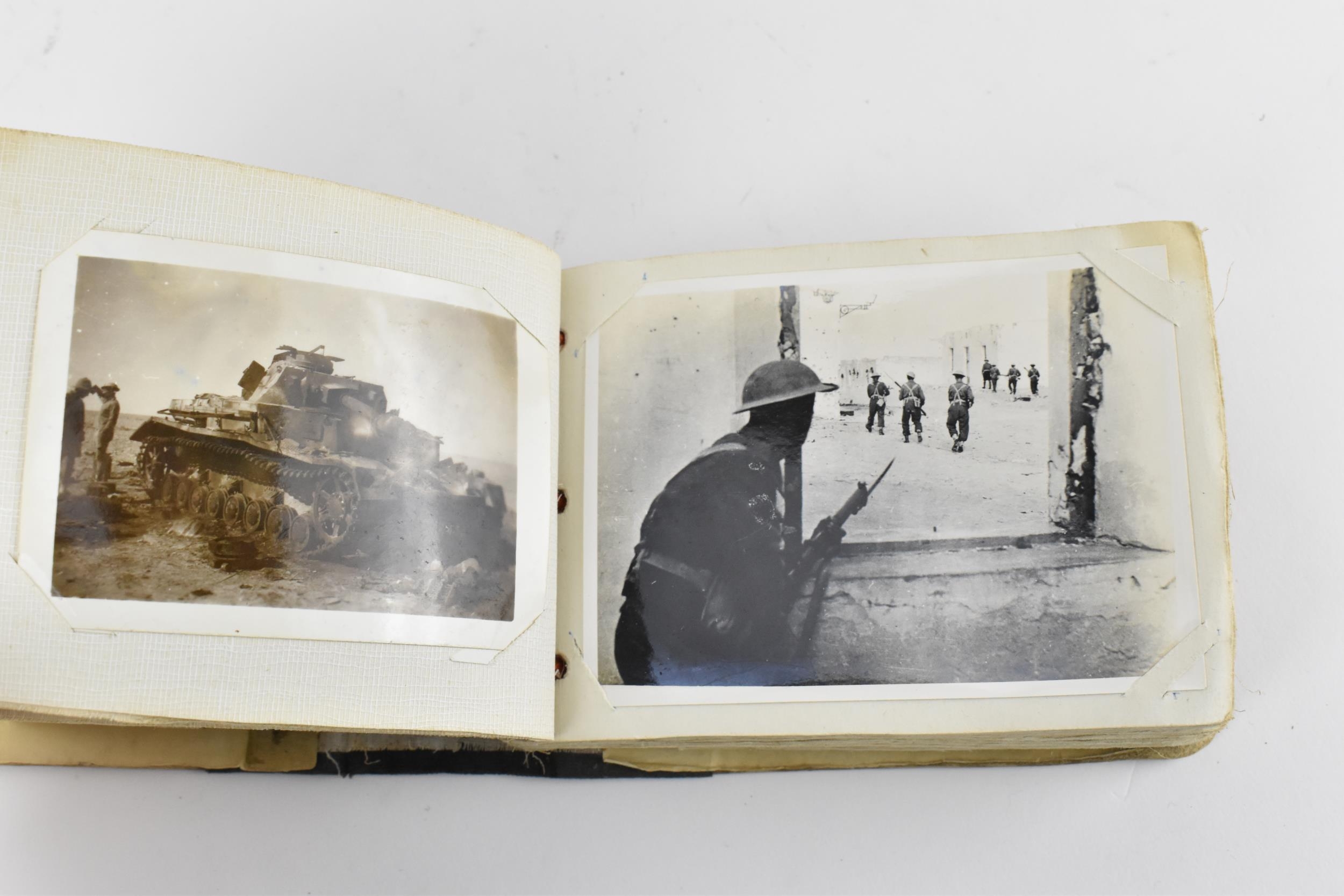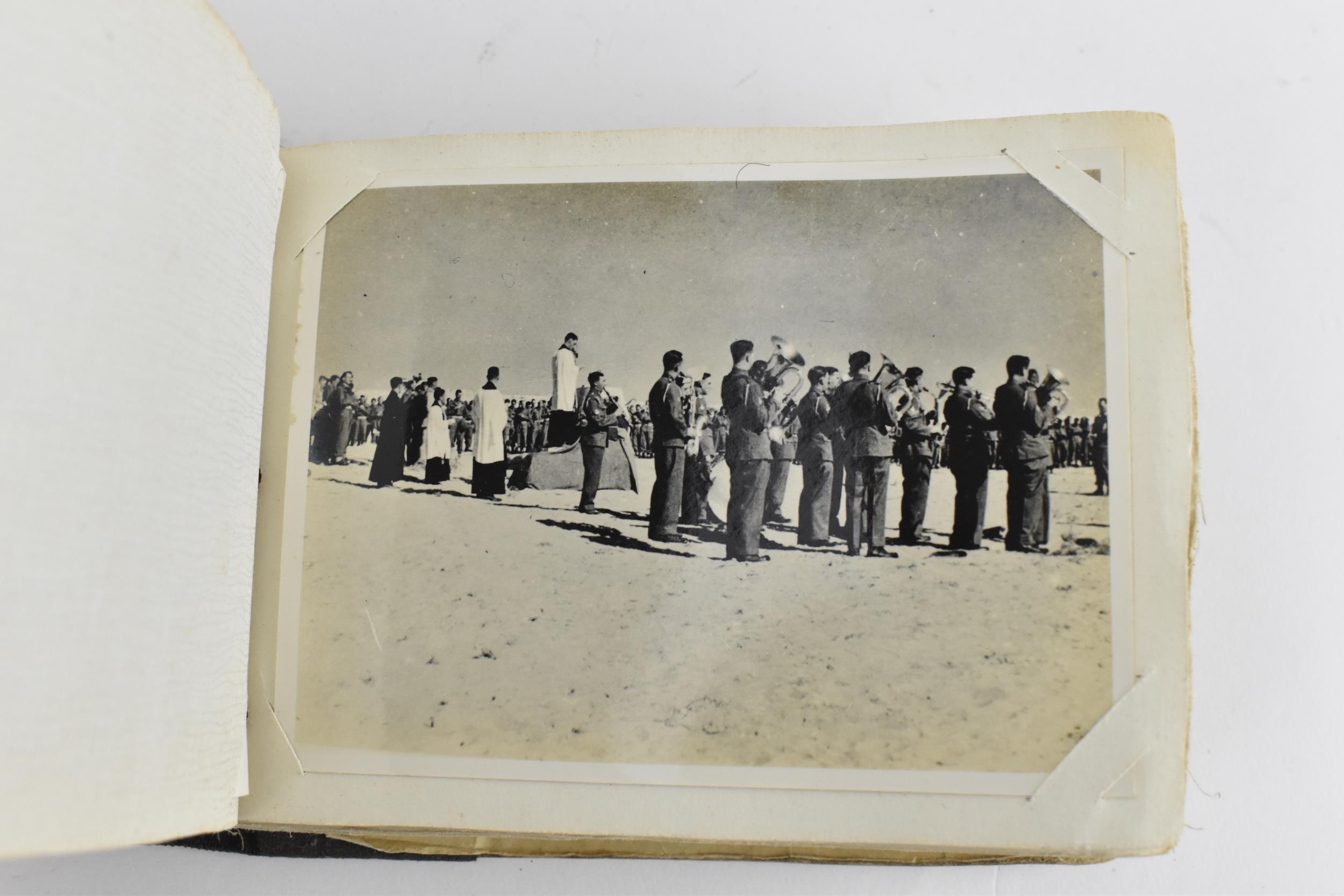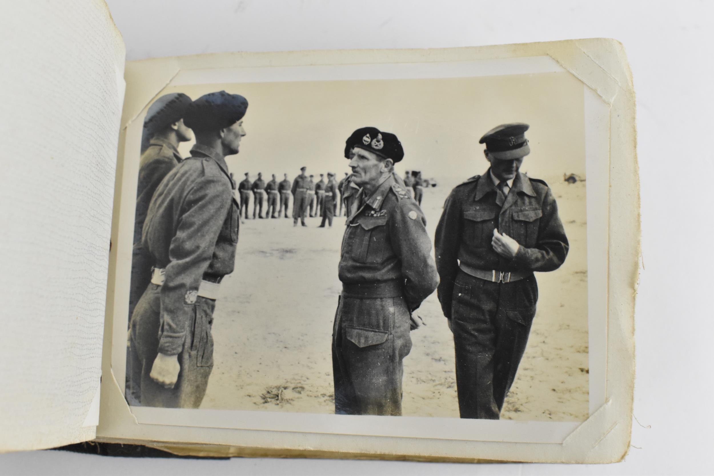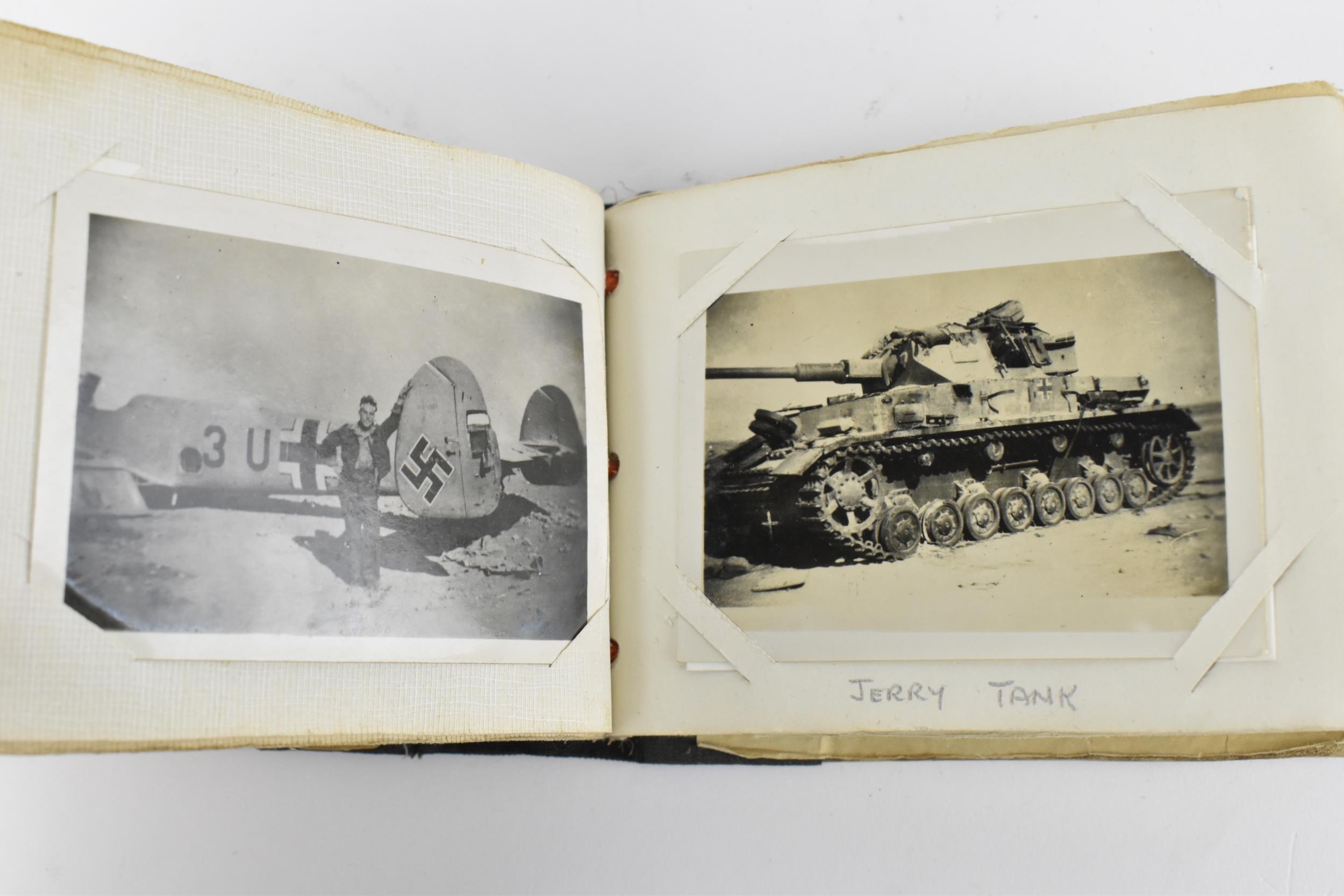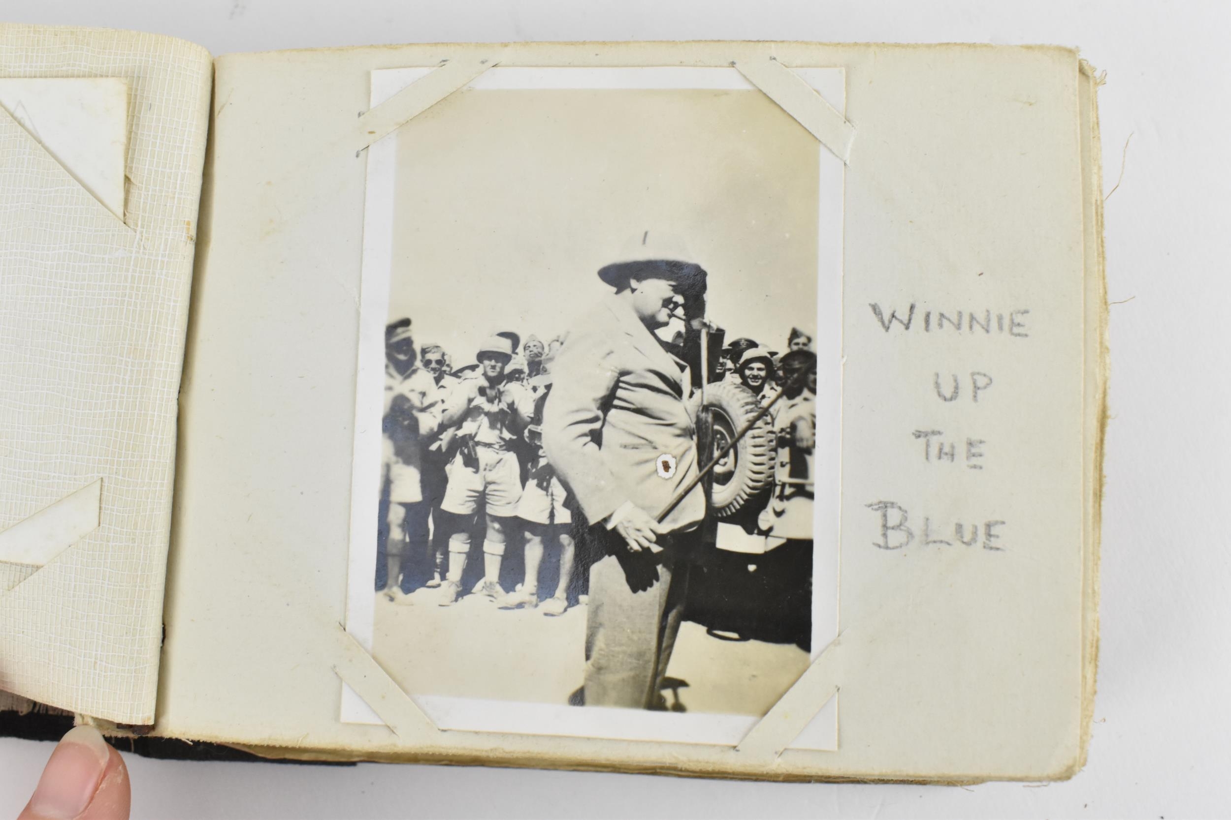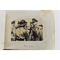 A World War II photograph album, belonging to Mr. Roy Williams from the Devonshire Regiment, containing photographs of Winston Churchill speaking to soldiers, one annotated 'Winnie up the blue', and photographs of camps, soldiers, battle zone, ennemi planes, General Erwin Rommel, prisoners of war, views etc
