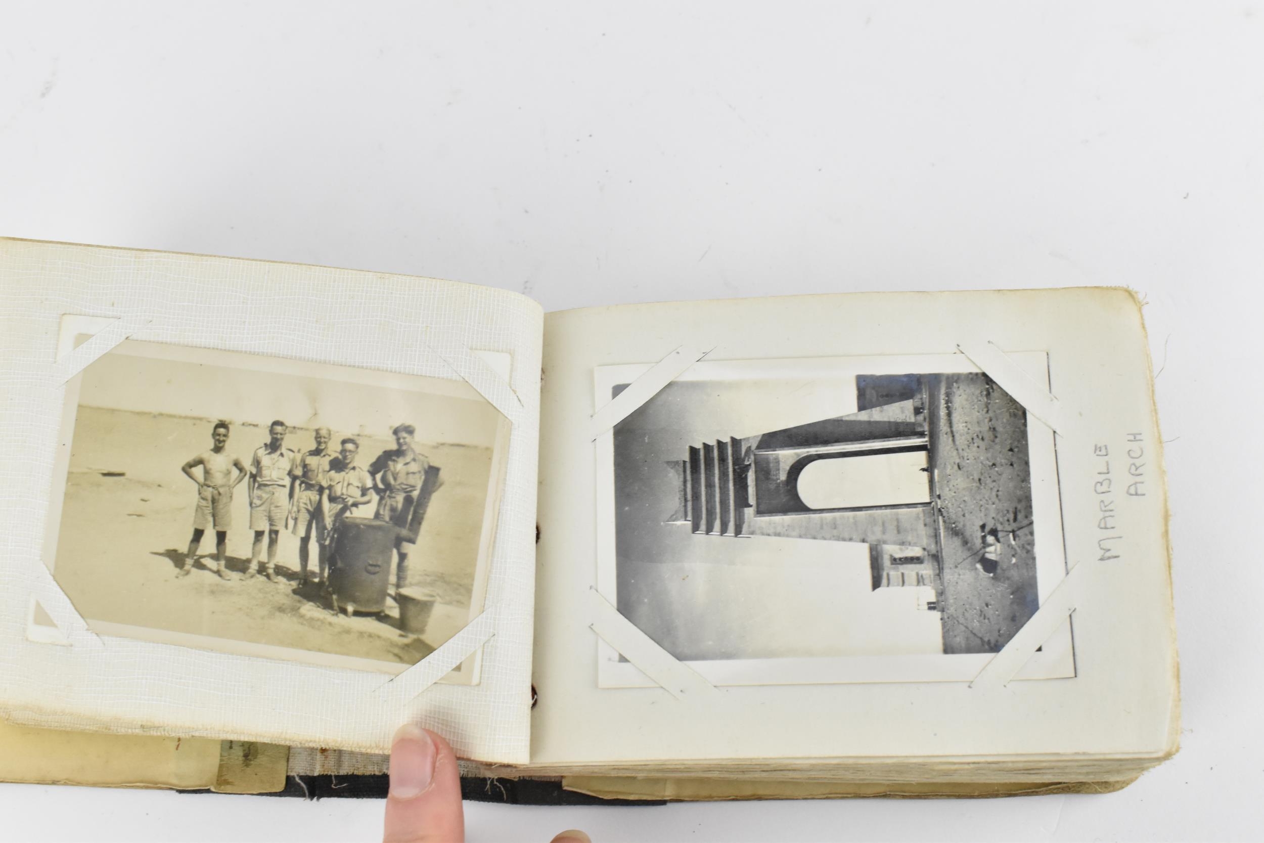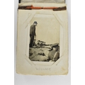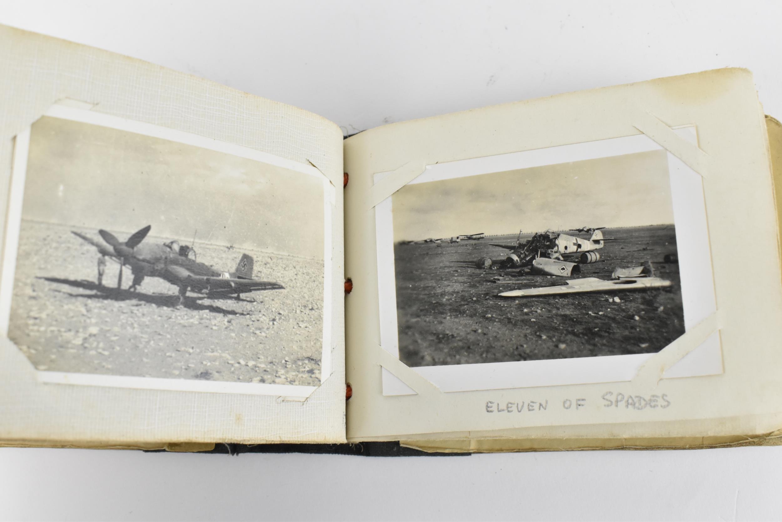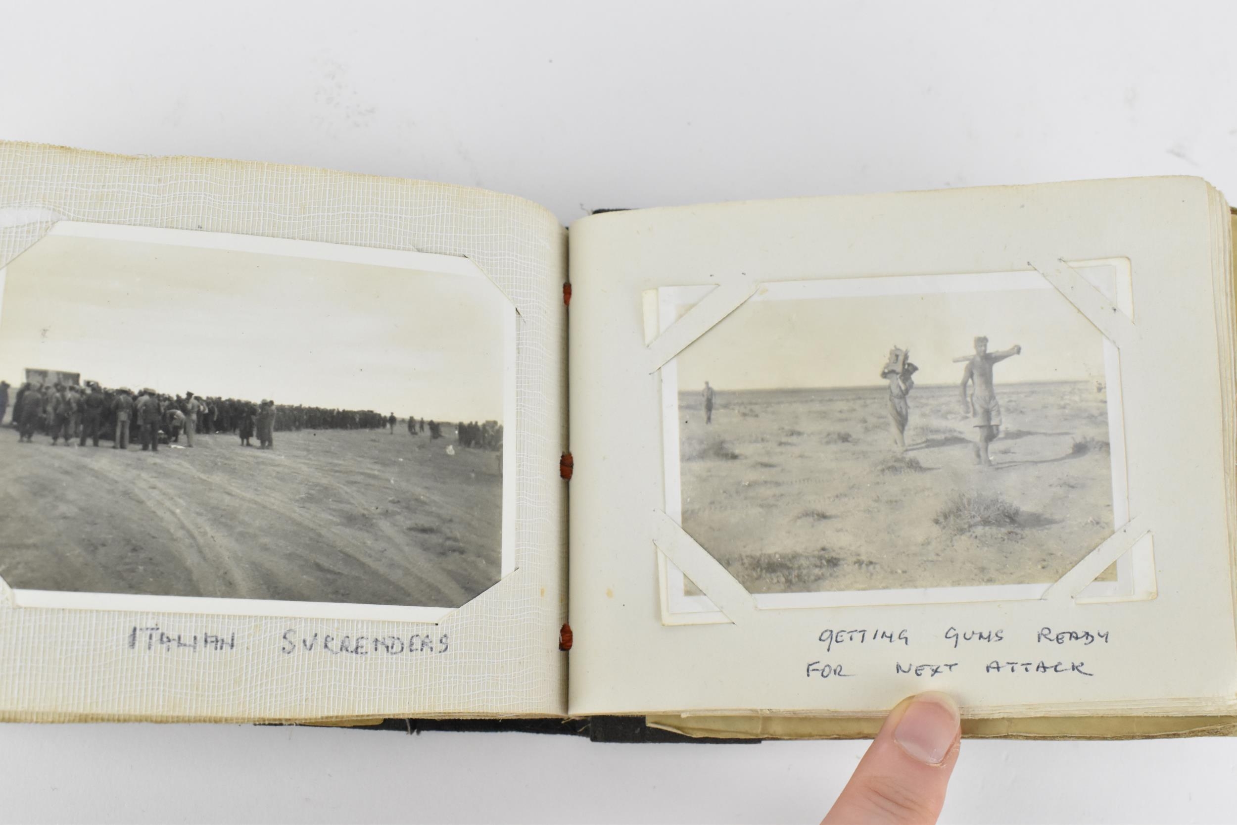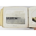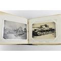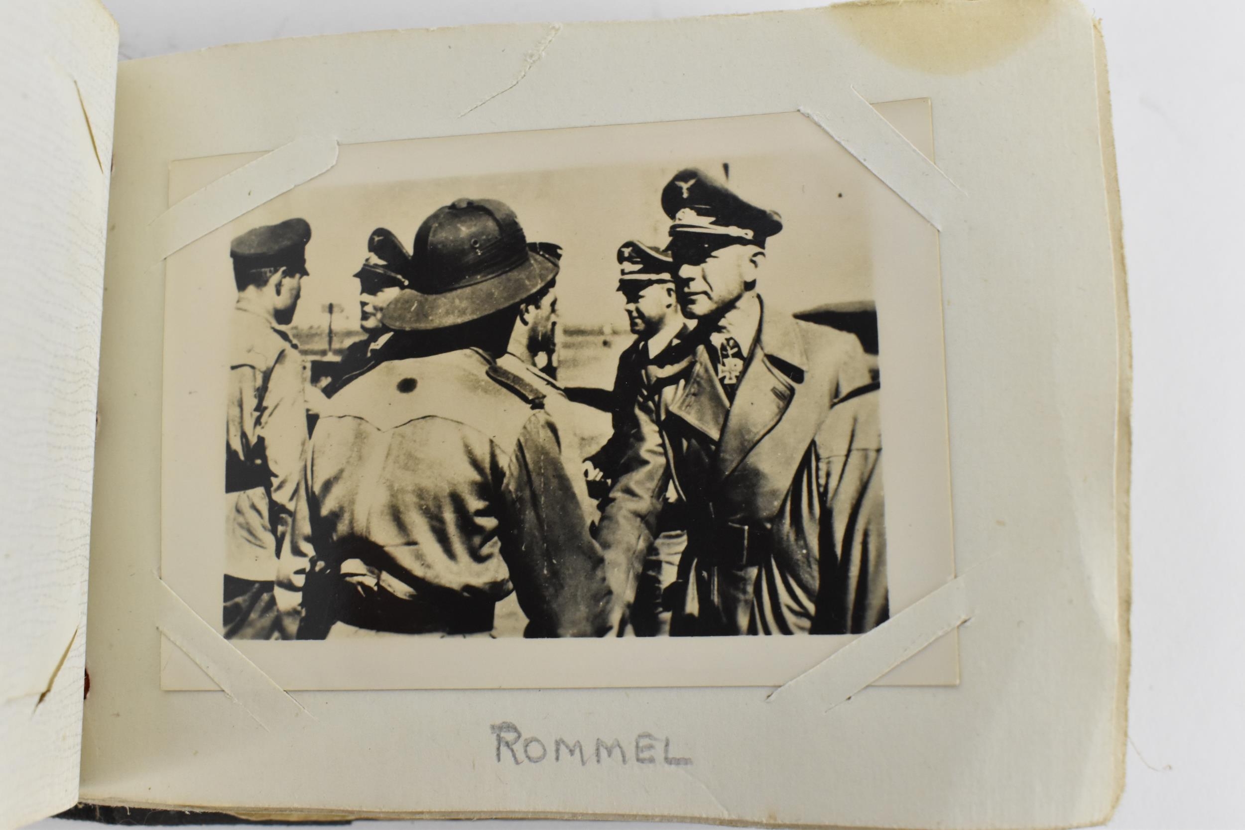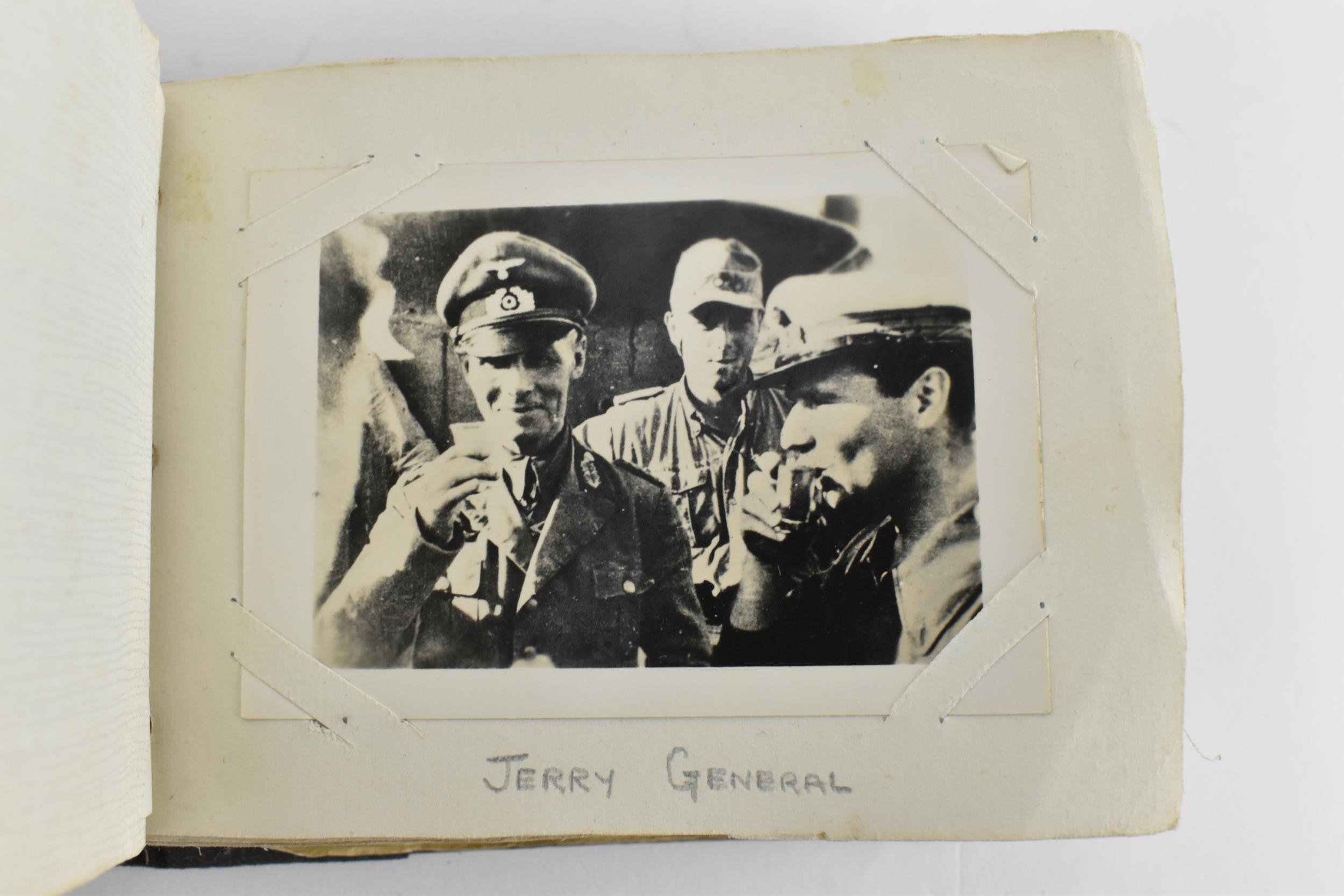 A World War II photograph album, belonging to Mr. Roy Williams from the Devonshire Regiment, containing photographs of Winston Churchill speaking to soldiers, one annotated 'Winnie up the blue', and photographs of camps, soldiers, battle zone, ennemi planes, General Erwin Rommel, prisoners of war, views etc