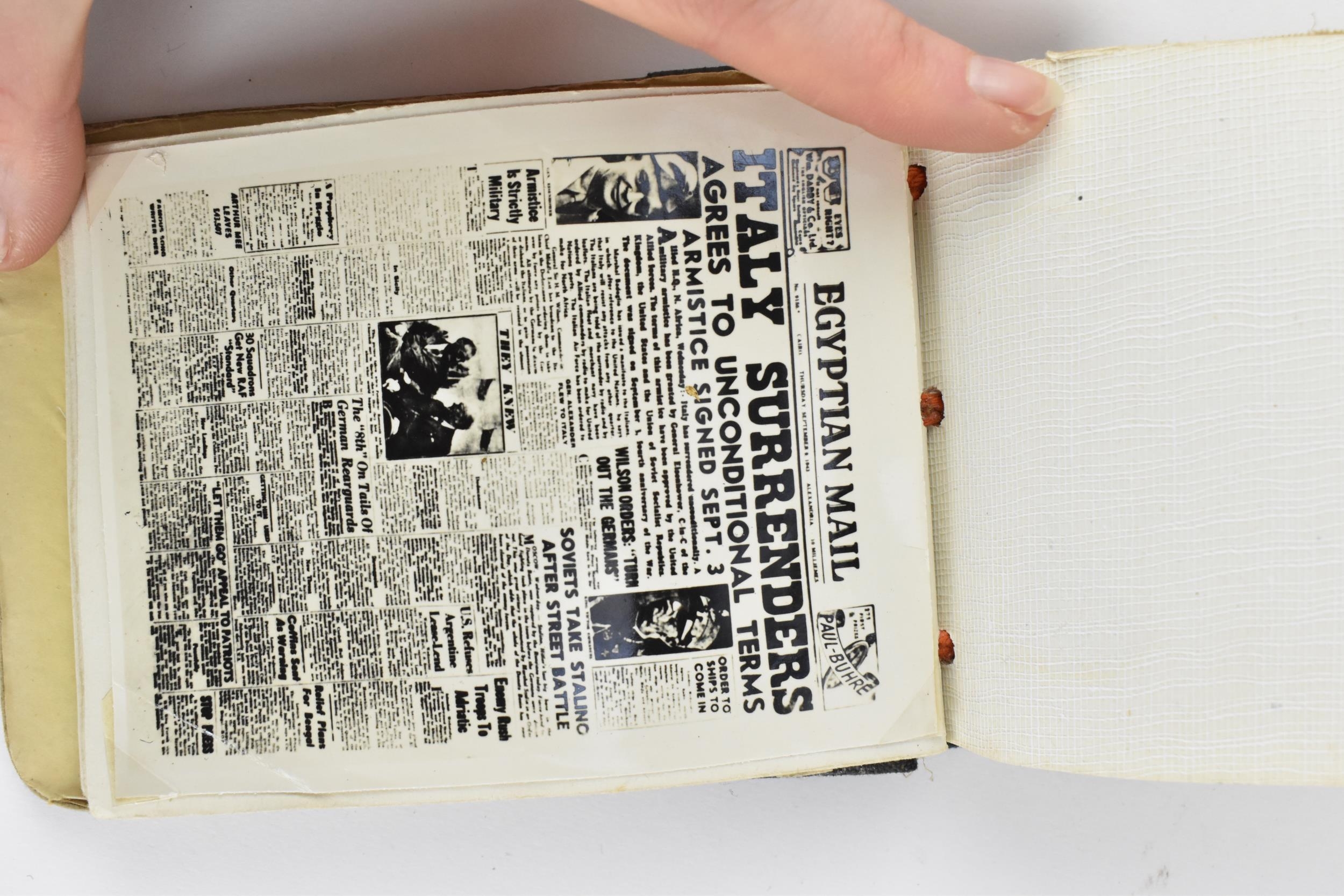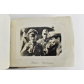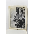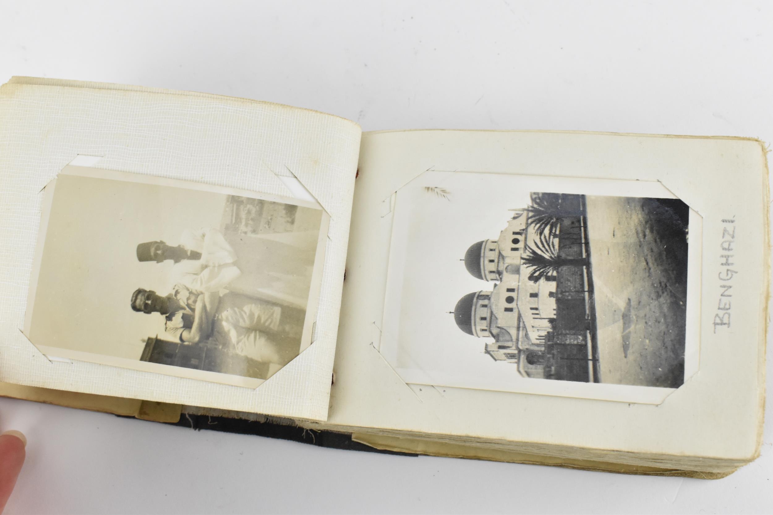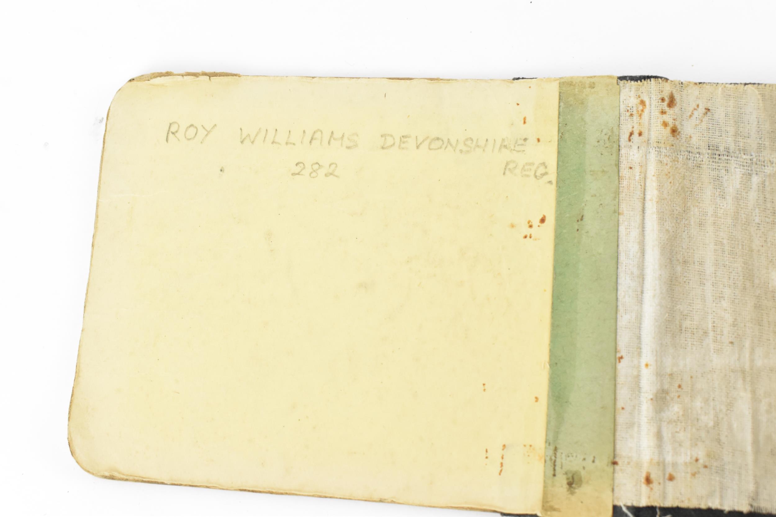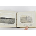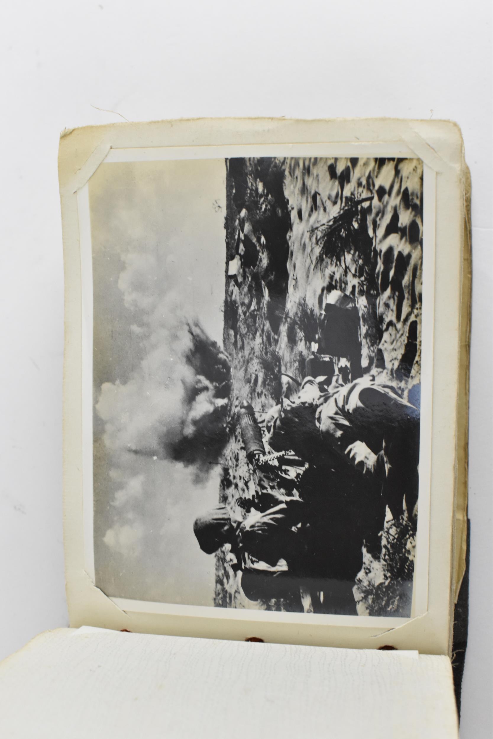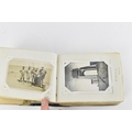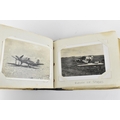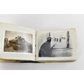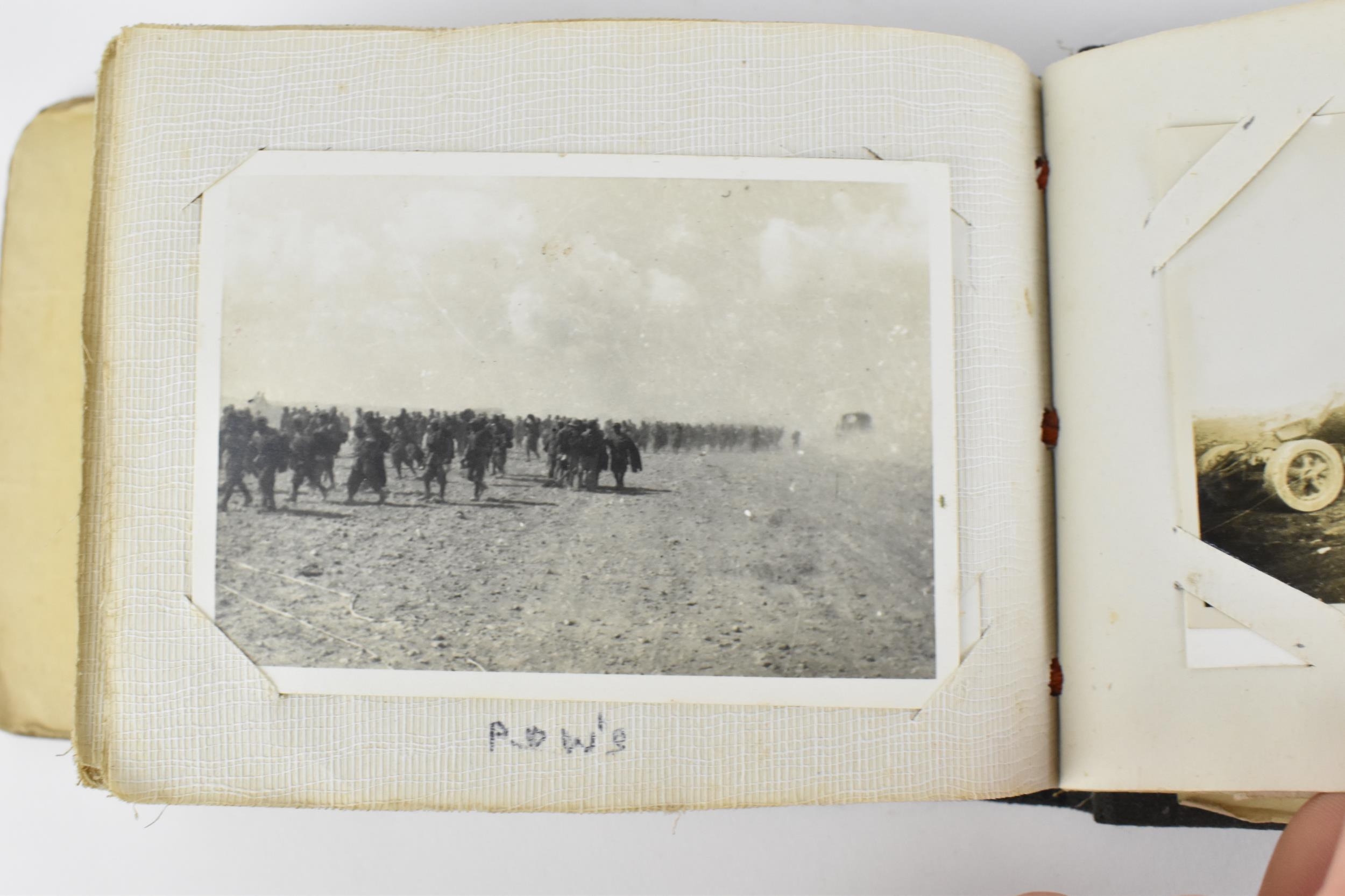 A World War II photograph album, belonging to Mr. Roy Williams from the Devonshire Regiment, containing photographs of Winston Churchill speaking to soldiers, one annotated 'Winnie up the blue', and photographs of camps, soldiers, battle zone, ennemi planes, General Erwin Rommel, prisoners of war, views etc