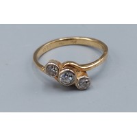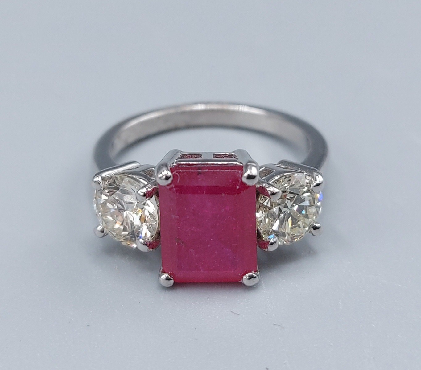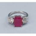A Platinum three stone ring set with a central recangular Ruby flanked by Diamonds, claw set, 5.6gms, ring size K