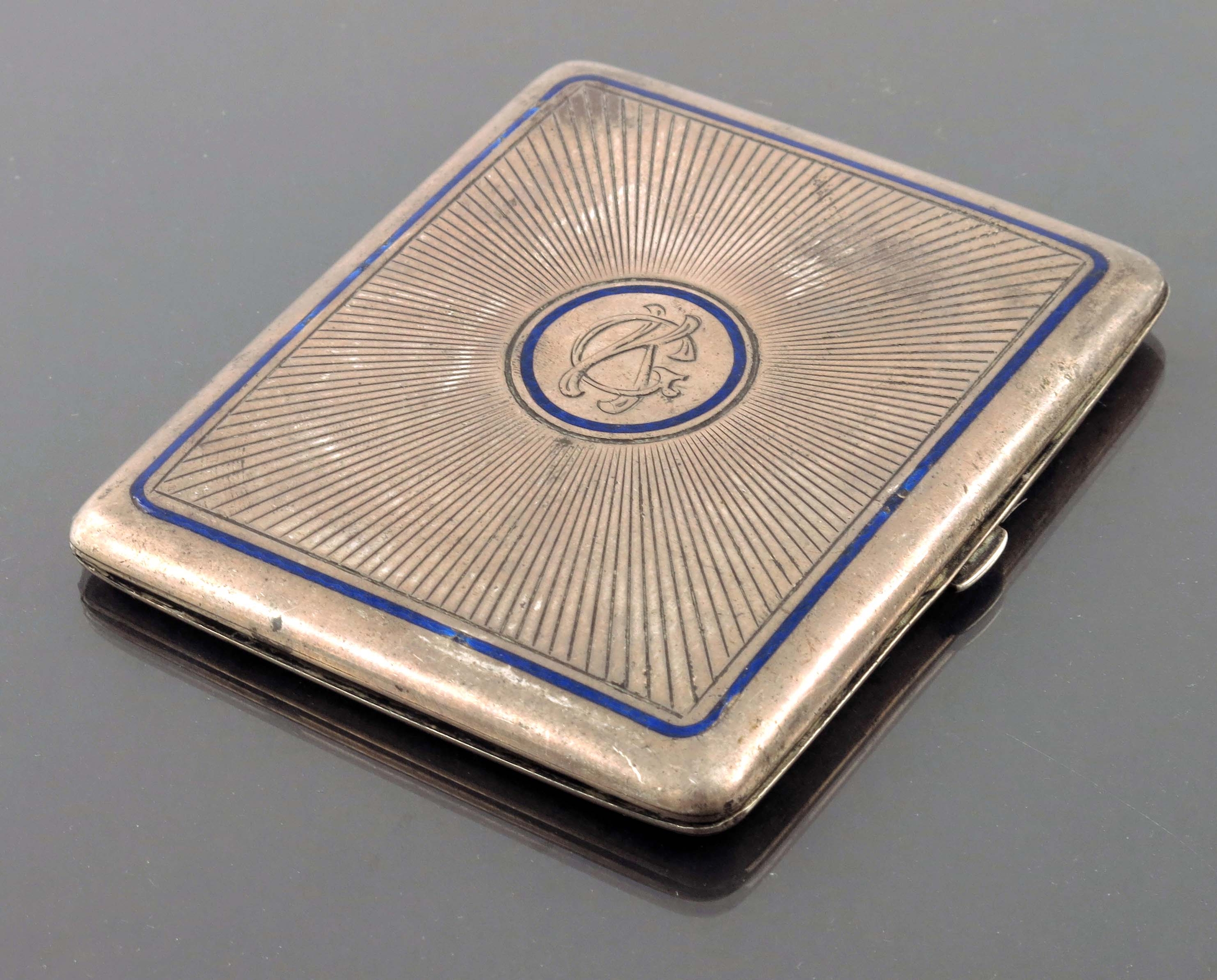 An Austrian silver and enamelled cigarette case, Lippa and Co., Vienna circa 1900, rectangular form engraved with starburst design and blue enamel bands, 9cm x 8cm, 4.19ozt
