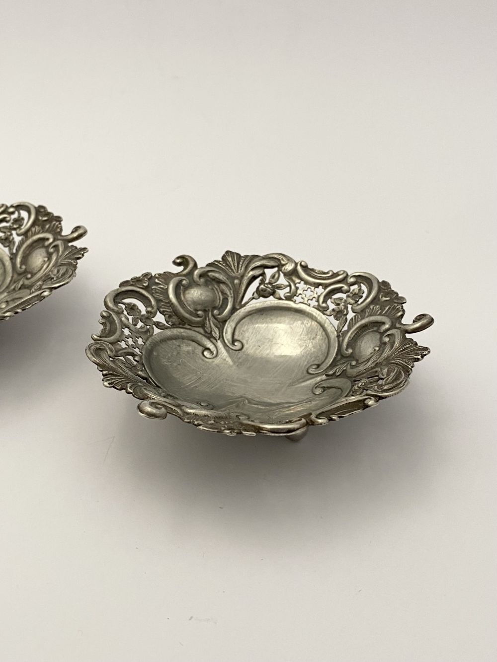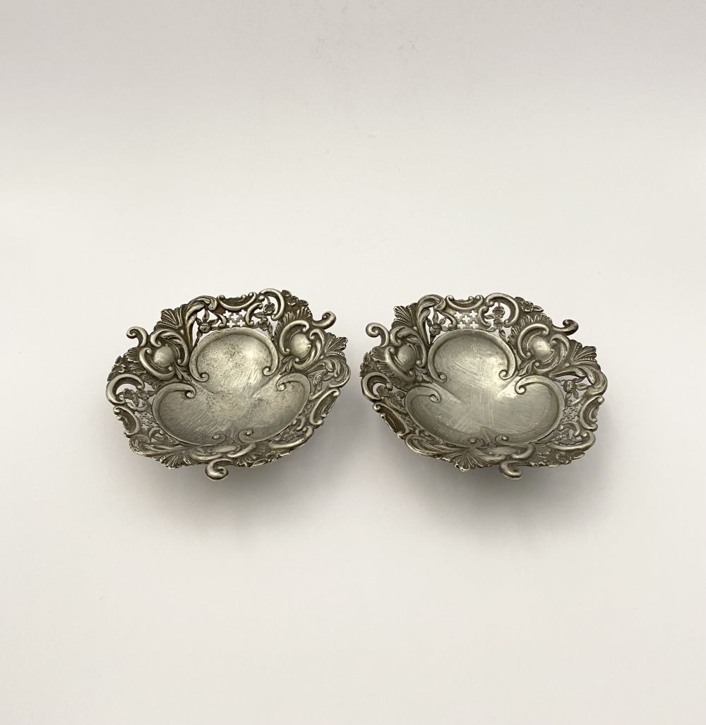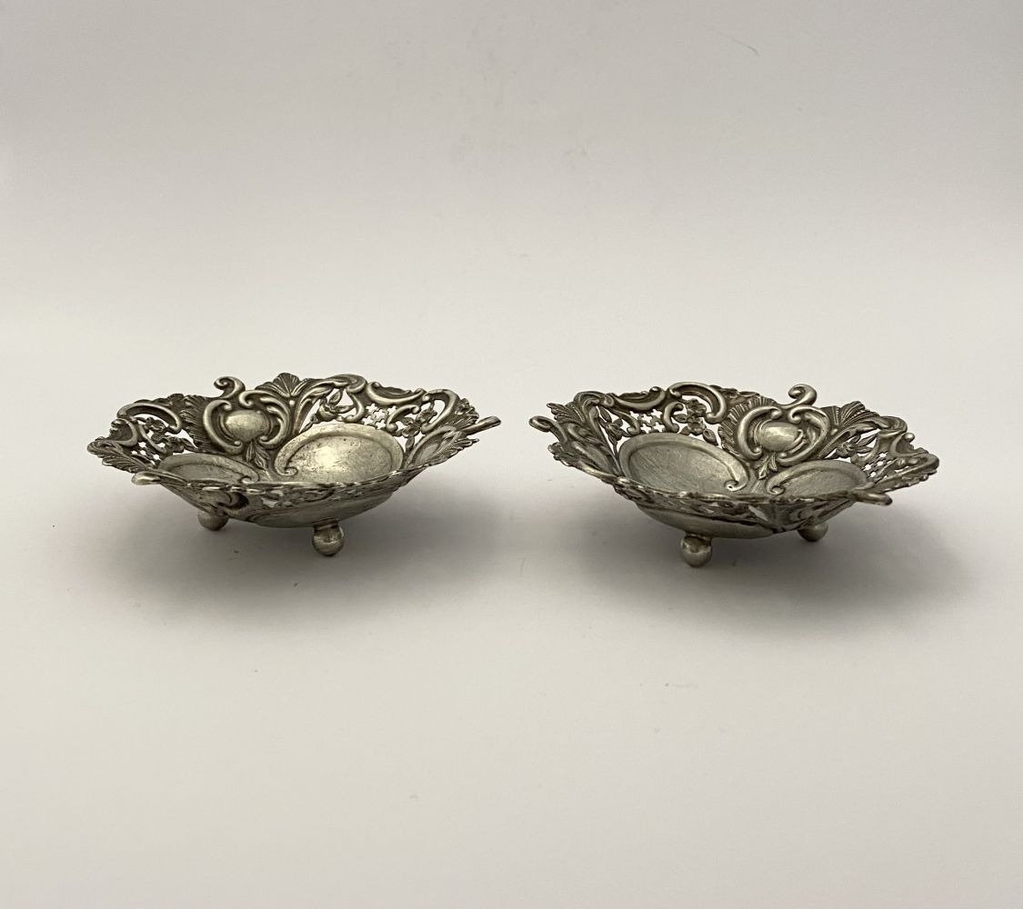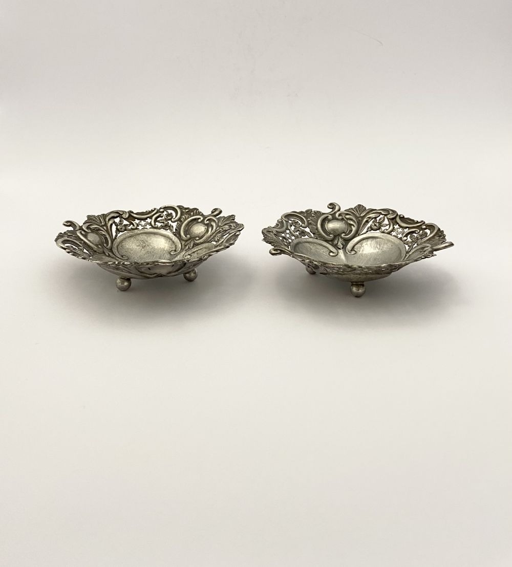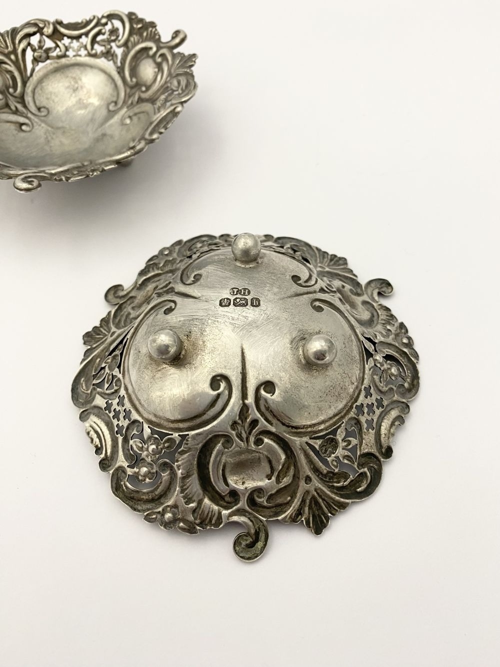 A PAIR OF VICTORIAN SILVER BONBON DISHES, by Sibray, Hall & Co (Job Frank Hall), Fitzwalter Works, St Mary's Road, Sheffield c.1894. with trefoil shape to centre surrounded by decorative openwork sides, raised on three ball feet. Nice clear hallmarks to underside. Dimensions: 9.3cm diameter x 2.8cm high approx. Weight: 2ozt approx.