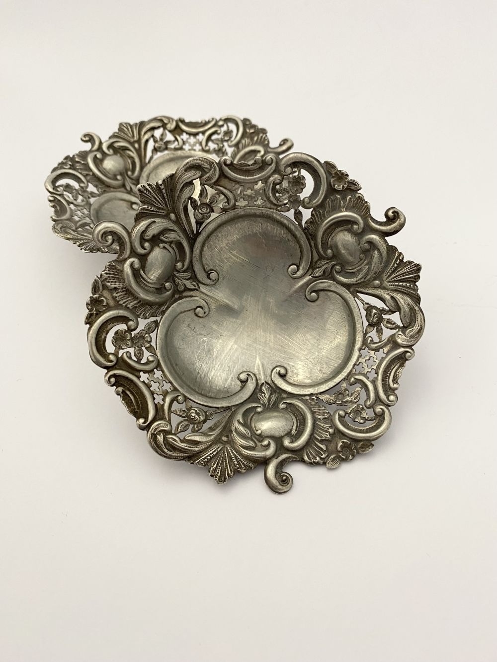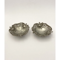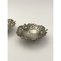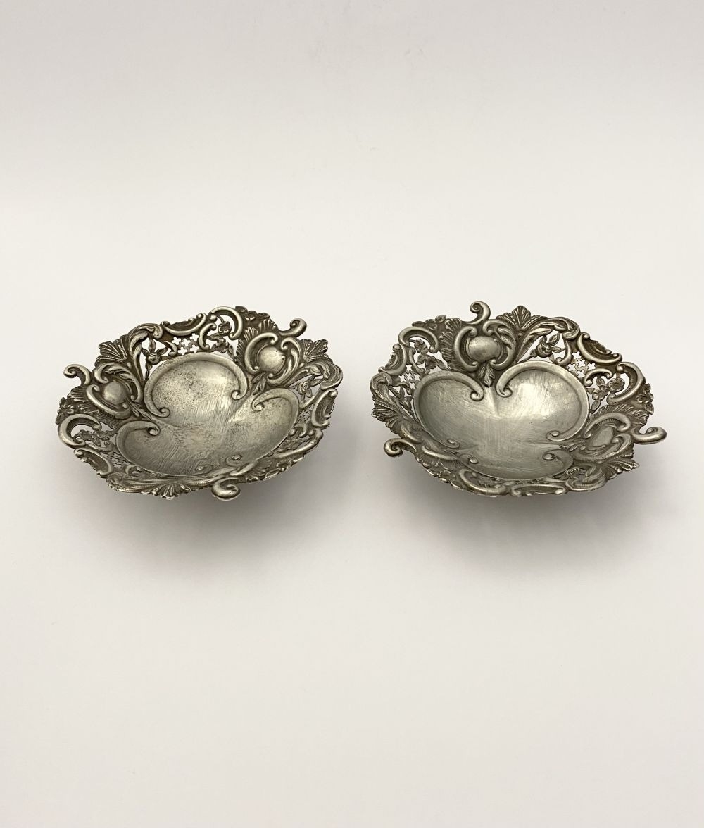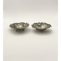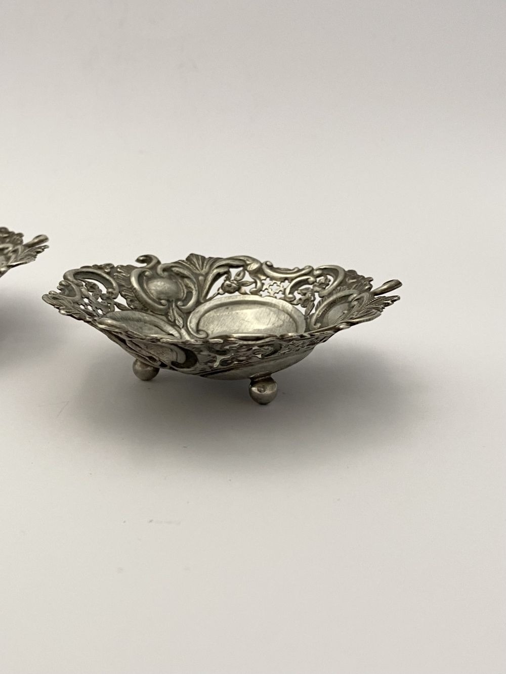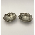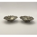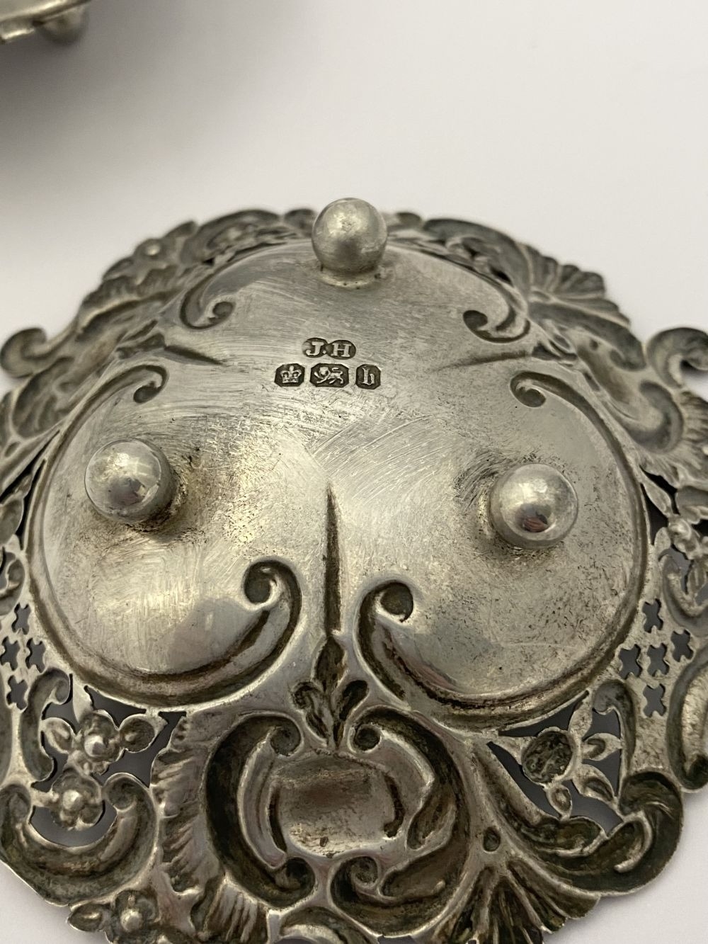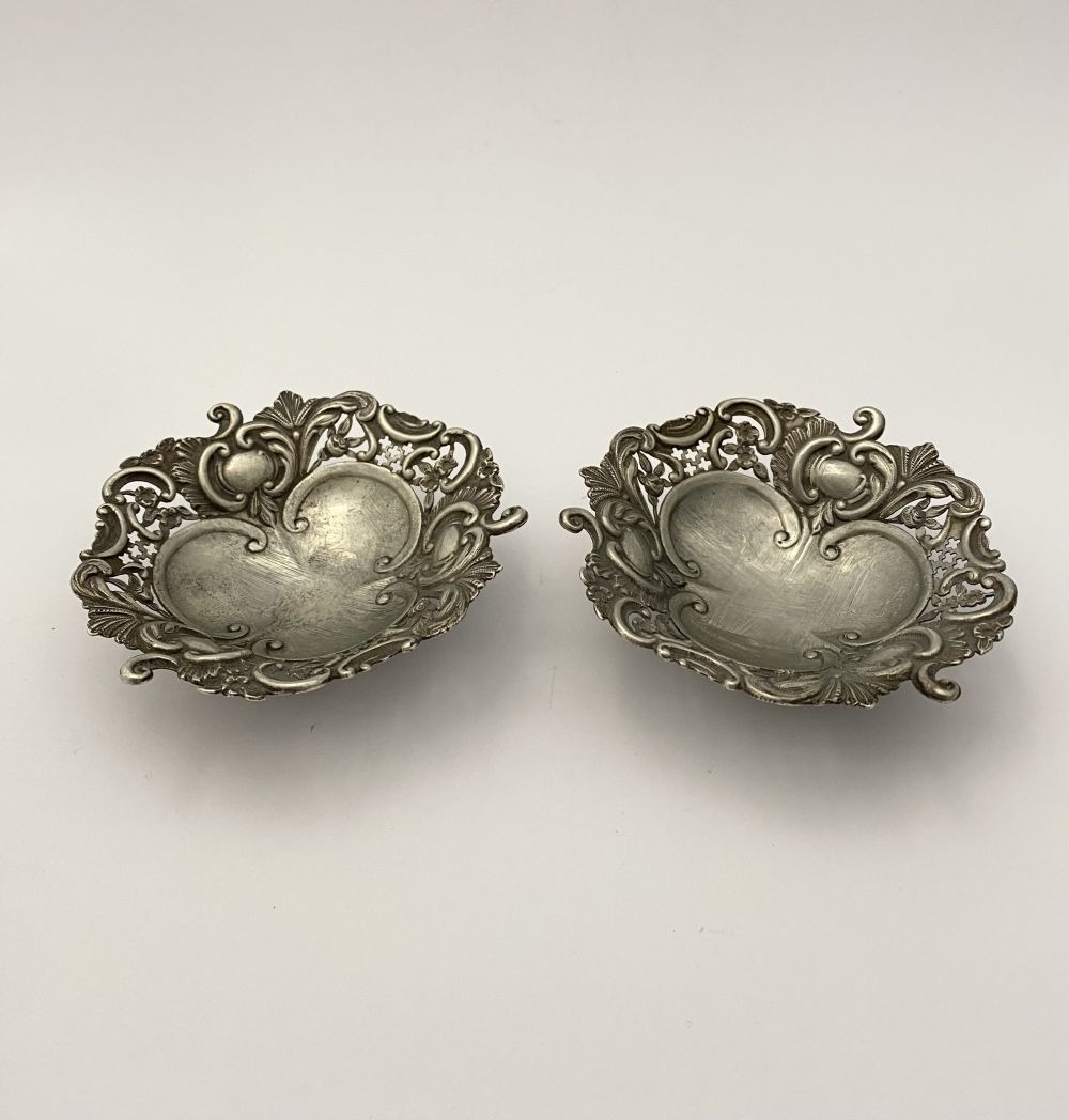 A PAIR OF VICTORIAN SILVER BONBON DISHES, by Sibray, Hall & Co (Job Frank Hall), Fitzwalter Works, St Mary's Road, Sheffield c.1894. with trefoil shape to centre surrounded by decorative openwork sides, raised on three ball feet. Nice clear hallmarks to underside. Dimensions: 9.3cm diameter x 2.8cm high approx. Weight: 2ozt approx.