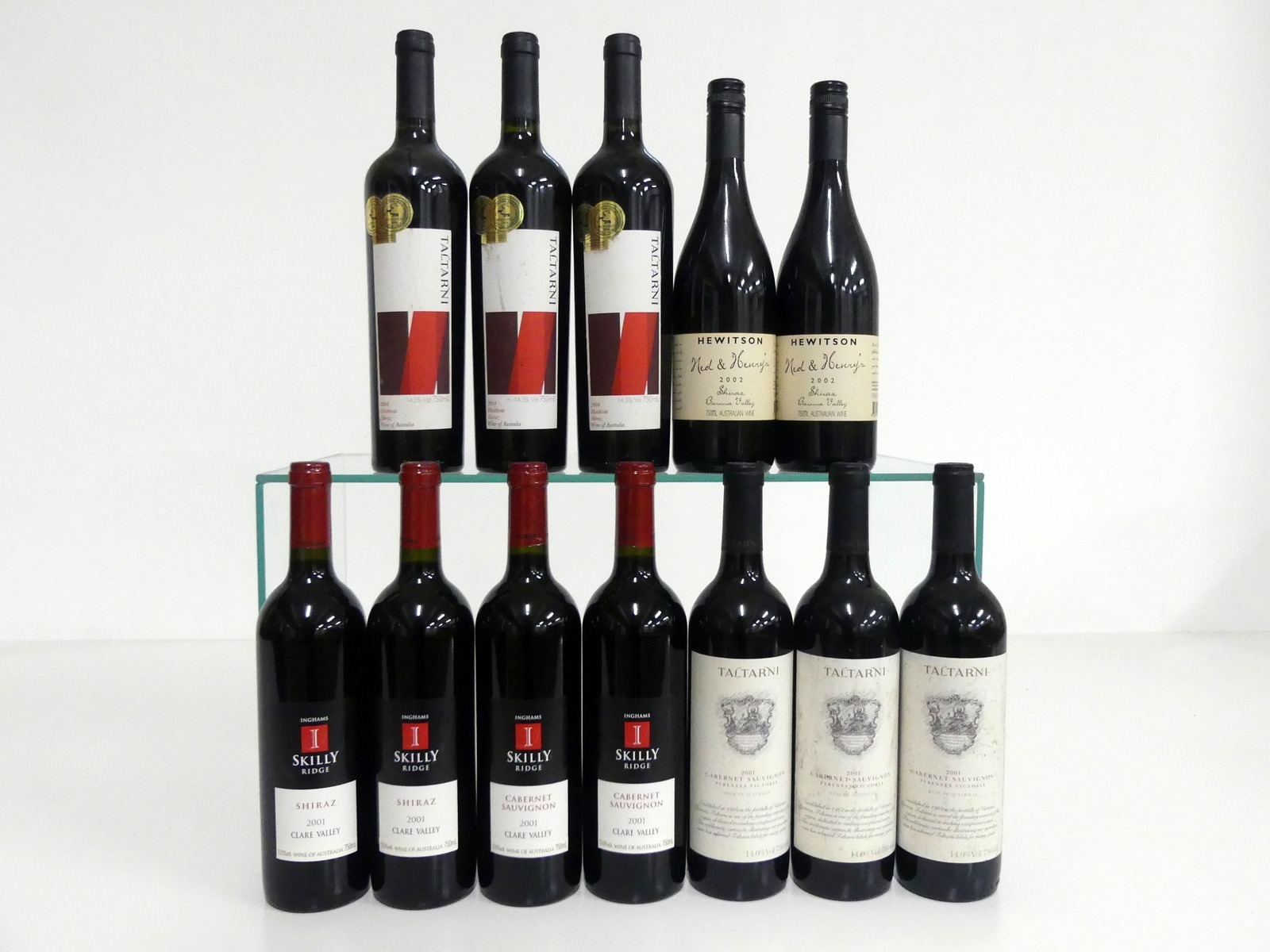 2 bts Inghams Skilly Ridge Shiraz 2001 Clare Valley i.n 2 bts Inghams Skilly Ridge Cabernet Sauvignon 2001 Clare Valley i.n 3 bts Taltarni Cabernet Sauvignon Pyrenees 2001 Victoria hf/i.n, bs 3 bts Taltarni Heathcote Shiraz 2004 i.n, sl bs 2 bts Hewitson Ned & Henrys Shiraz 2002 Barossa Valley hf, vsl bs Above 12 bottles