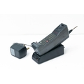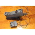 A retro Motorola 8500X early mobile phone, with charging dock and mains adaptor, rubber perishing to top of aerial.