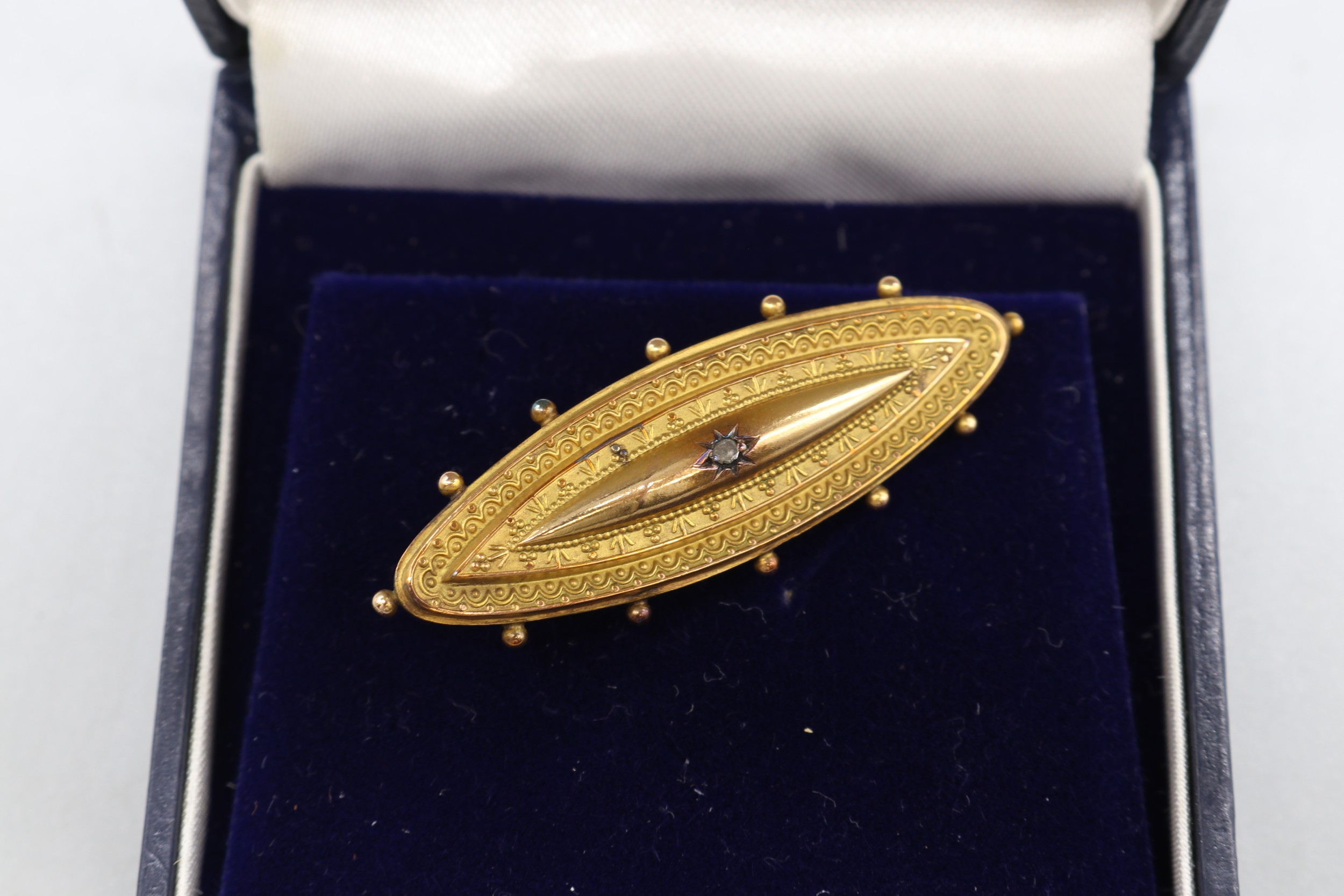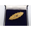Stamped 9 yellow metal marquise shape bar mourning brooch, with a memento mori glazed reverse and a small rough-cut diamond to the centre. weight 3.14g very good condition memento mori window unused