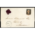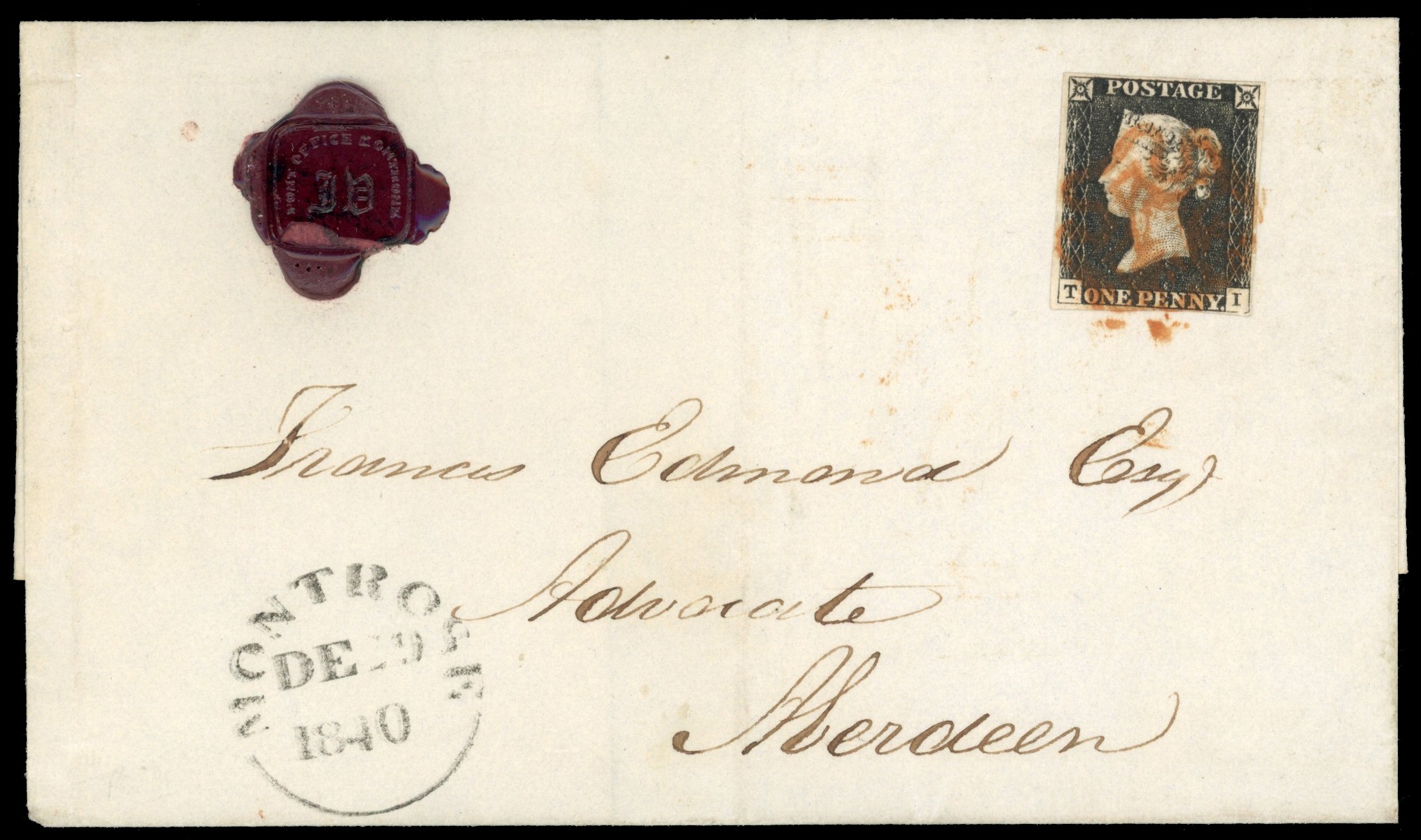 1840 1d grey-black, Pl. 3 (TI), with four close to good margins, on wrapper from Montrose to Aberdeen, tied by red MC, with Montrose cds at lower left for DE 29 and bearing a â??Post Office Montrose/JBâ?? wax seal above. Tiny defect to the lower right corner of the adhesive and central filing fold, still a fresh looking and unusual cover. S