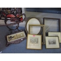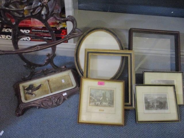 An early 20th century print of Hadley Church, two other antiquarian prints and three picture frames, together with an Art Nouveau stick stand A/F