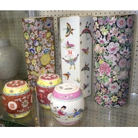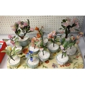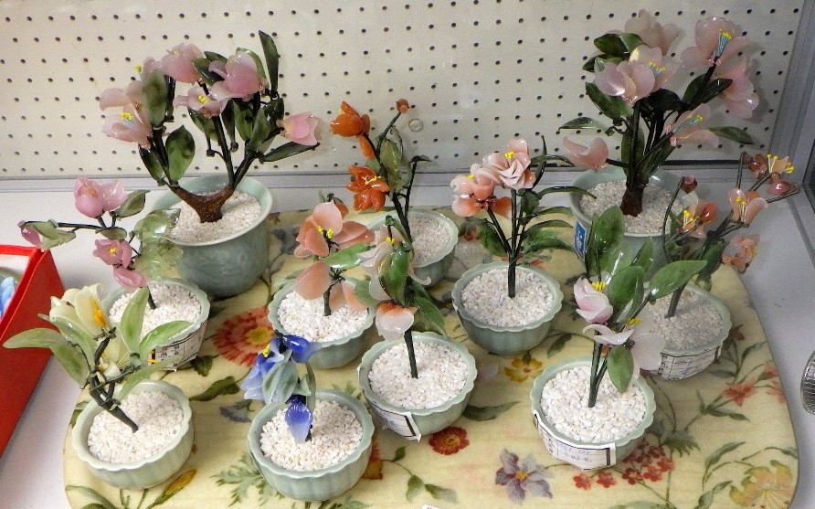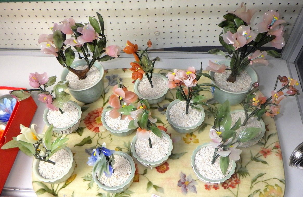 A group of Oriental glass bonsai trees in celadon pots, 10-20cm tall