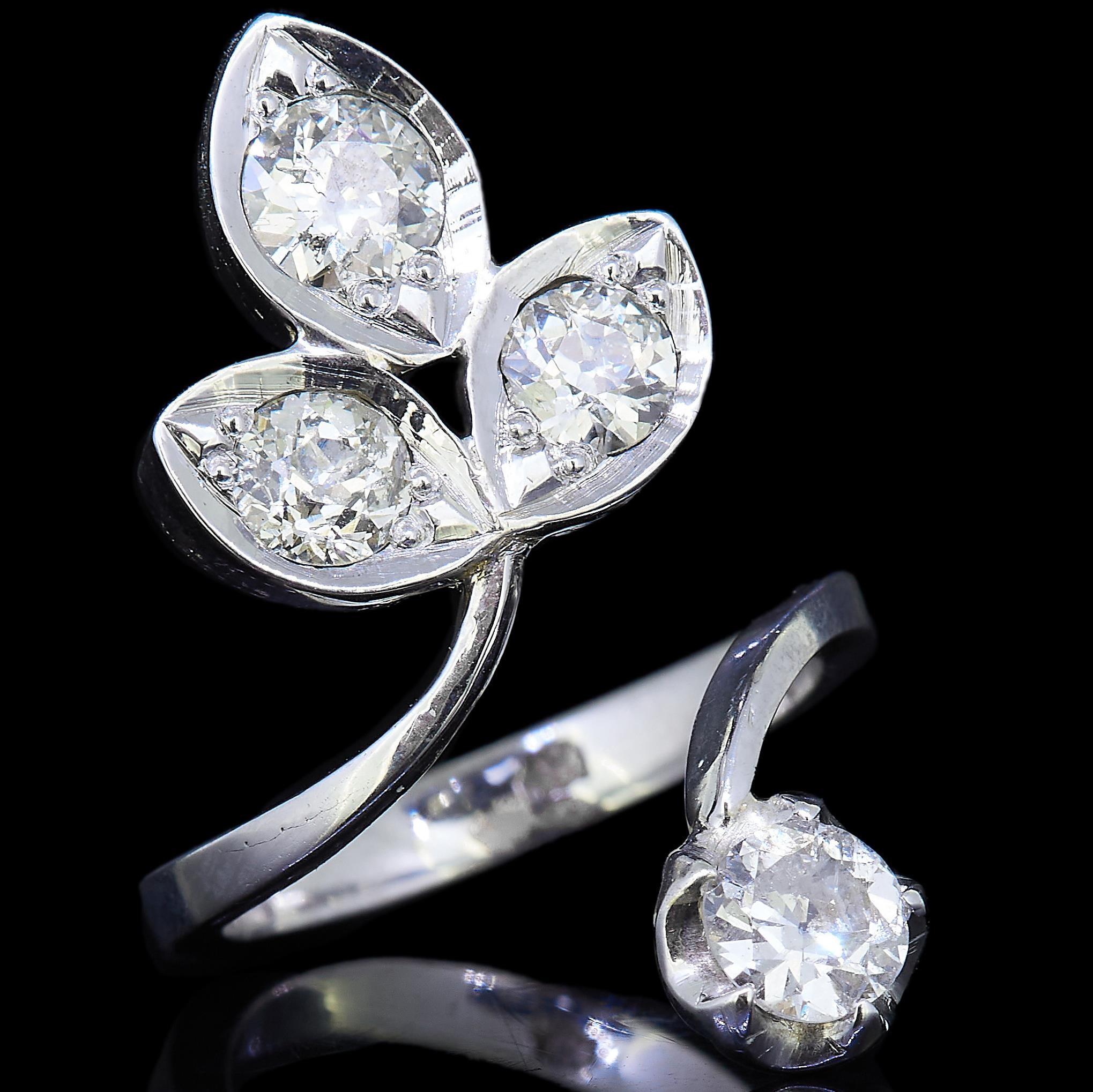 DIAMOND FLORAL TWIST RING, the floral trefoil shaped top set with 3 diamonds, and a single diamond to the bottom twist. Diamonds totalling approx. 1.65 ct. Size J. 4.9 grams.