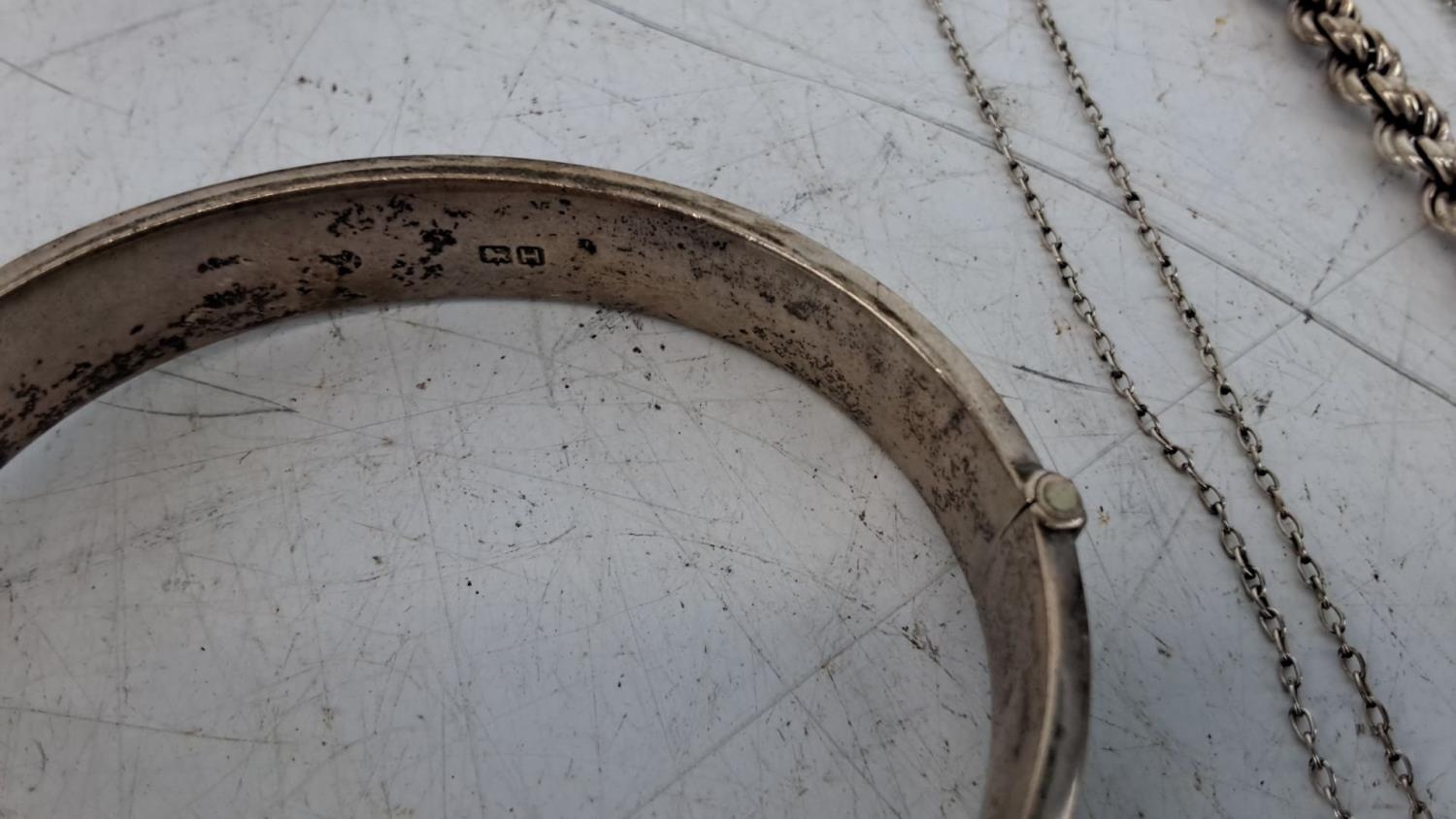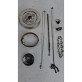 Assorted Sterling Silver jewellery including bangle with hallmarks, necklaces, rings, bracelets, and more. Features detailed craftsmanship and various designs.