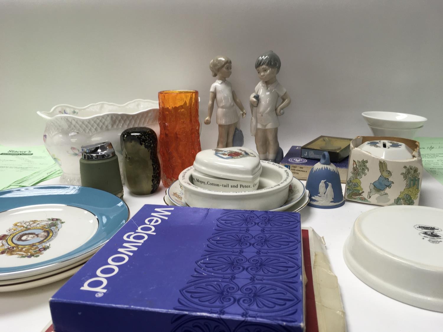 A collection of ceramics including Wedgwood together with a whitefriars vase and an owl paperweight.