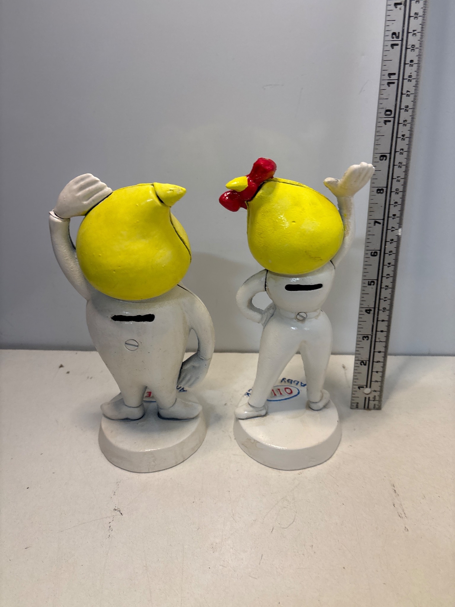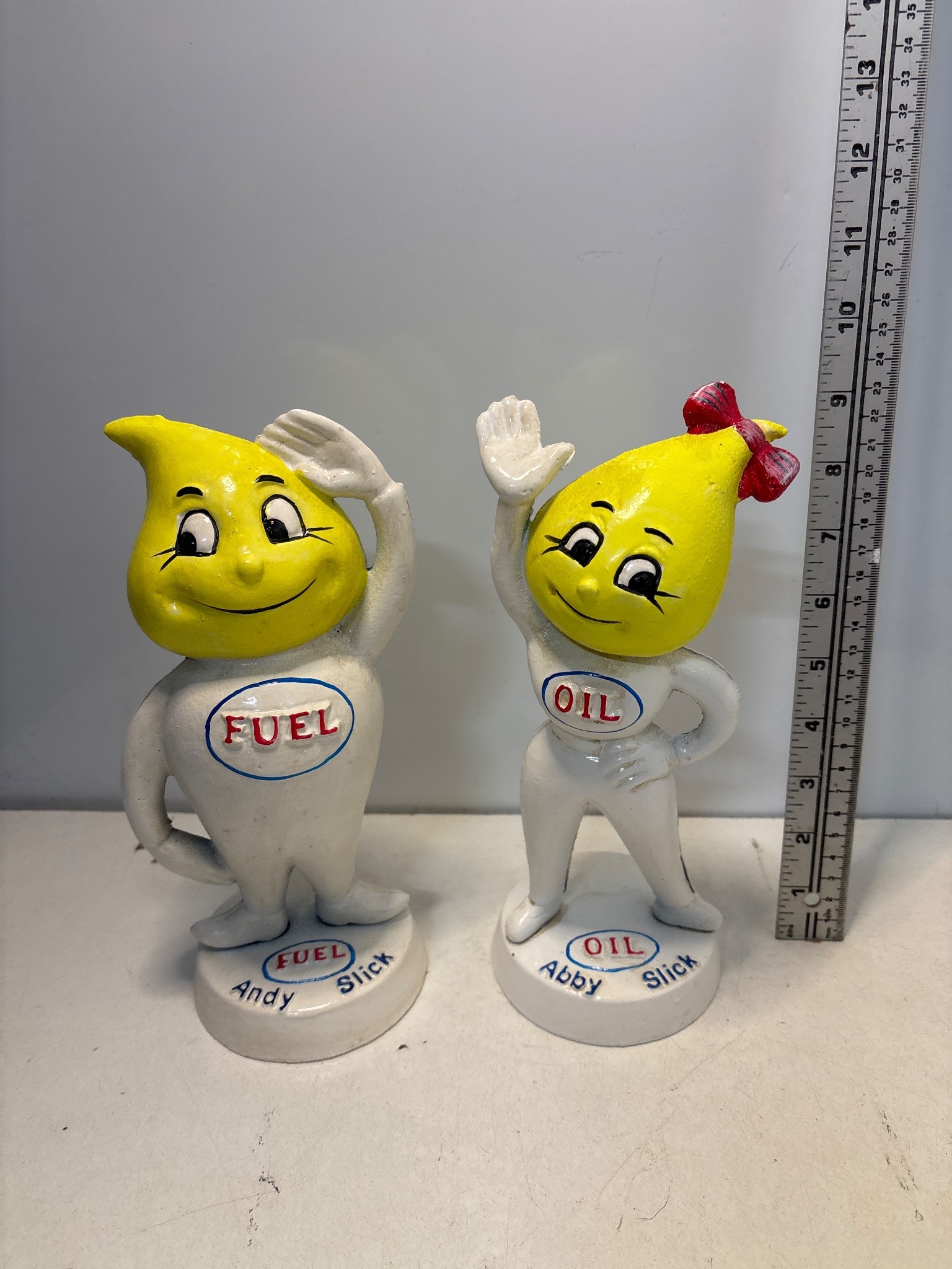 Andy and Slick fuel and oil mascot figures money box made of painted material, approximately 8 inches tall each, with slight wear.