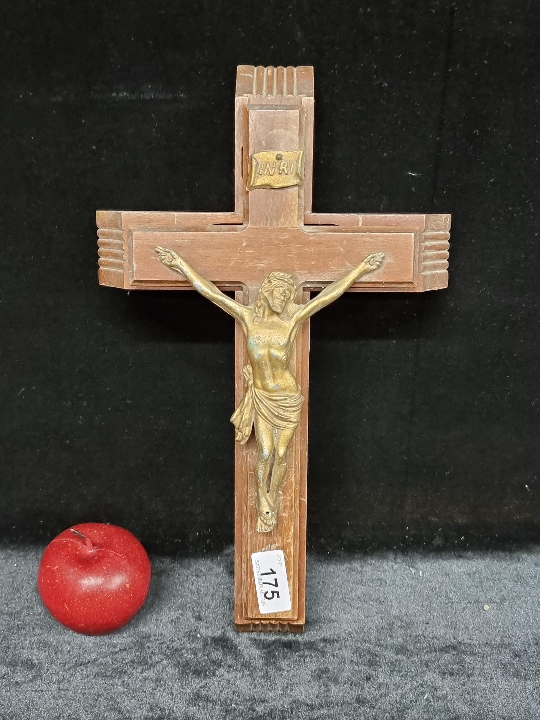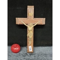 A large wooden sick call crucifix, these crucifix's are used by clergymen to administer the Sacrament of the Anointing of the sick and dying. The crucifix open to reveal a vessel to hold holy water and a space for two candles. Interesting item.
